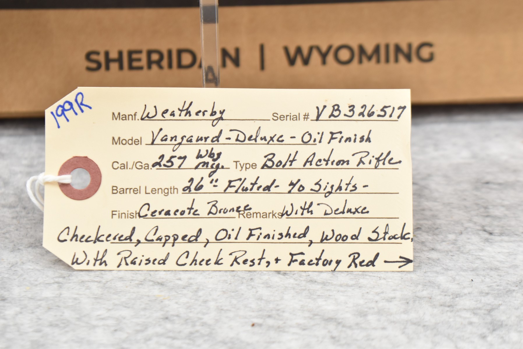 199R. Weatherby – Mod. Vanguard-Deluxe – 257 Wby. Mag. Cal. Bolt Action Rifle – w/26” Fluted Barrel (No Sights) – Ceracote Bronze Finish – w/Deluxe Checkered Capped Oil Finished Wood Stock w/Raised Cheek Piece w/Factory Butt Pad – Unfired w/Box, Manuals, Removable Muzzle Brake & Accessories