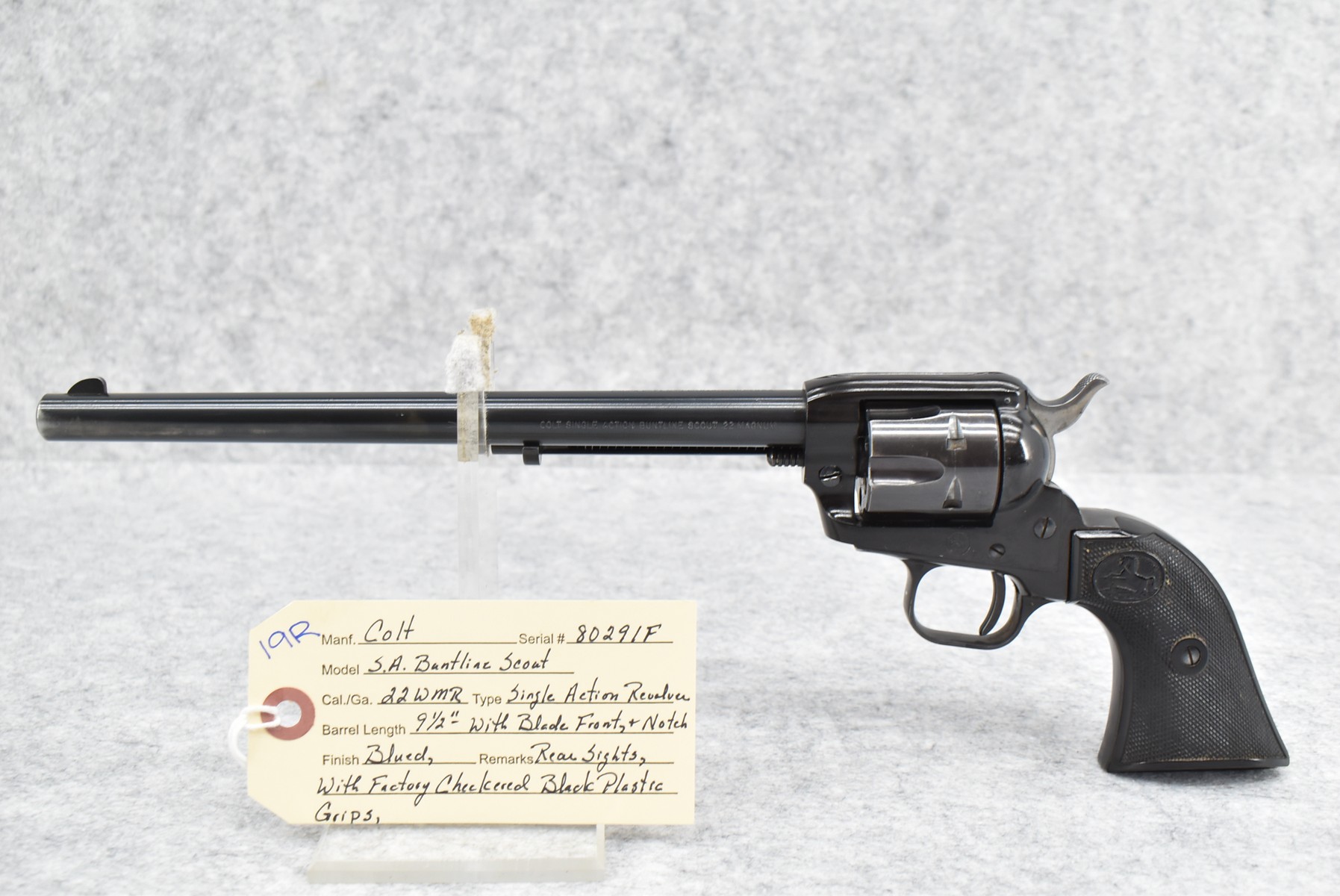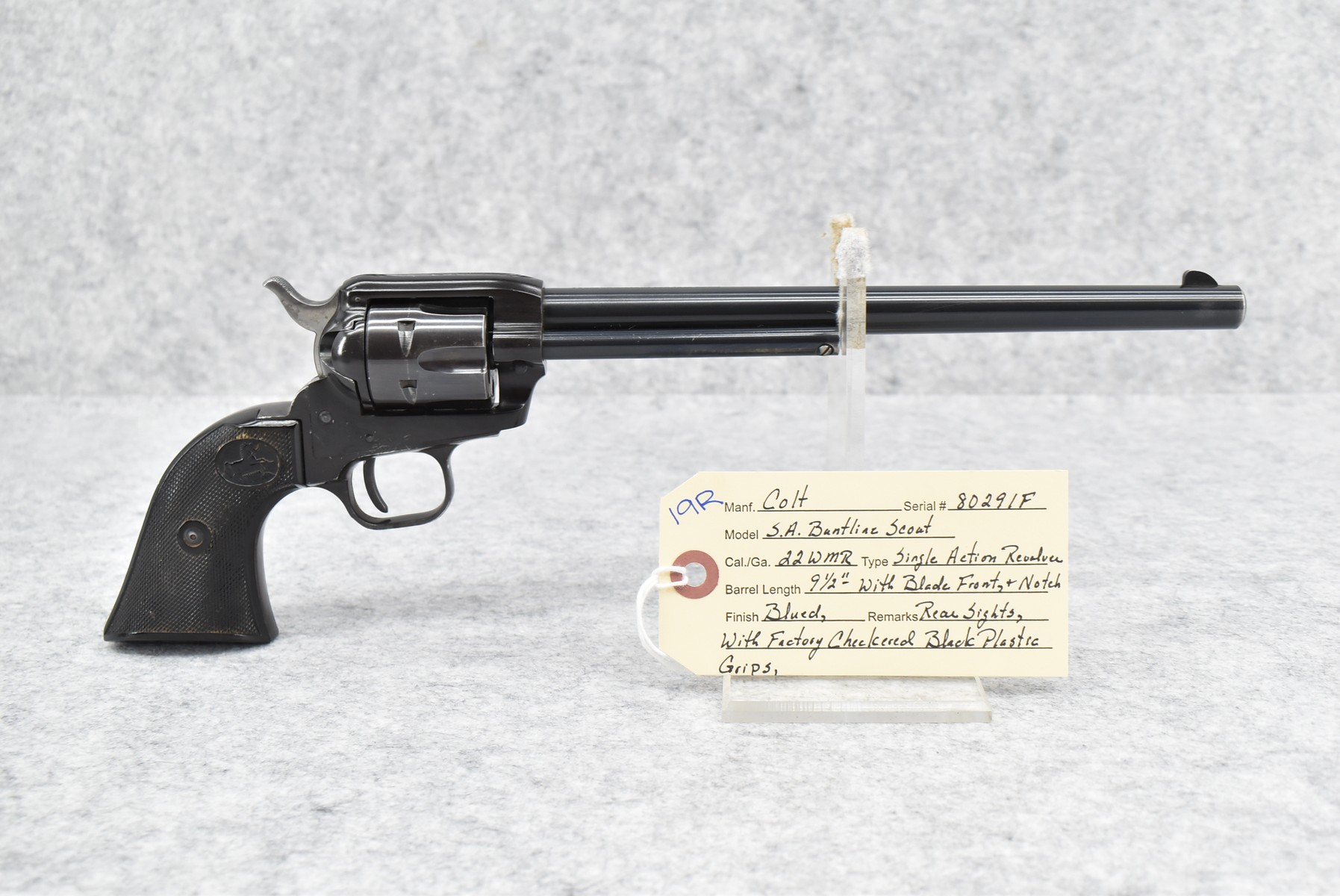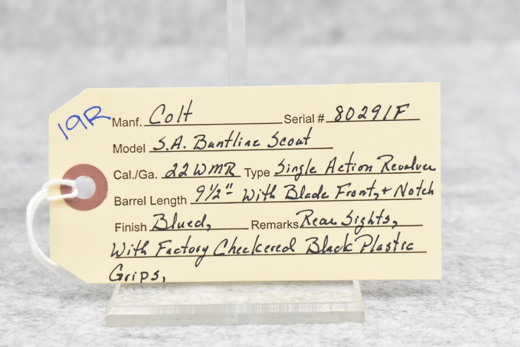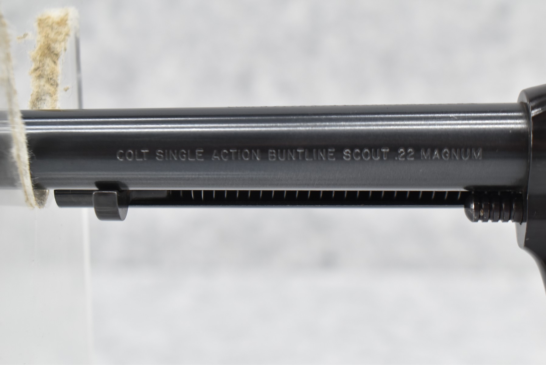 19R. Colt – Mod. Single Action Buntline Scout – 22 WMR Cal. Single Action Revolver – w/9 ½” Barrel w/Blade Front & Notch Rear Sights – Blued Finish – w/Factory Checkered Black Plastic Grips