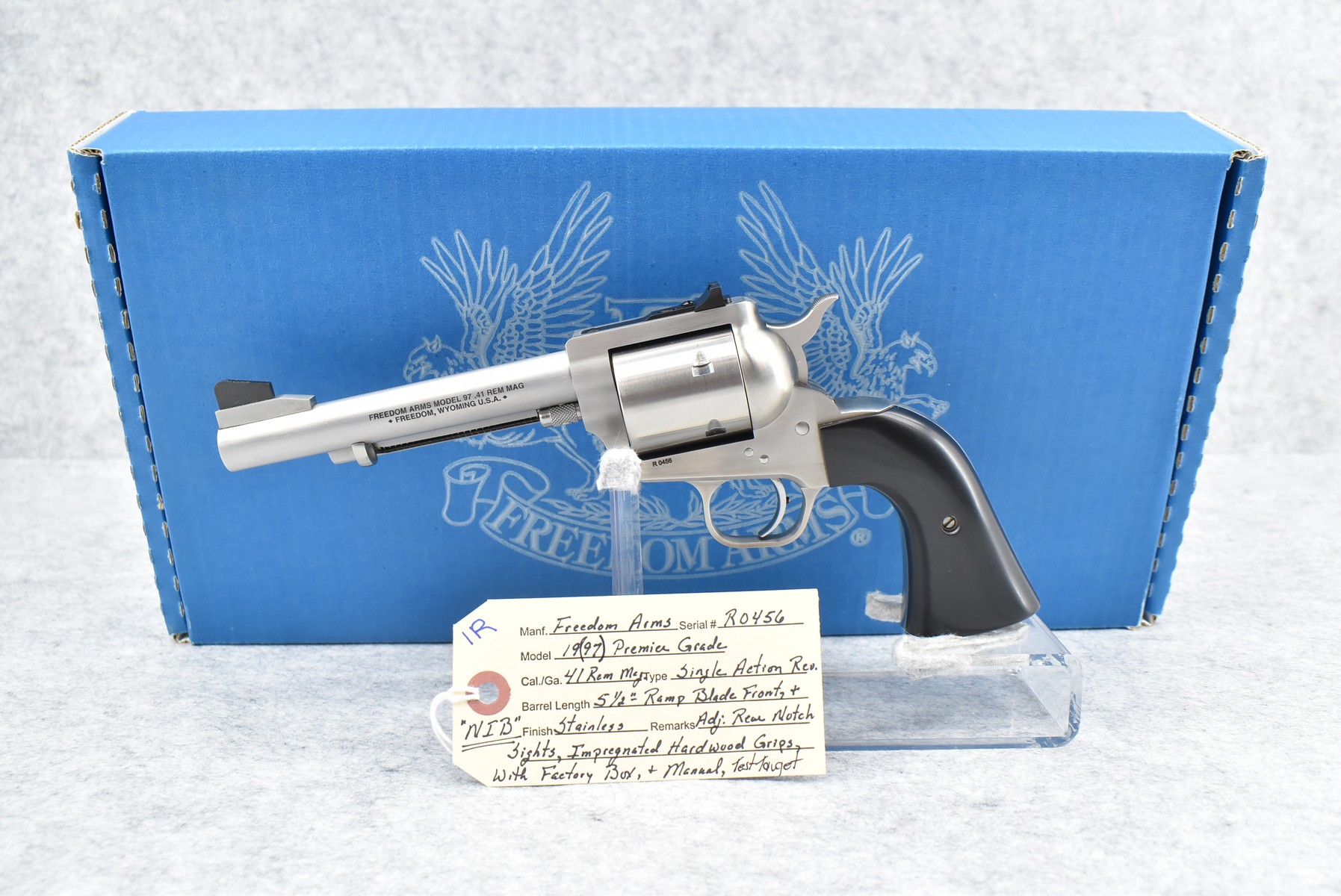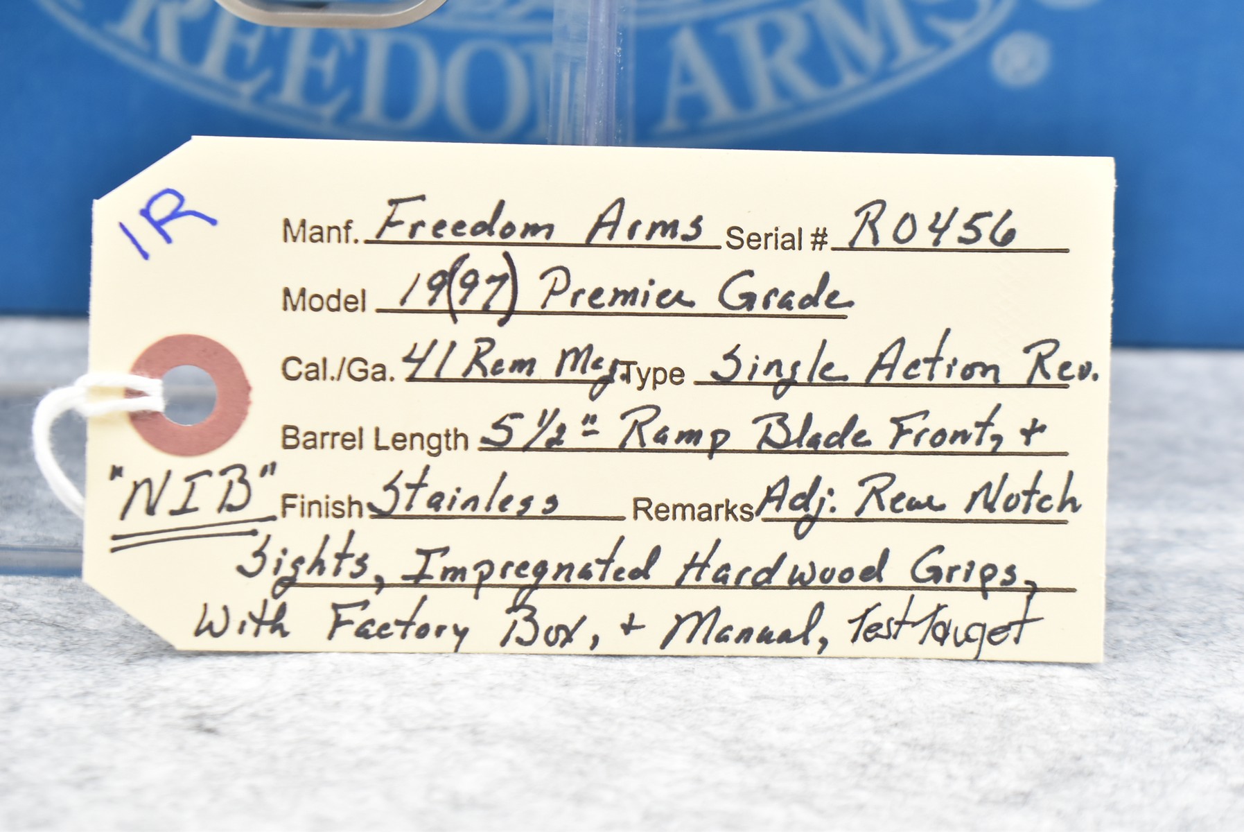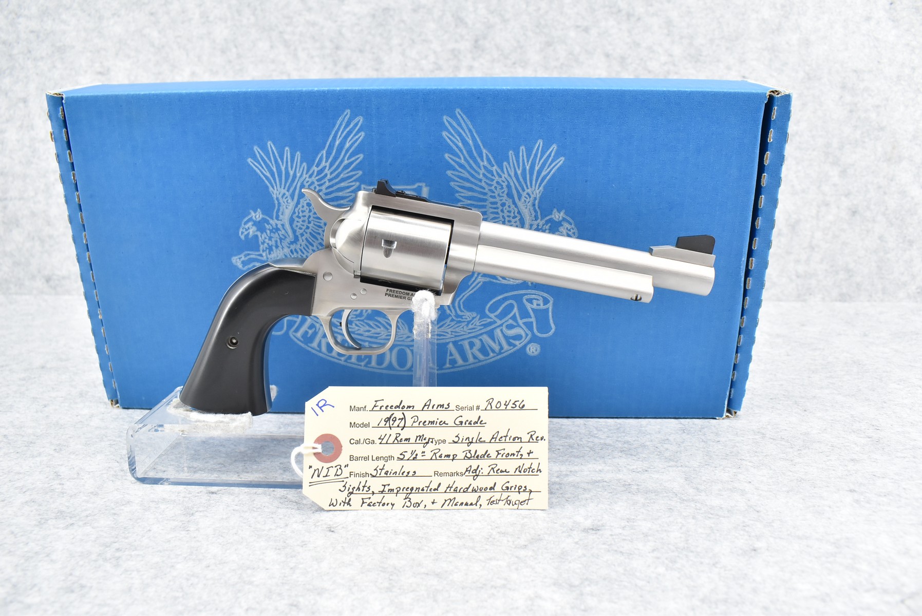 1R. Freedom Arms – Mod. 97 Premier Grade – 41 Rem. Mag. Cal. Single Action Revolver – w/5½” Barrel w/Ramp Blade Front Adjustable Rear Notch Sights – Stainless Finish – w/Black Smooth Hardwood Grips – w/Unfluted Cylinder – New in Factory Box w/Manual and Test Target