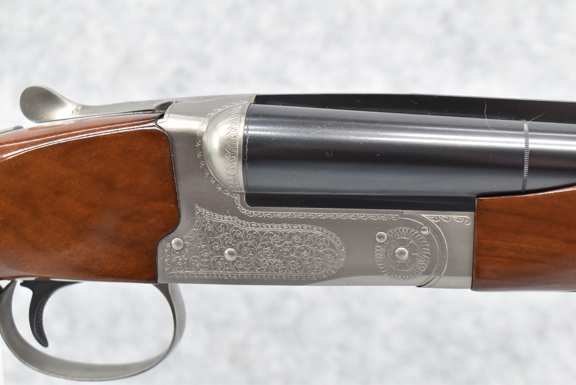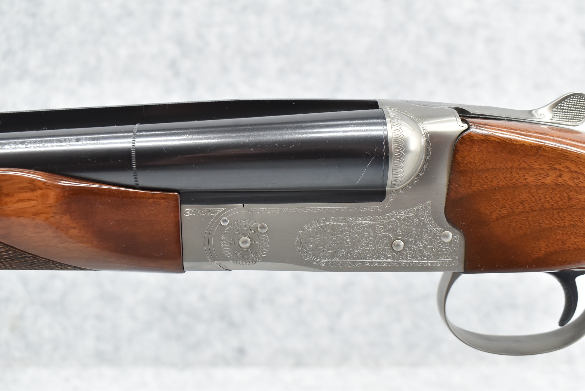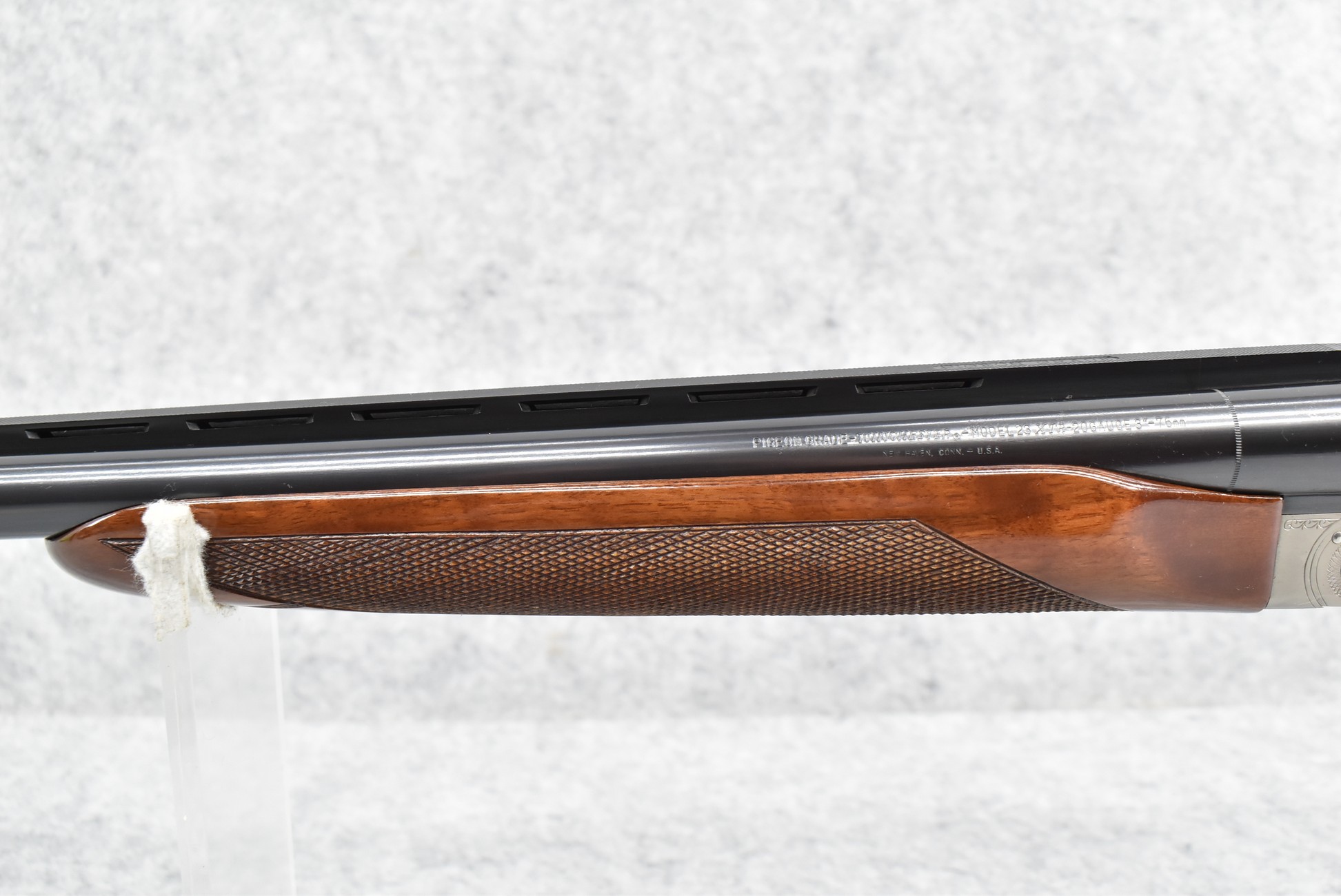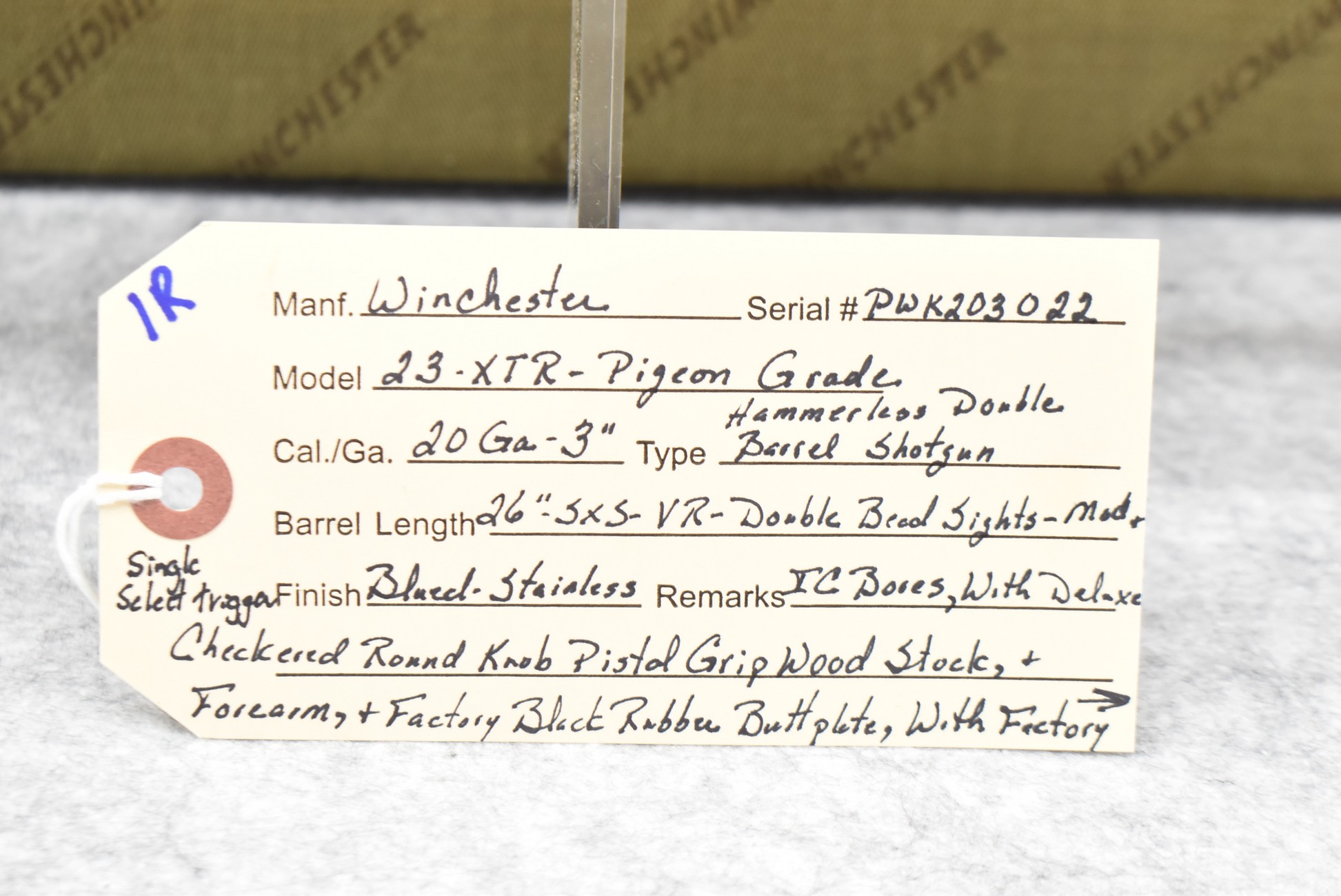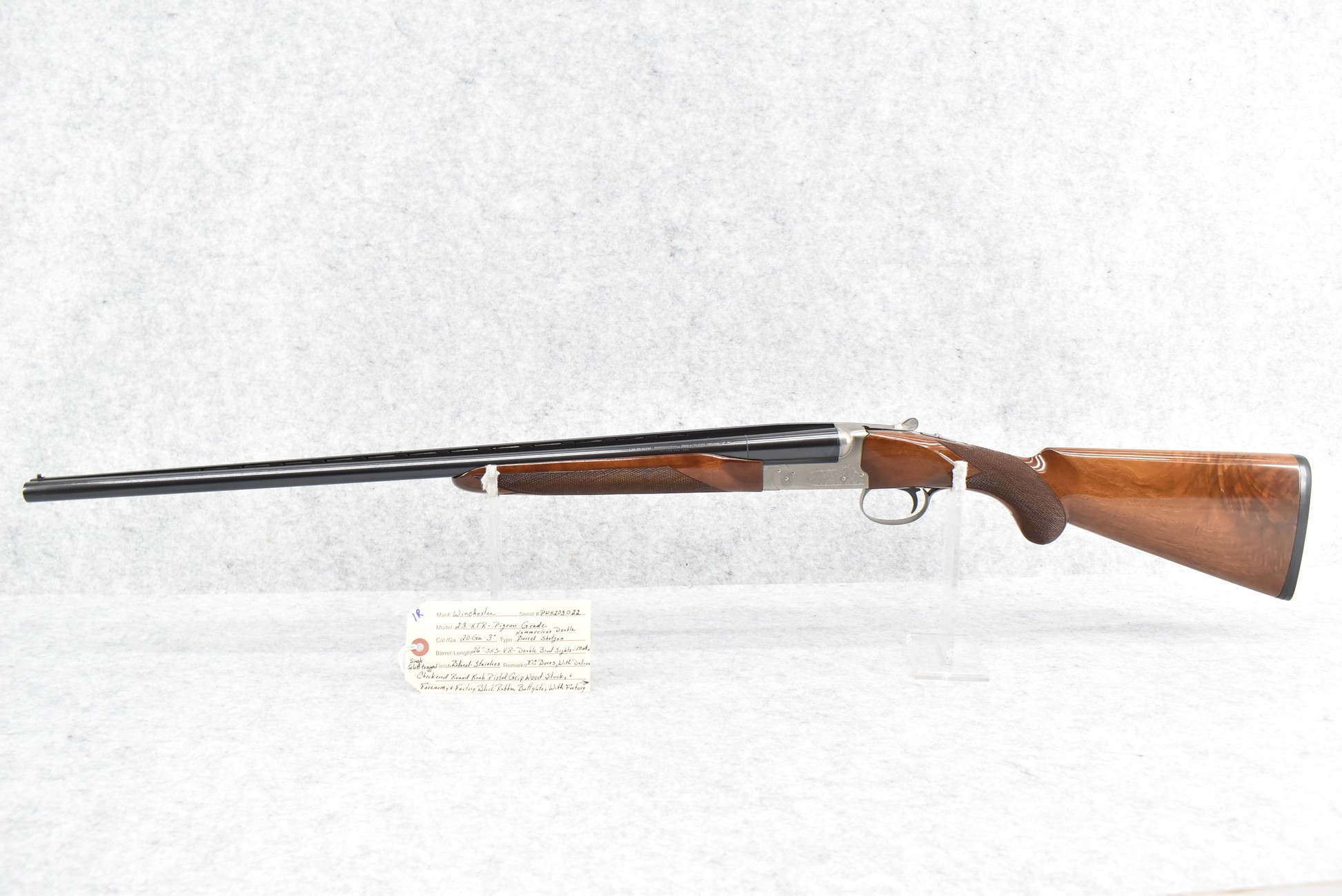 1R. Winchester – Mod. 23 XTR Pigeon Grade – 20ga. 3” Hammerless Double Barrel Shotgun – w/26” Mod./IC Choked Vent Rib Barrels w/Double Bead Sights – Blued/Stainless Finish – w/Deluxe Checkered Round Knob Pistol Grip Wood Butt Stocks w/Factory Butt Plate & Beavertail Forearm – w/Single Select Trigger – w/Factory Winchester Takedown Case