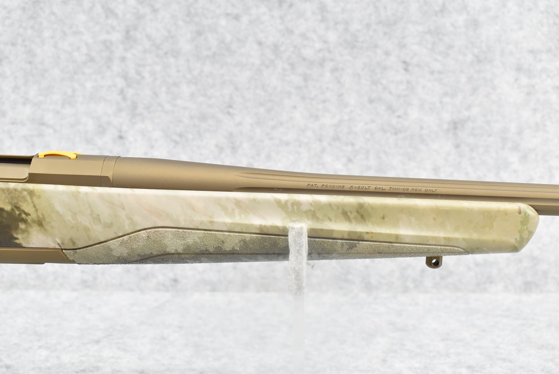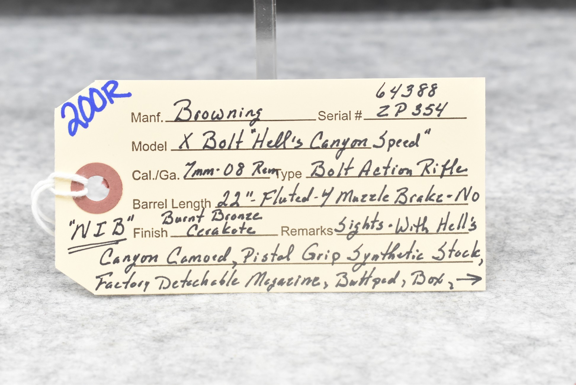 200R.     Browning – Mod. X Bolt – Hell’s Canyon Special – 7mm-08 Rem. Cal. Bolt Action Rifle – w/22” Fluted Barrel w/Muzzle Brake – Burnt Bronze Cerakote Finish – w/Hell’s Canyon Camoed Pistol Grip Synthetic Stock w/Factory Butt Pad – w/Factory Detachable Magazine – New w/Factory Box, Manual & Accessories
