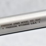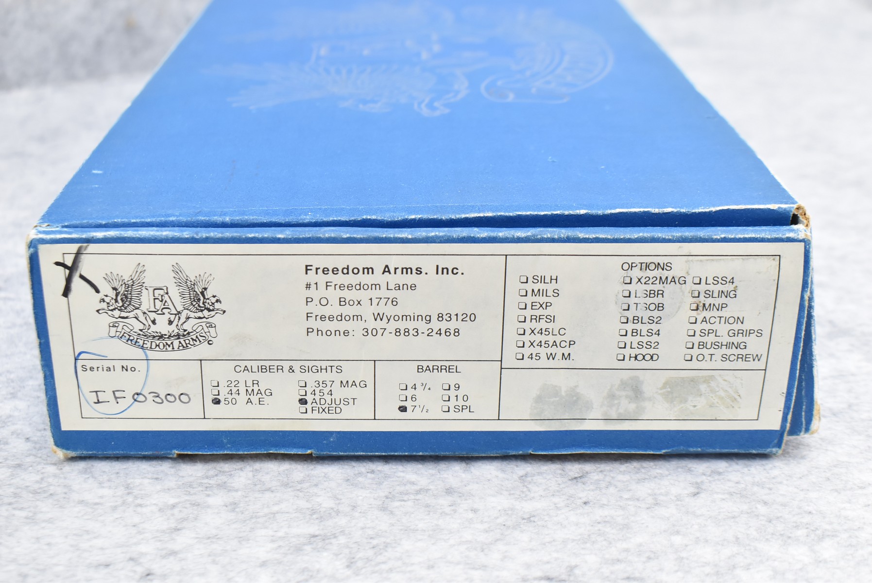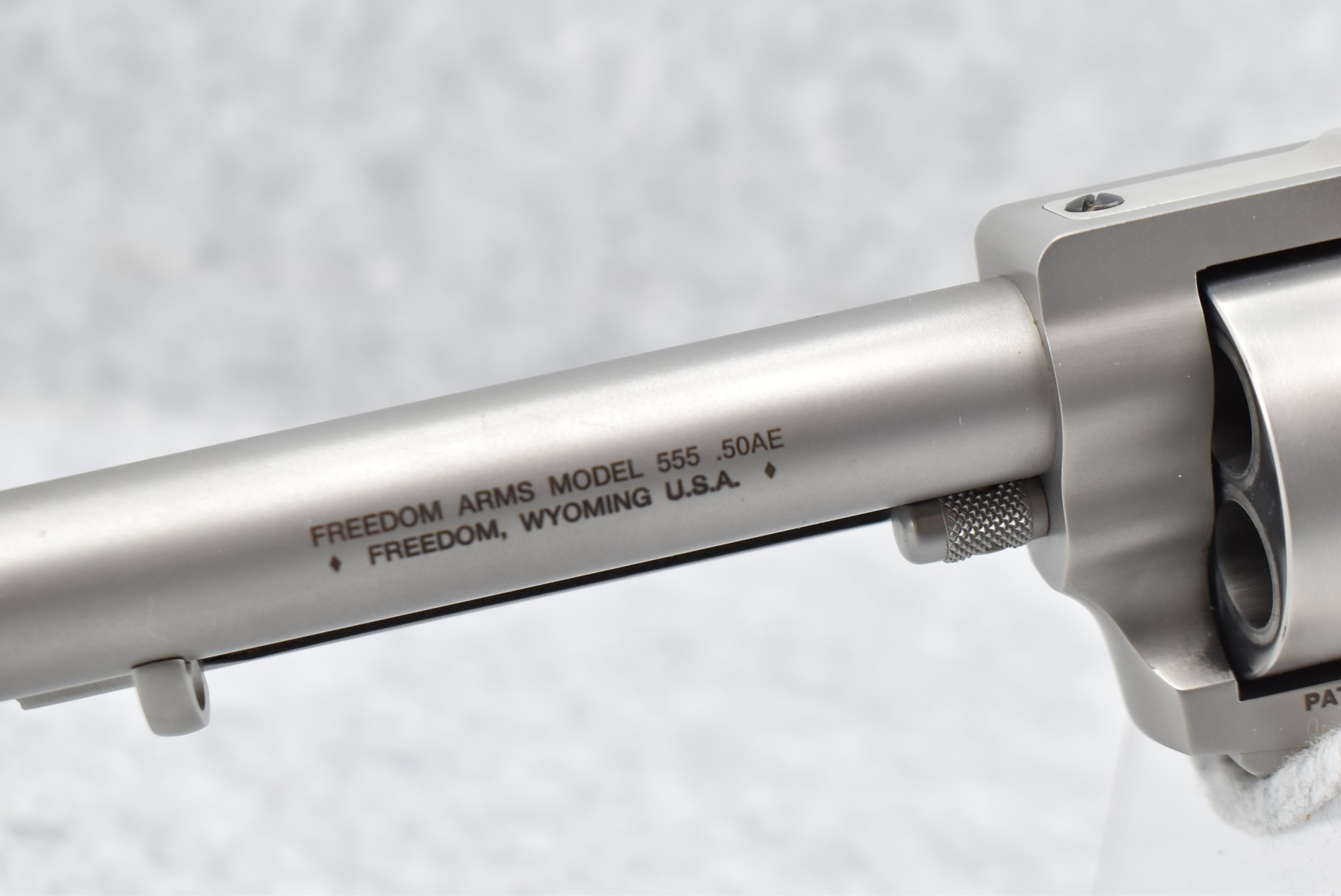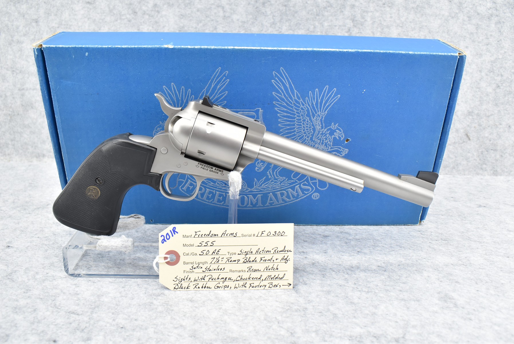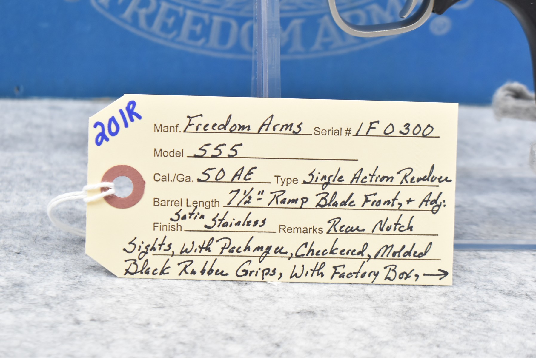 201R. Freedom Arms – Mod. 555 – 50 AE Cal. Single Action Revolver – w/5½” Barrel w/Ramp Blade Front and Adjustable Rear Notch Sights – Satin Stainless Finish – w/Pachmayr Checkered Molded Black Rubber Grips – w/Factory Box and Manuals