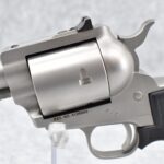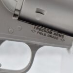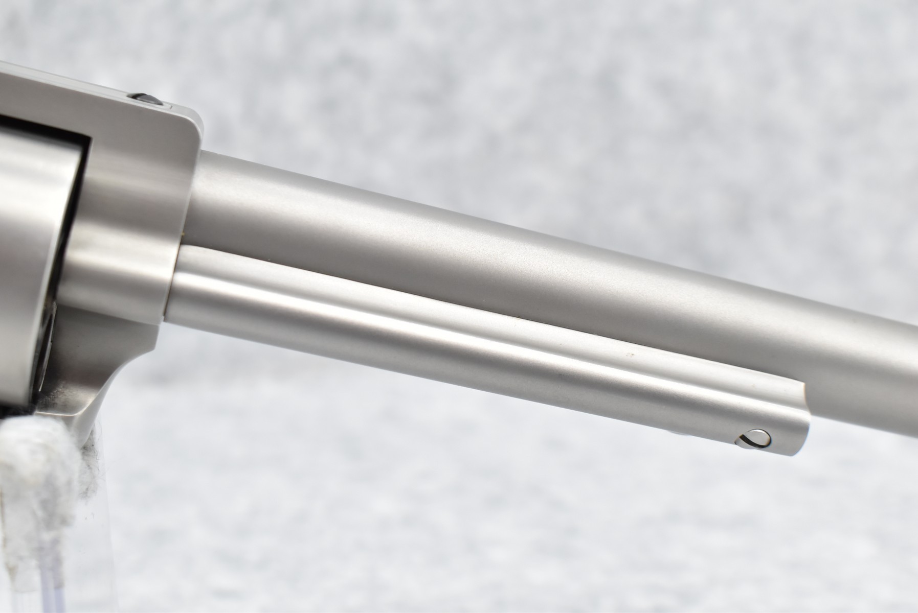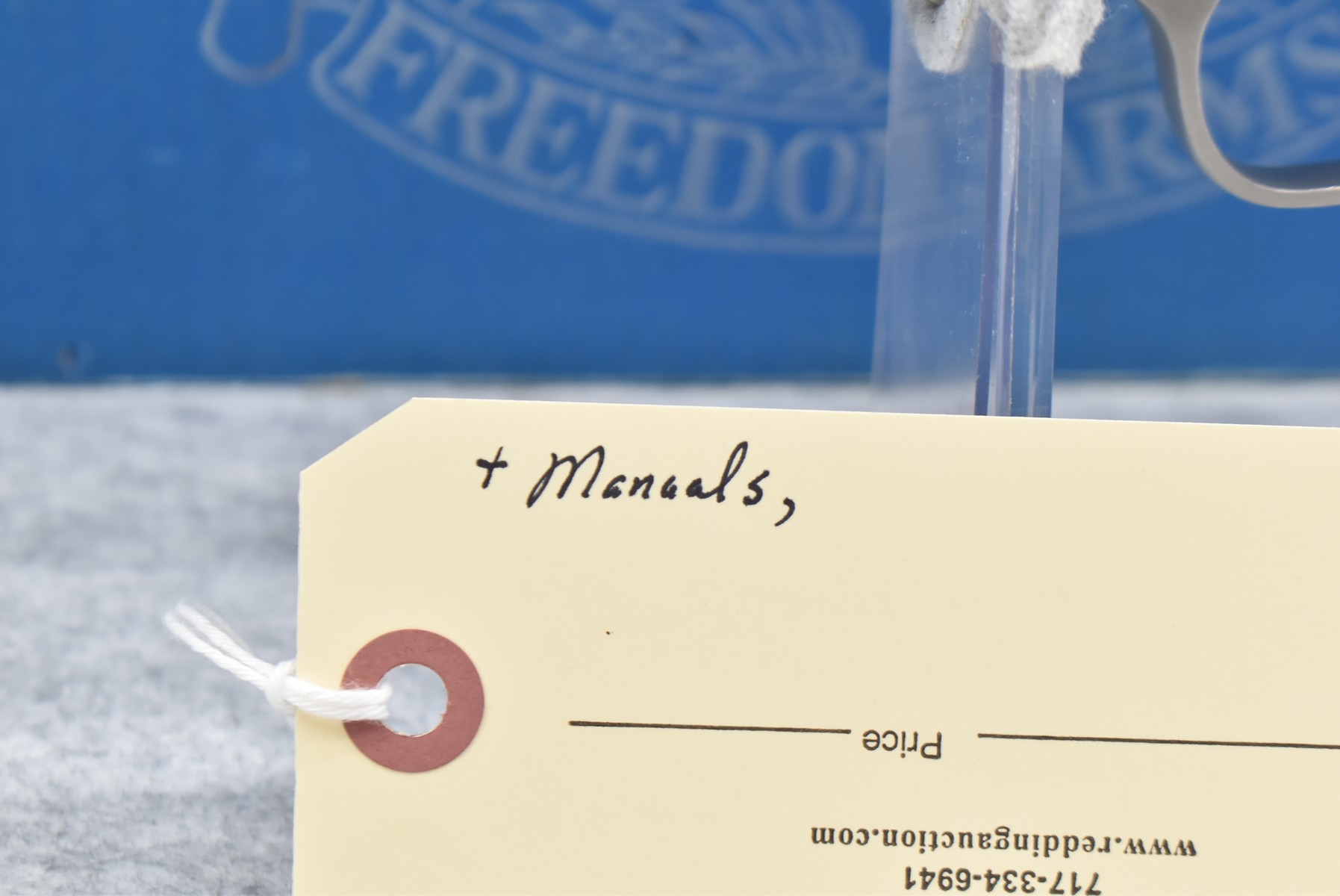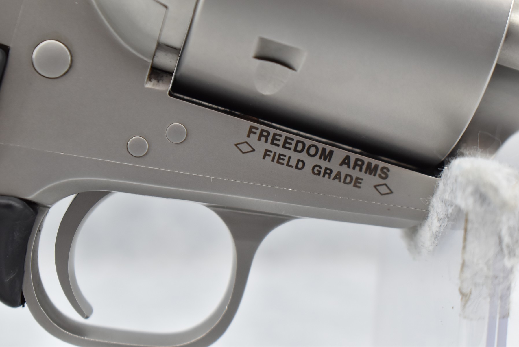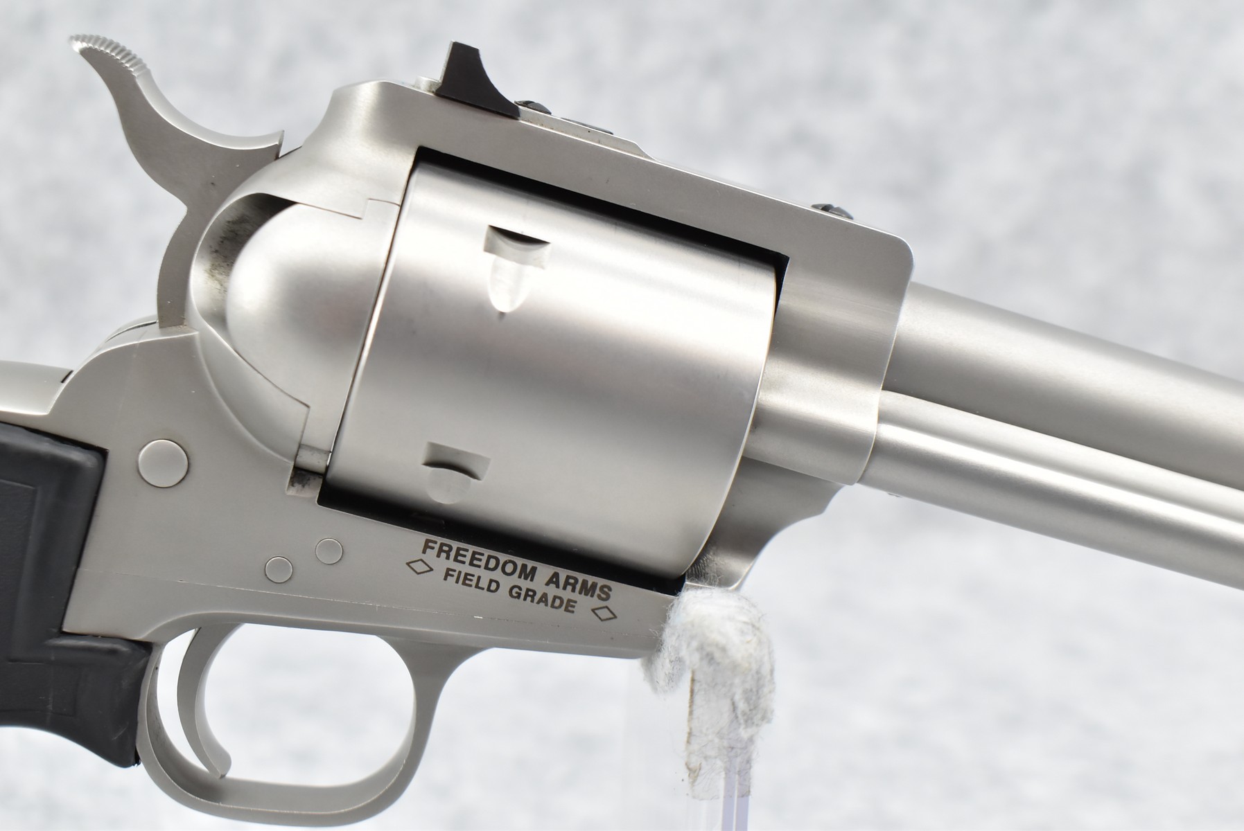 201R. Freedom Arms – Mod. 555 – 50 AE Cal. Single Action Revolver – w/5½” Barrel w/Ramp Blade Front and Adjustable Rear Notch Sights – Satin Stainless Finish – w/Pachmayr Checkered Molded Black Rubber Grips – w/Factory Box and Manuals