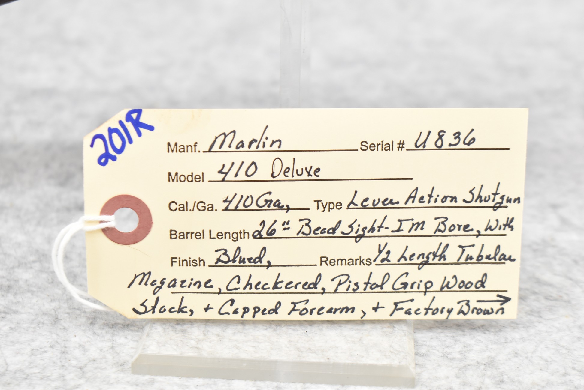 201R. Marlin – Mod. 410 Deluxe – 410ga. Lever Action Shotgun – w/26” IM Choke Barrel w/Bead Sight & Half Length Tubular Magazine – Blued Finish – w/Checked Pistol Grip Wood Stock & Capped Forearm w/Factory Hard Rubber Butt Plate – Mfg. Between 1929-1932 – These Guns Were Offered as Free Incentive if You Purchased 4 Shares of Marlin Stock at $25 Per Share! Scarce Gun!