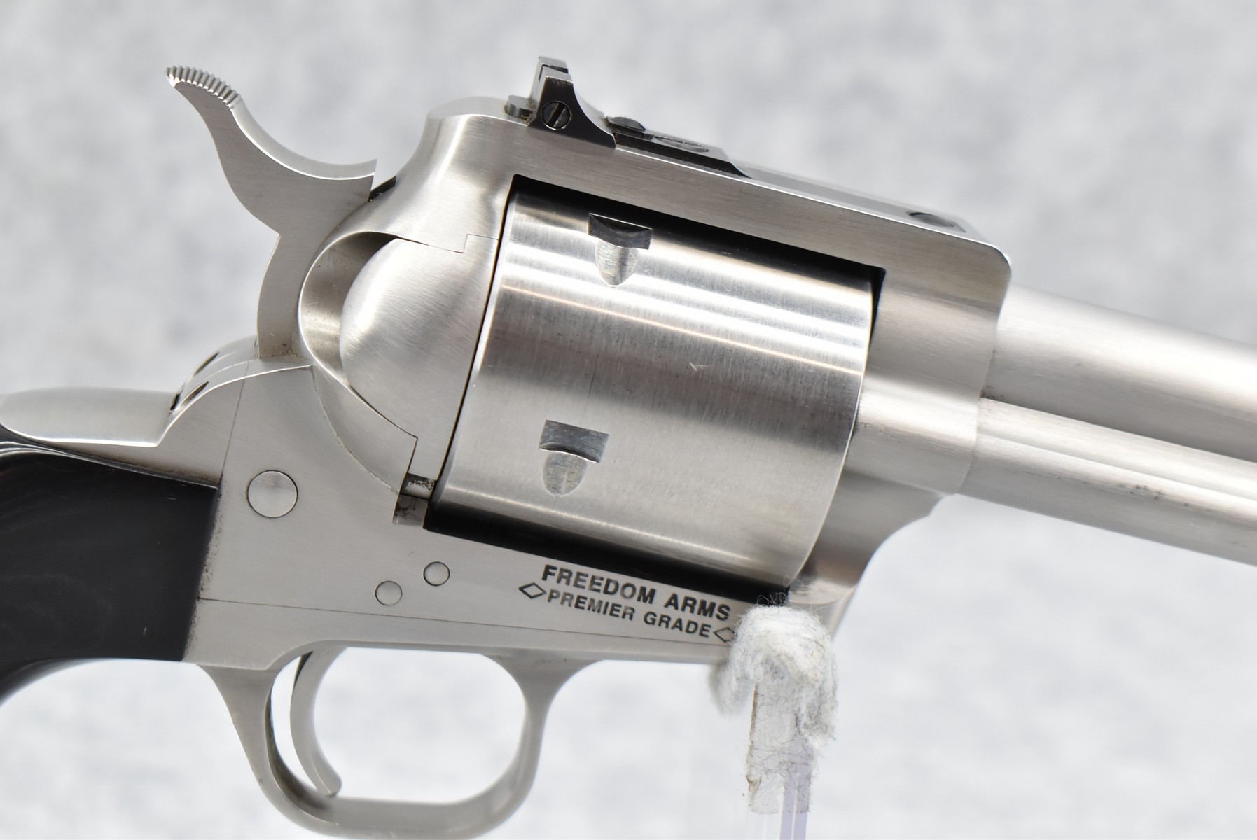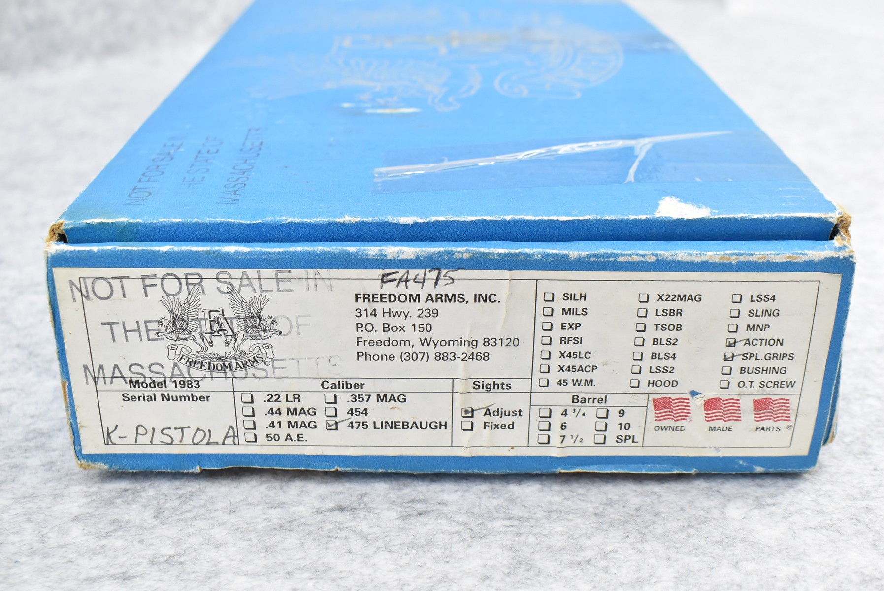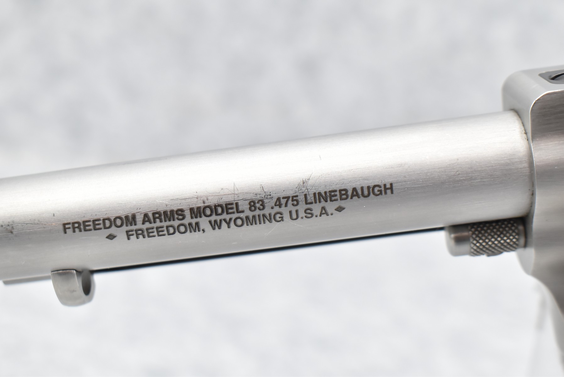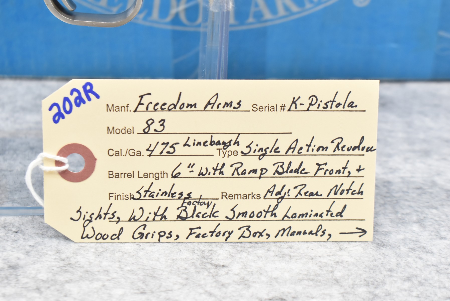 202R. Freedom Arms – Mod. 83 – 475 Linebaugh Cal. Single Action Revolver – w/6” Barrel w/Ramp Blade Front and Adjustable Rear Notch Sights – Stainless Finish – w/Factory Black Smooth Laminated Wood Grips – w/Factory Box, Manuals, Barrel Lock, and Key
