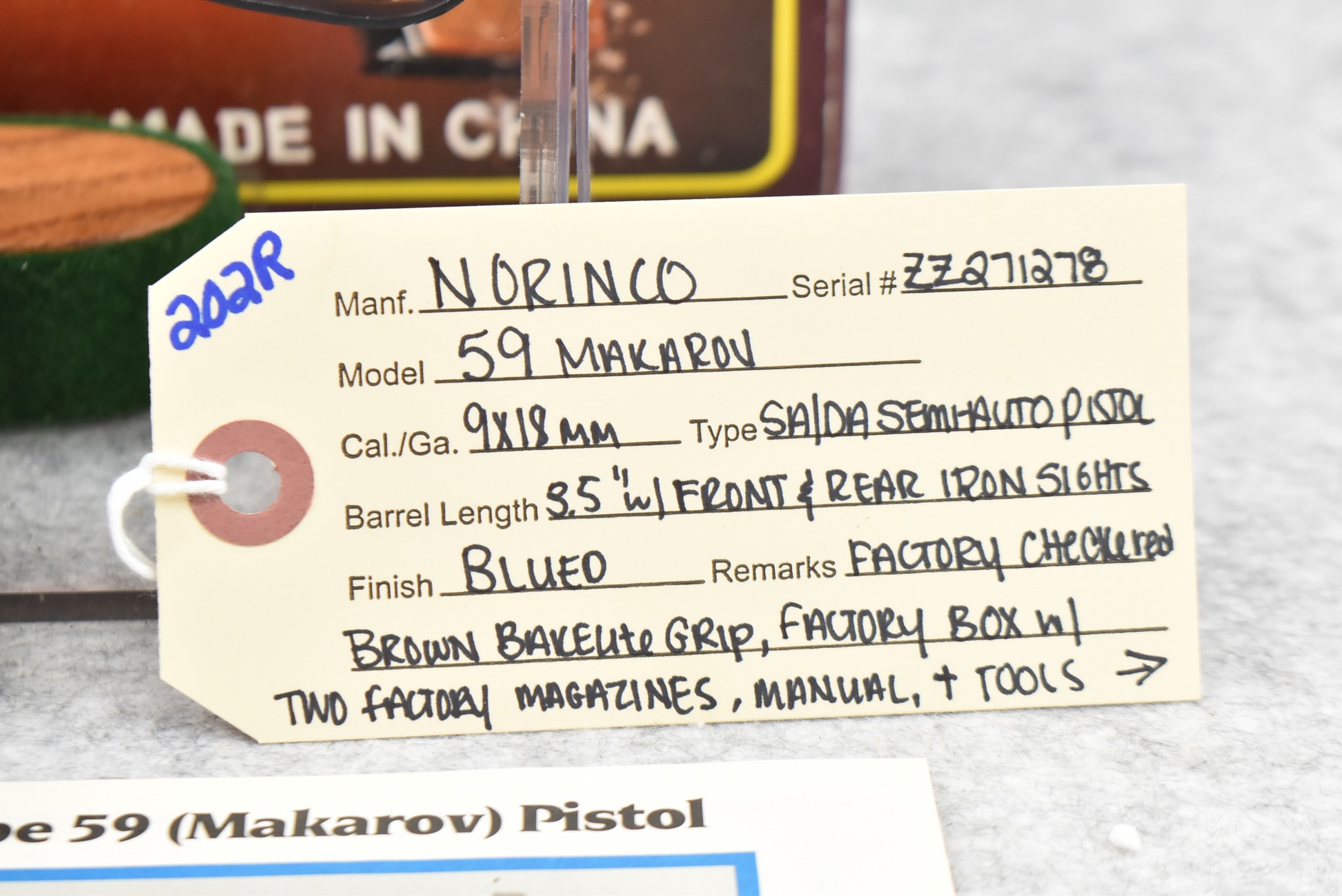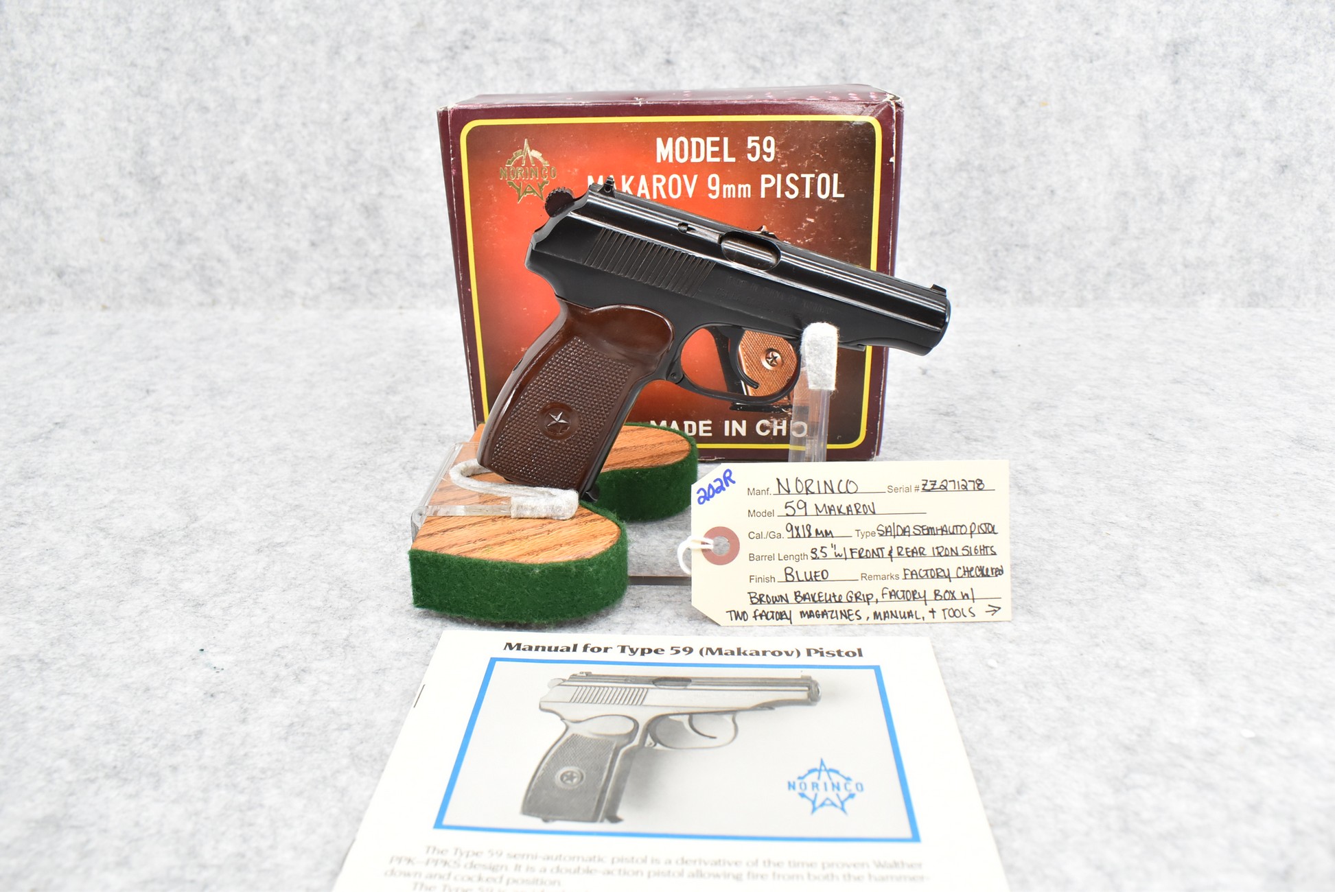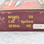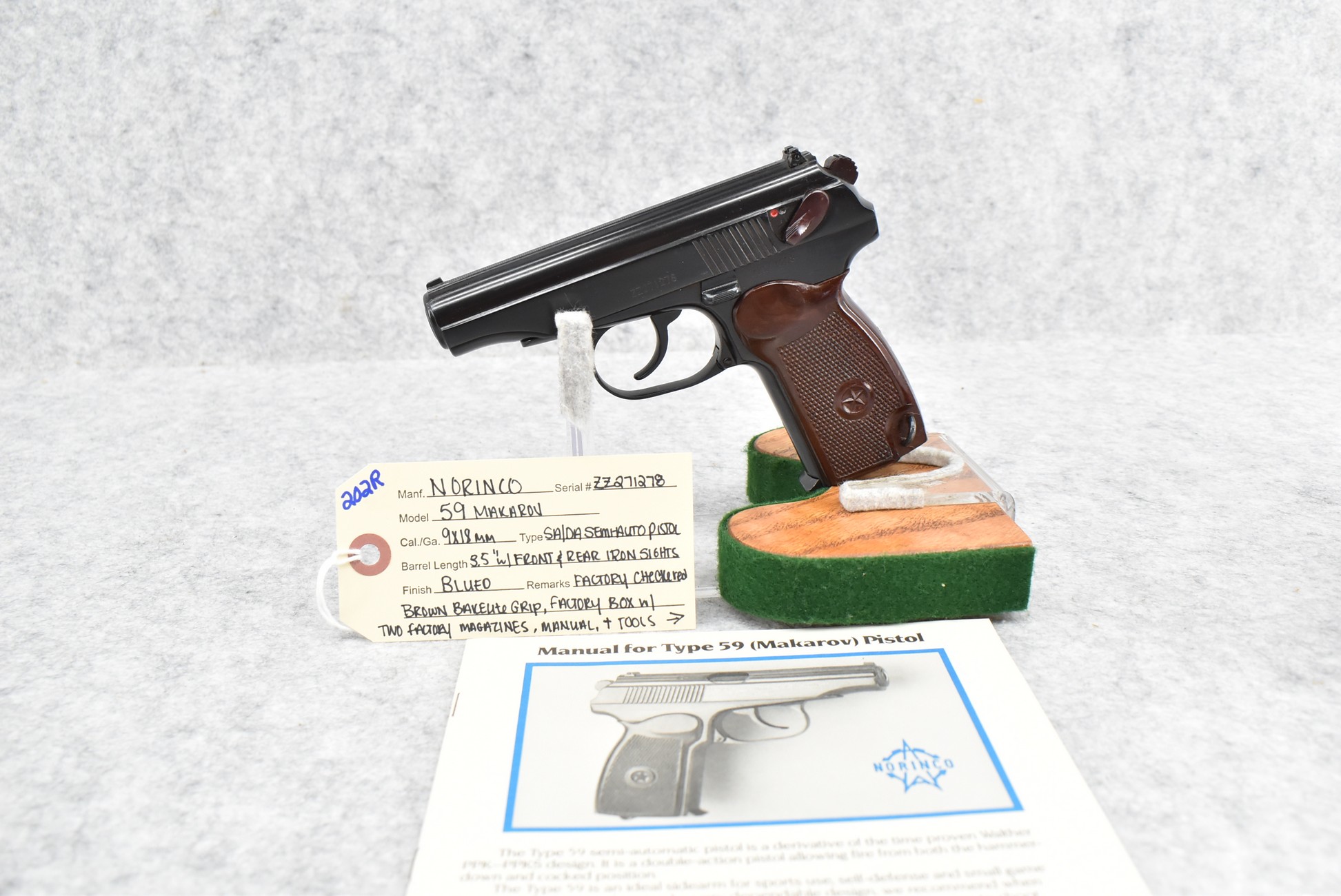 202R. Norinco – Mod. 59 Makarov – 9x18mm Cal. Semi-Auto Pistol – w/3.5” Barrel w/Front & Rear Iron Sights – Blued Finish – w/Factory Checkered Brown Bakelite Grips – Appears New & Unfired w/Factory Box, 2 Factory Magazines, Manual & Tools – Import Marked