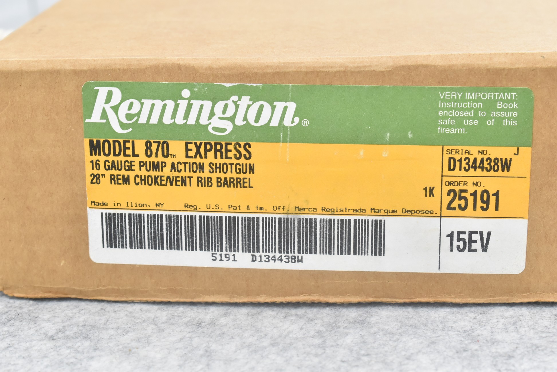 202R. Remington – Mod. 870 Express – 16ga. 2 ¾” Pump Action Shotgun – w/28” Rem. Choke, Vent-Rib Barrel w/Front Bead Sight – Matte Blued Finish – w/Checkered Pistol Grip Wood Stocks w/Factory Recoil Pad – Unfired w/Factory Box & Manual