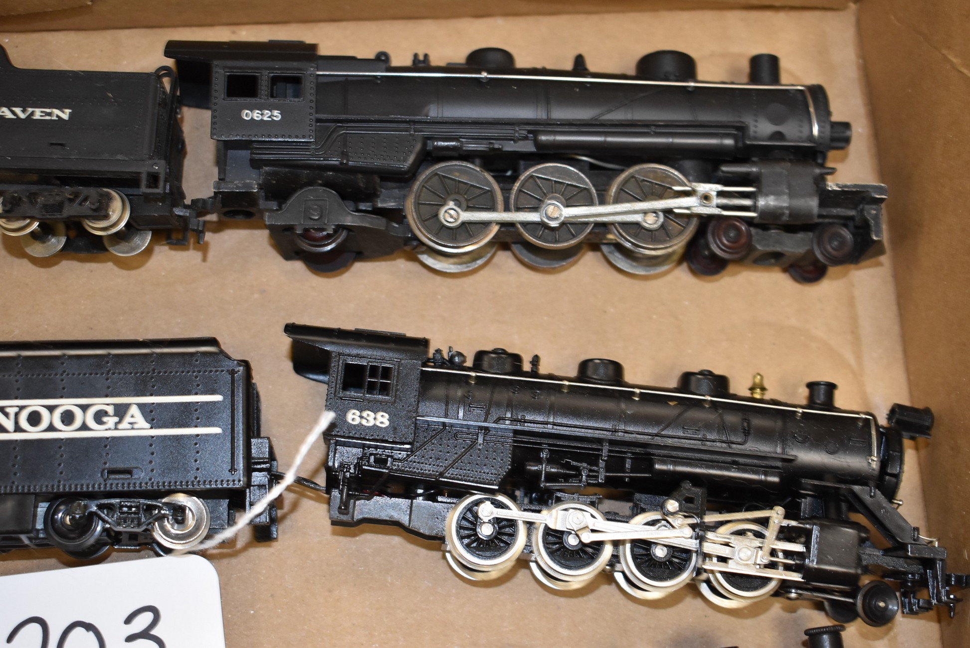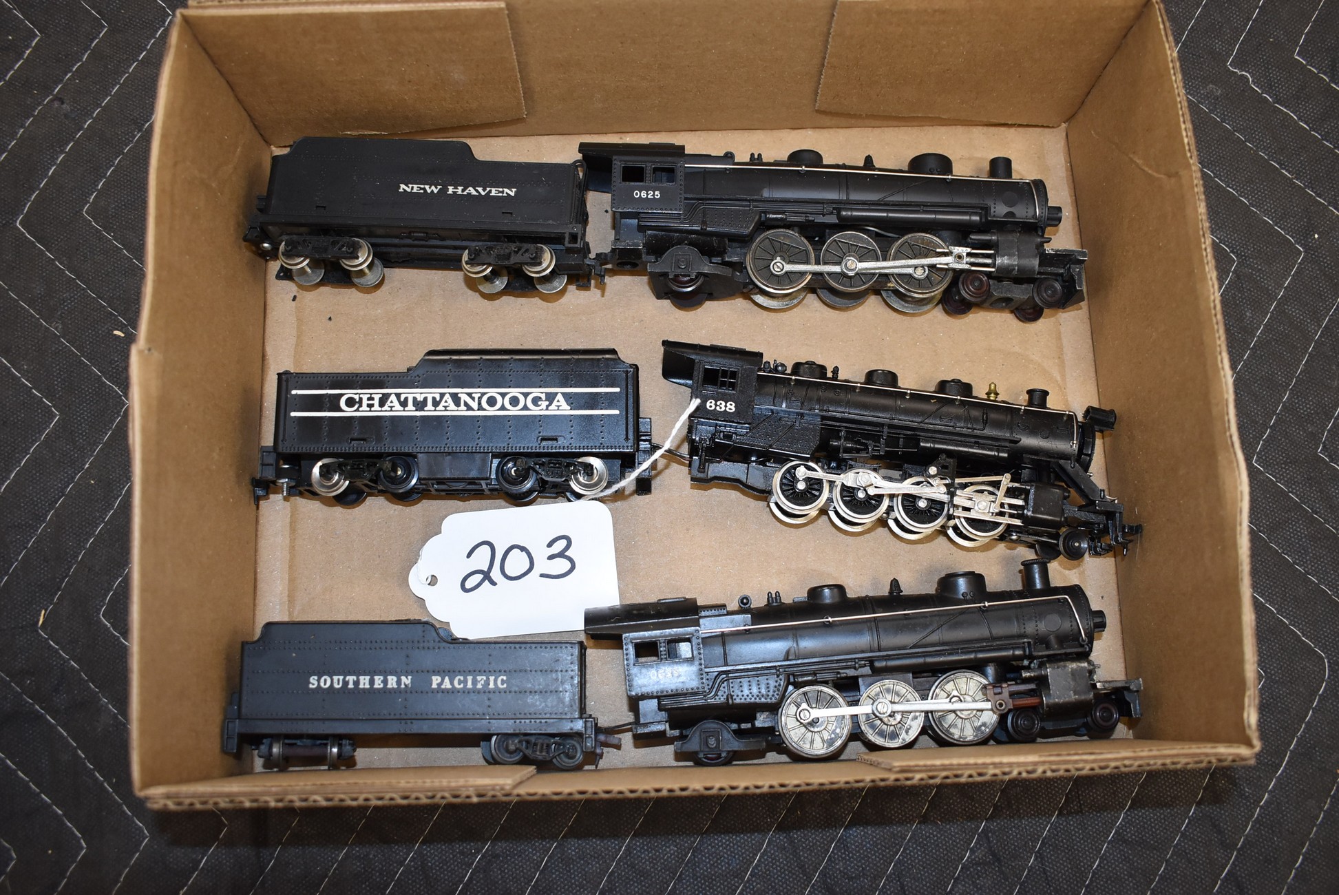 203. Lot of 3 Engines and Tenders – Including New Haven 0625, Chattanooga 683, and Southern Pacific 0635 – No Boxes