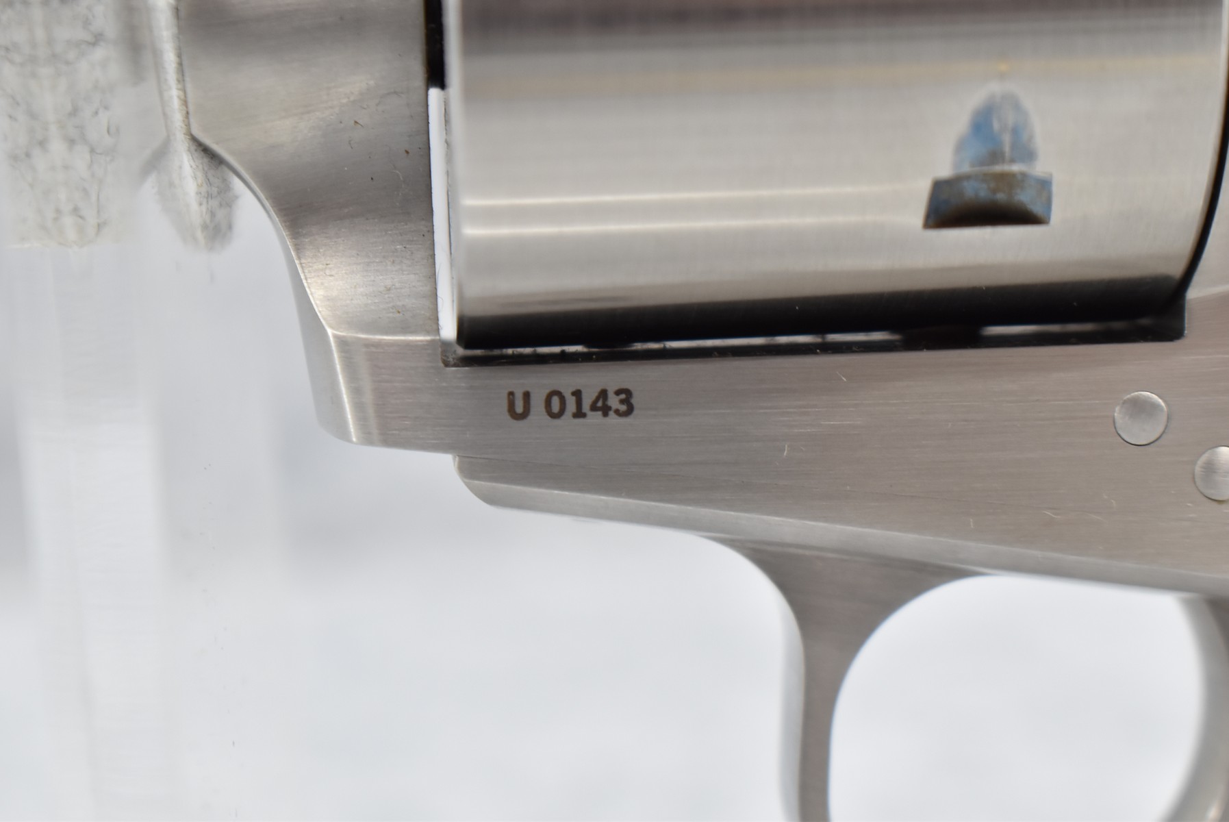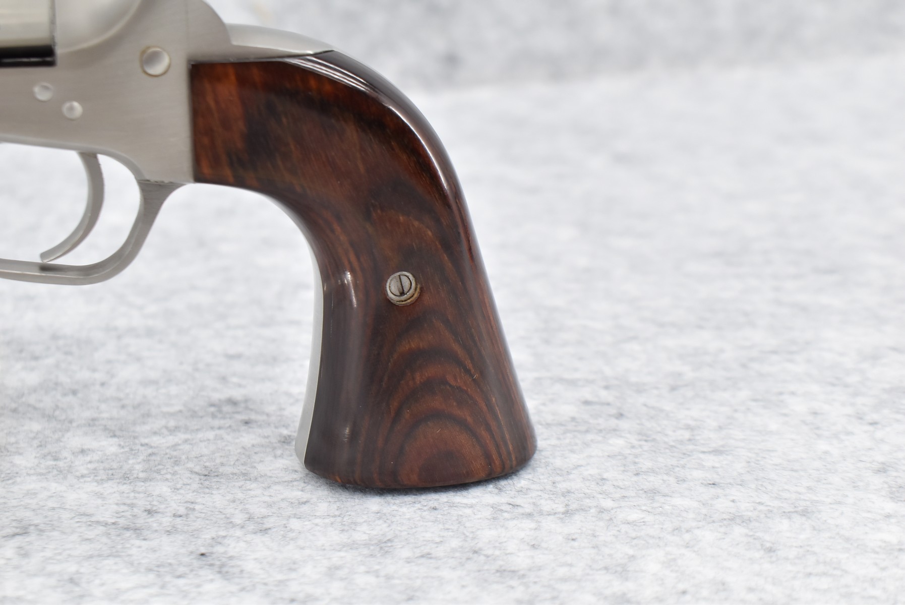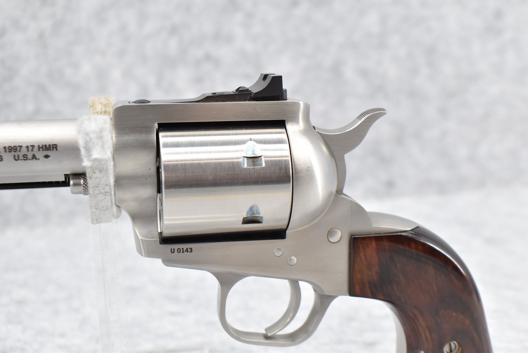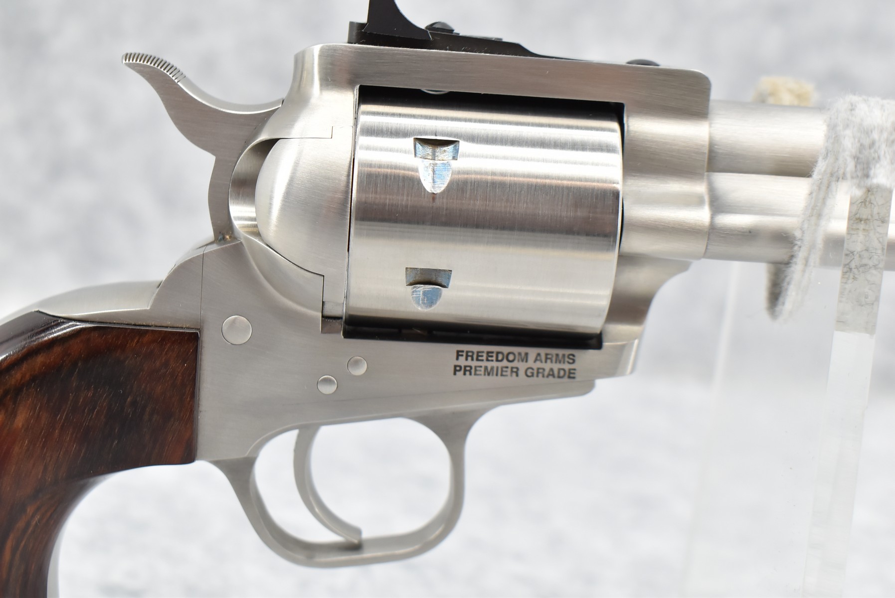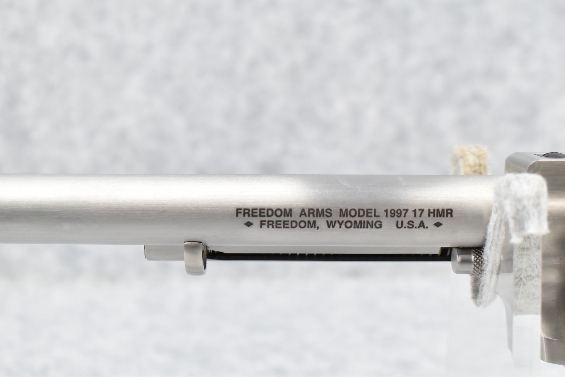 203R. Freedom Arms – Mod. 1997 – 17 HMR Cal. Single Action Revolver – w/7½” Barrel w/Ramp Blade Front and Adjustable Rear Notch Sights – Stainless Finish – w/Factory Smooth Wood Grips – w/Factory Box