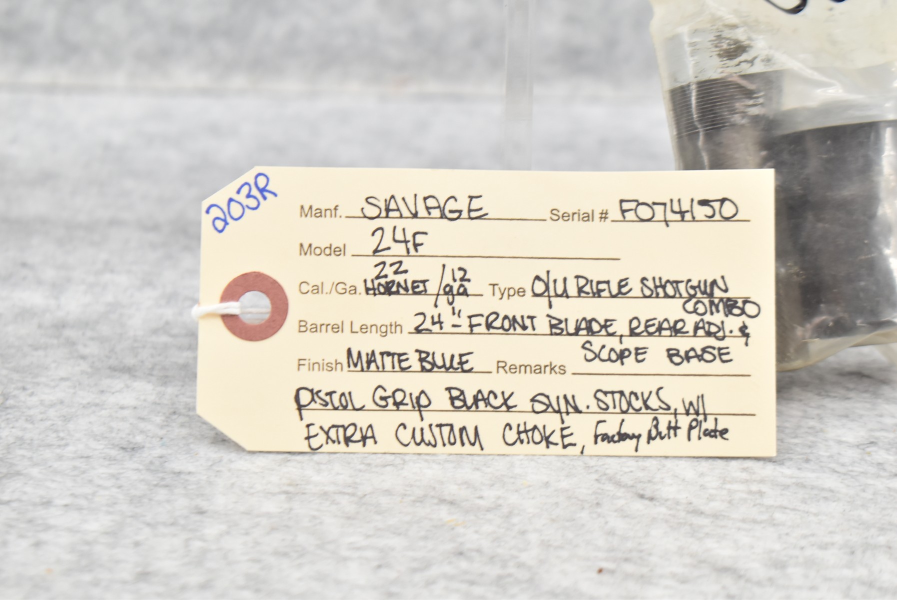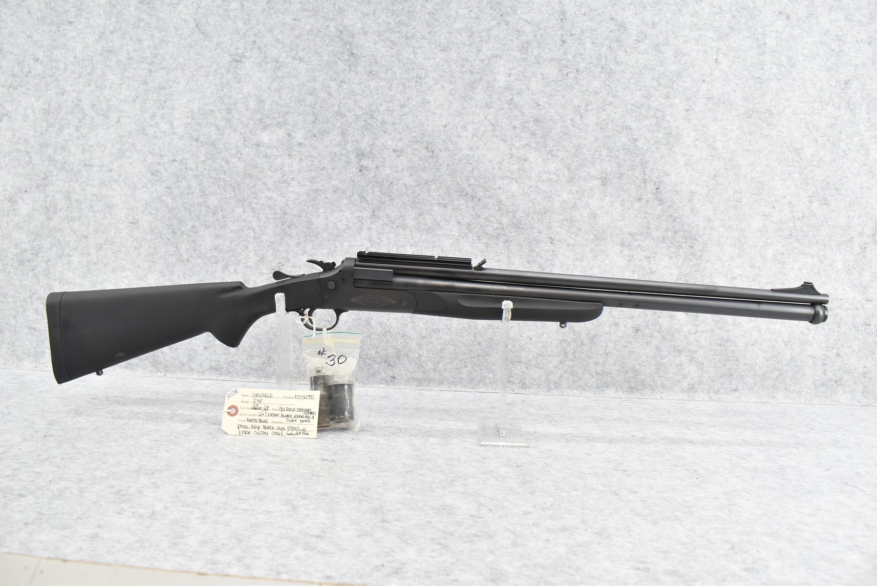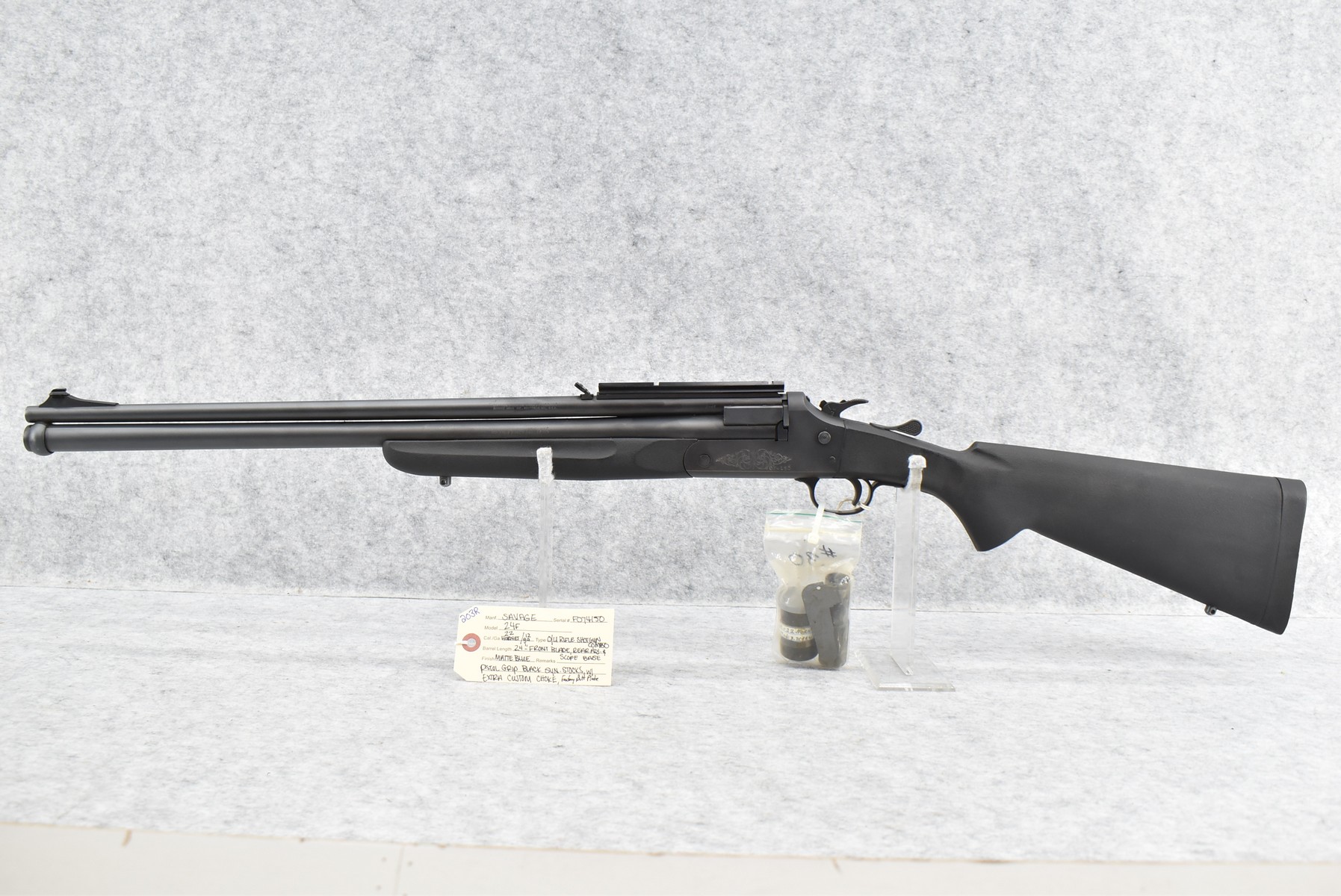203R. Savage – Mod. 24F – 22 Hornet Cal. Over 12ga. Over-Under Rifle Shotgun Combo – w/24” Barrels w/Front Blade & Rear Adj. Sights – Matte Blued Finish – w/Pistol Grip Black Synthetic Stocks w/Factory Butt Plate – w/Scope Base – w/Extra Custom Choke