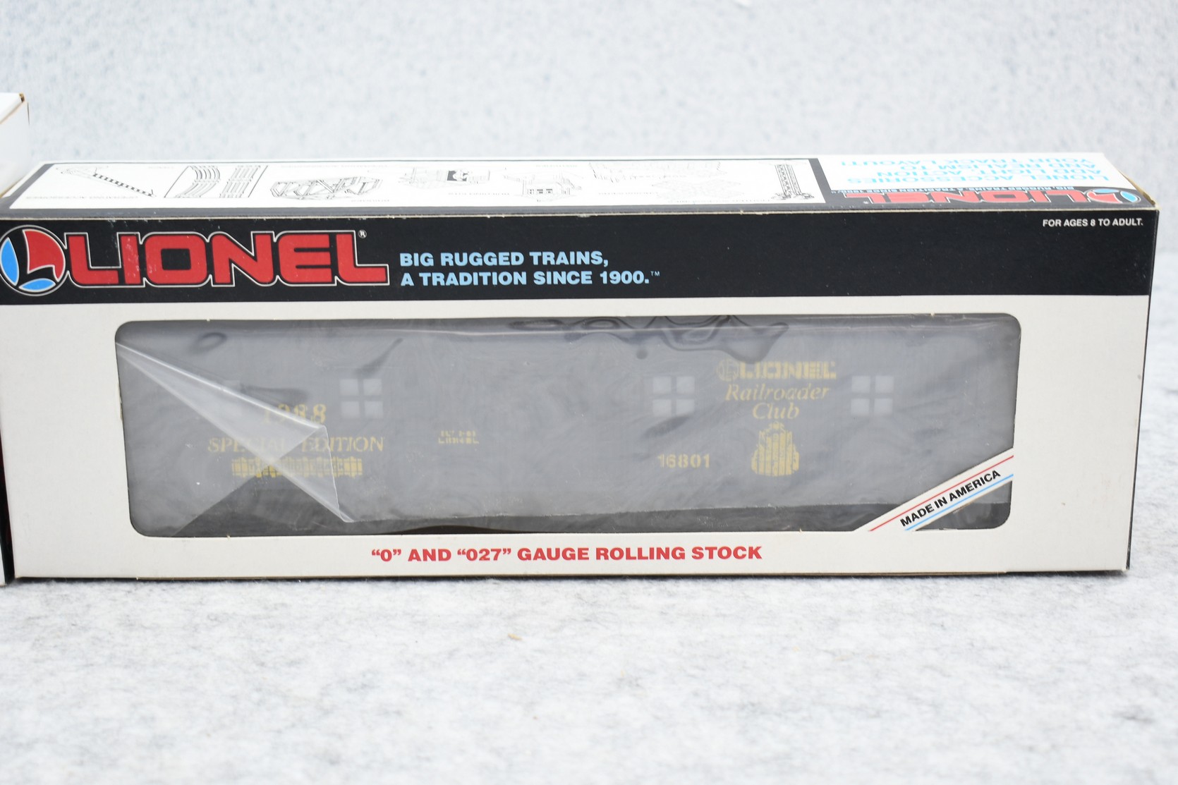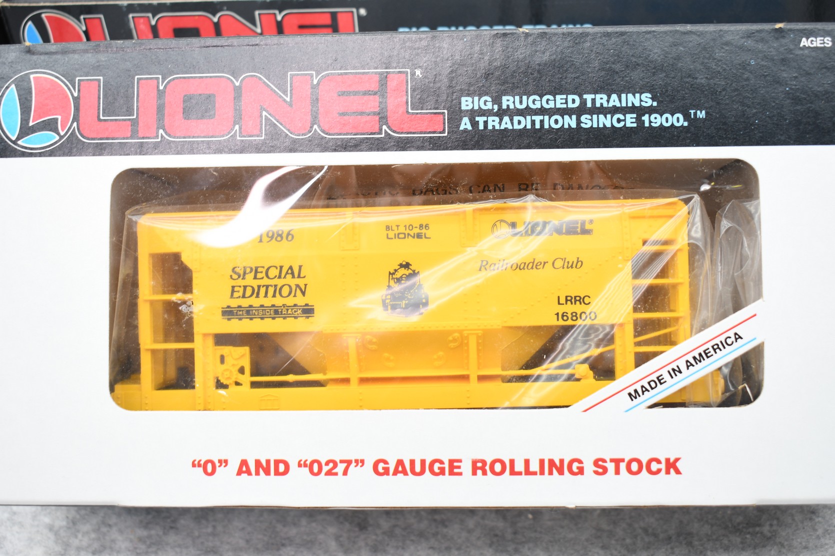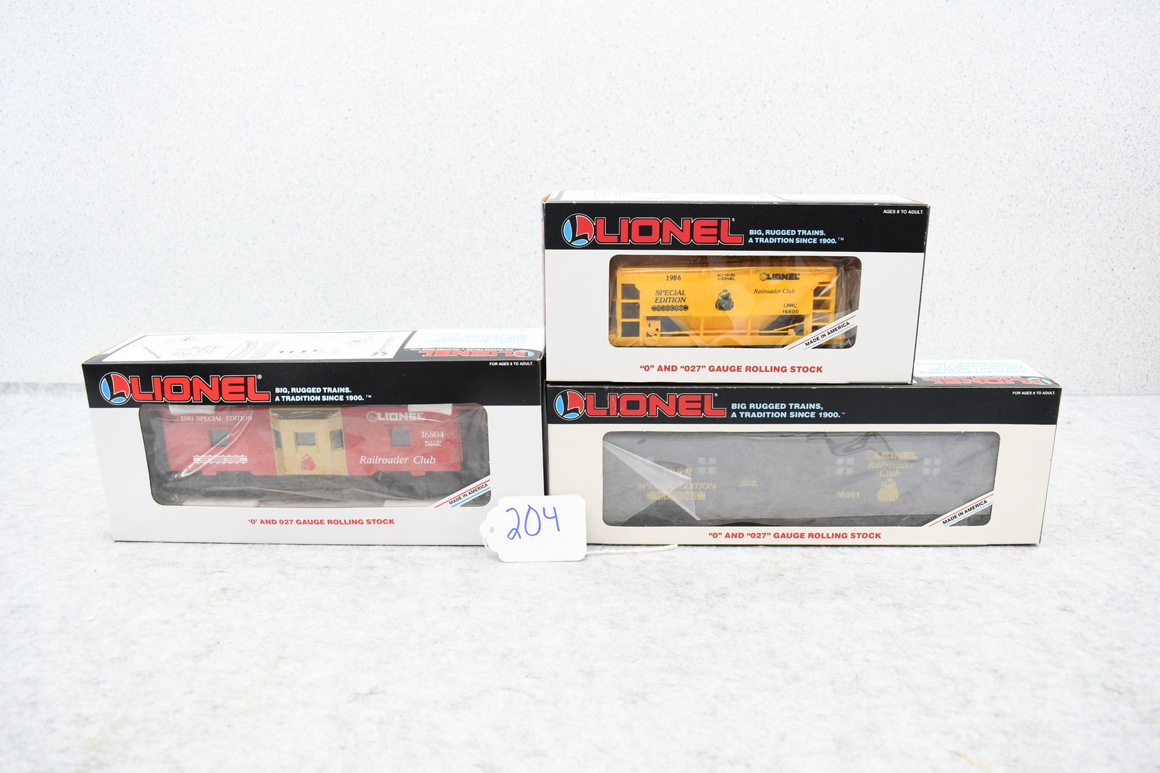 204. Lot of 3 Lionel O gauge train cars including 6-16804 1991 Railroad Club Bay Window Caboose, 1986 special edition railroader Club Hopper car & 1988 Special edition Railroader Club boxcar. All NIB
