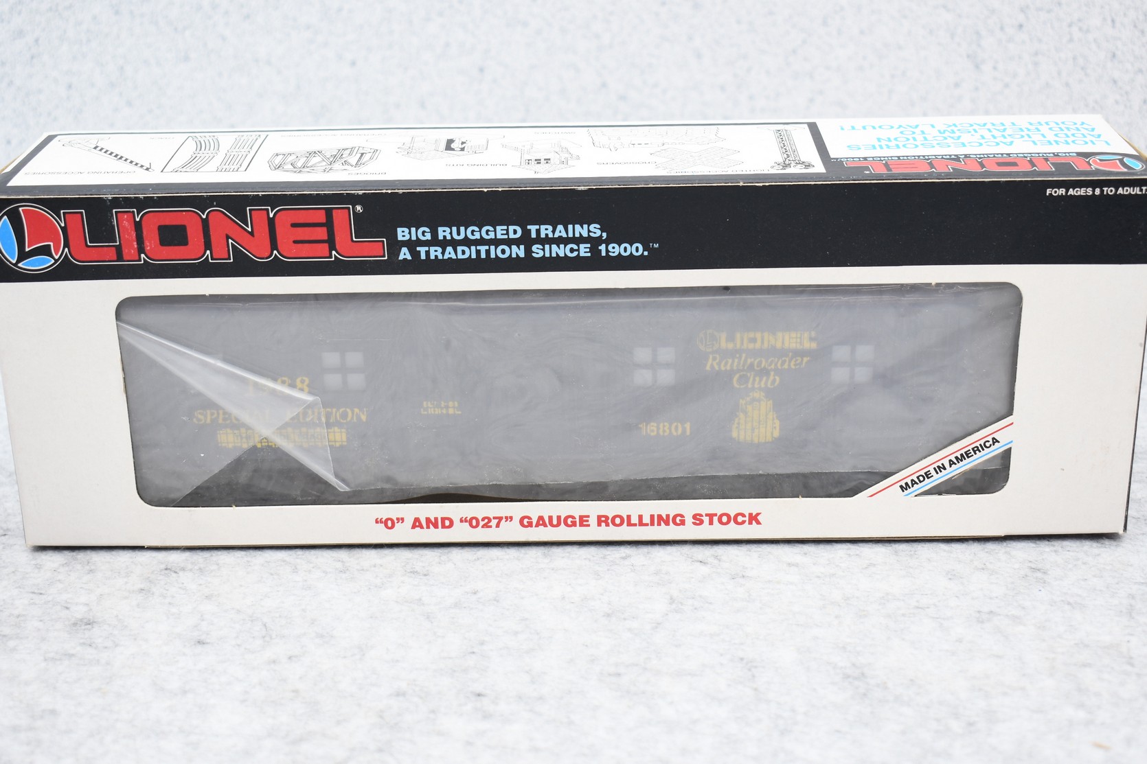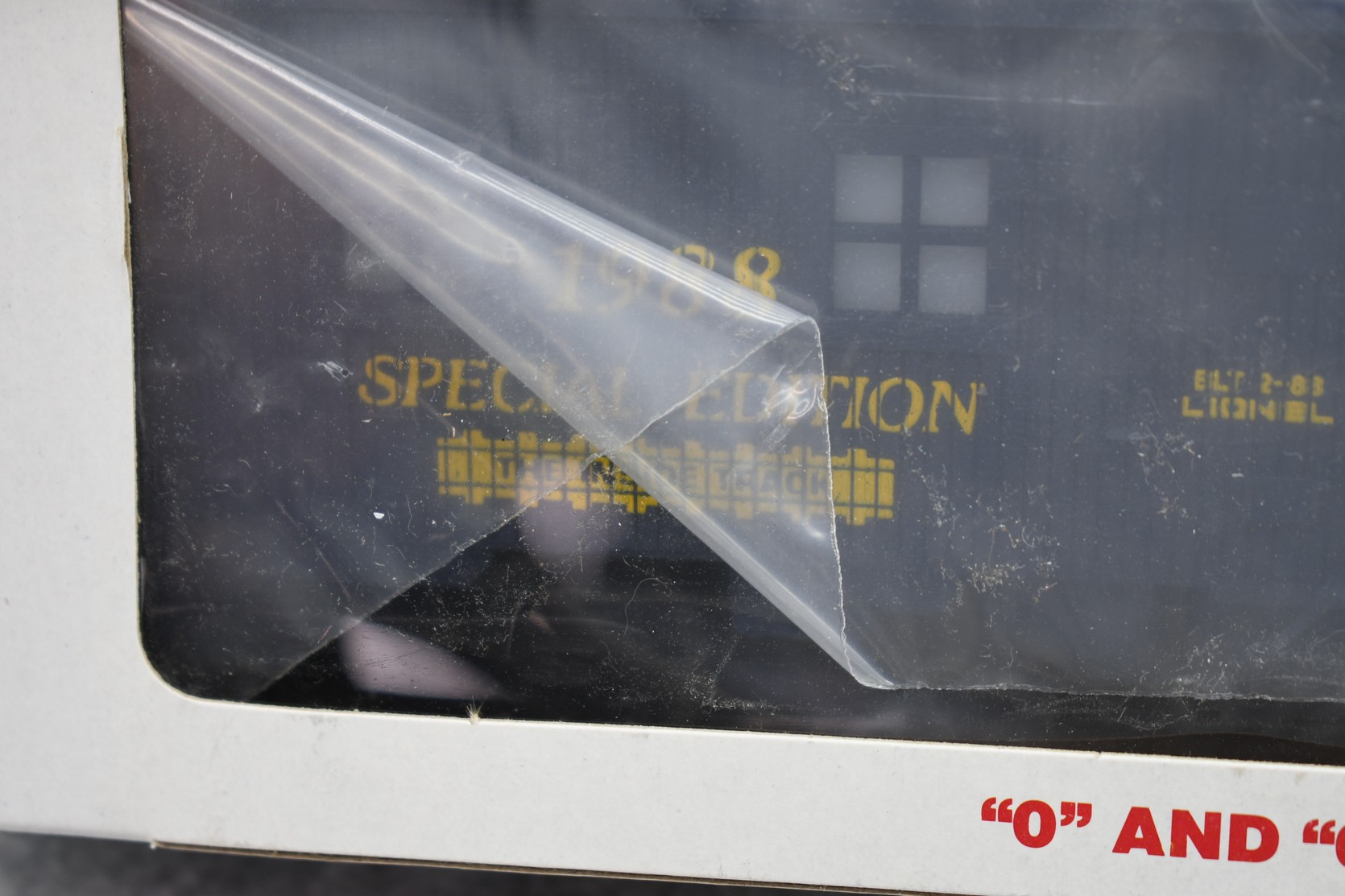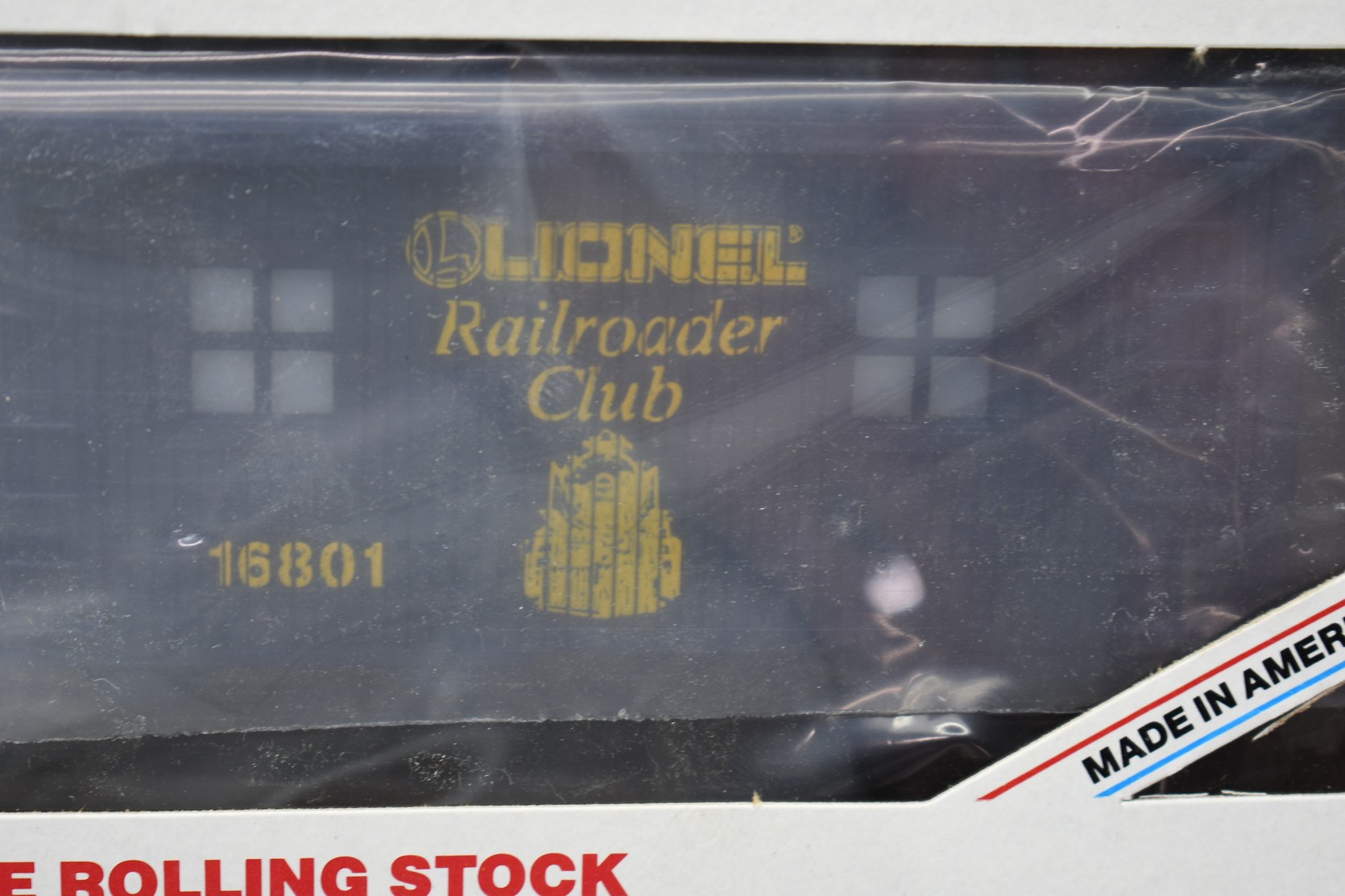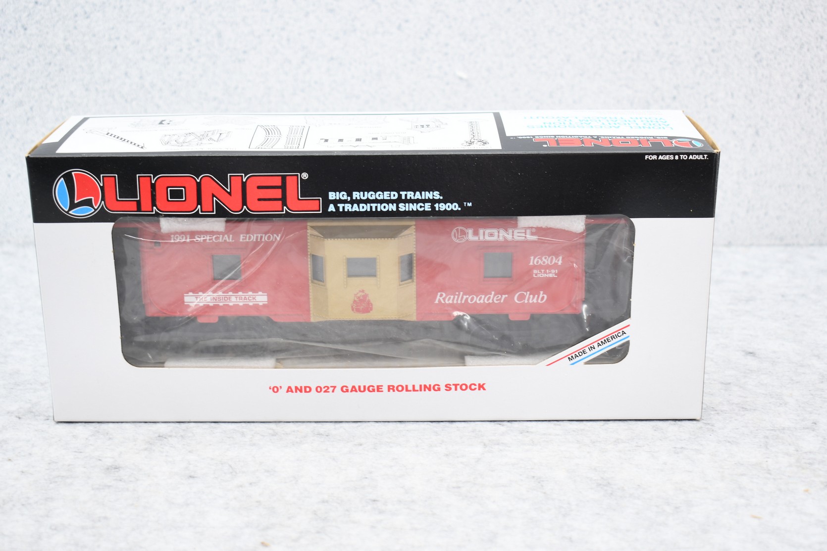 204. Lot of 3 Lionel O gauge train cars including 6-16804 1991 Railroad Club Bay Window Caboose, 1986 special edition railroader Club Hopper car & 1988 Special edition Railroader Club boxcar. All NIB