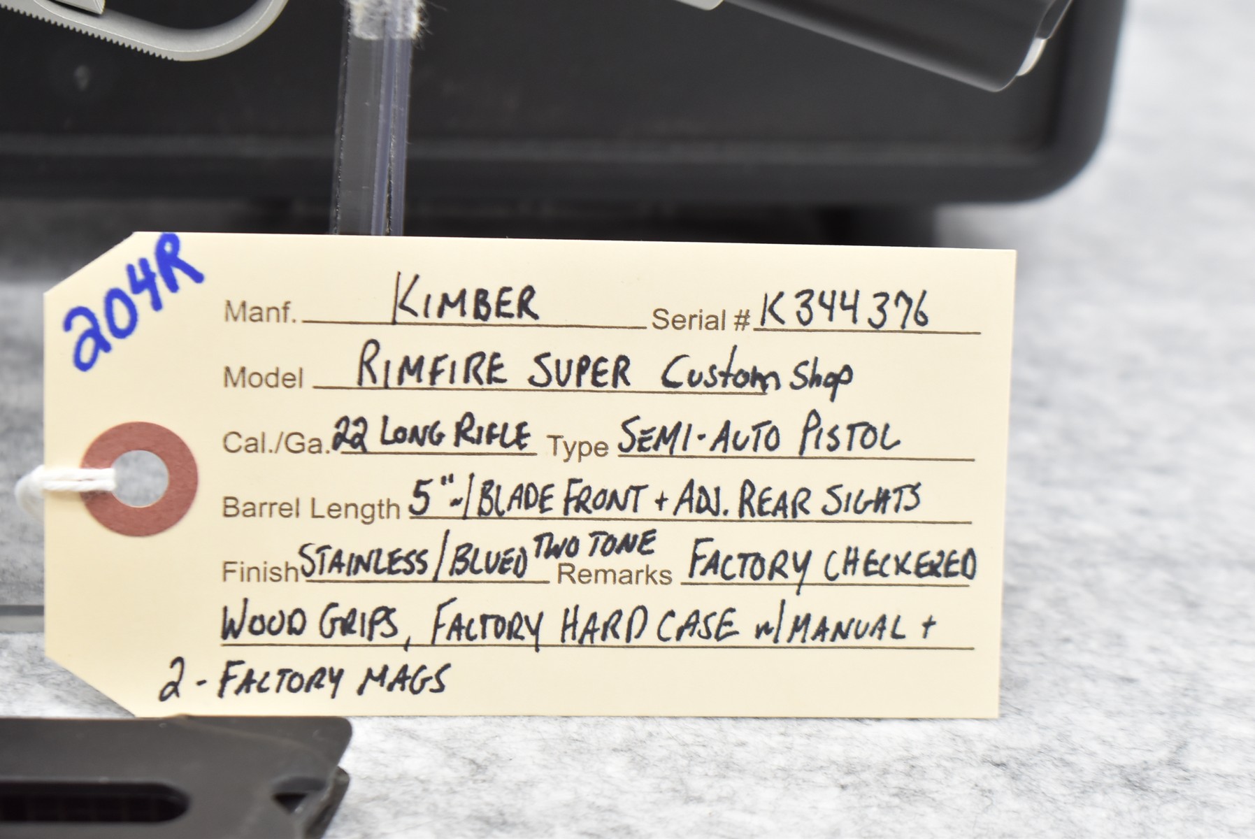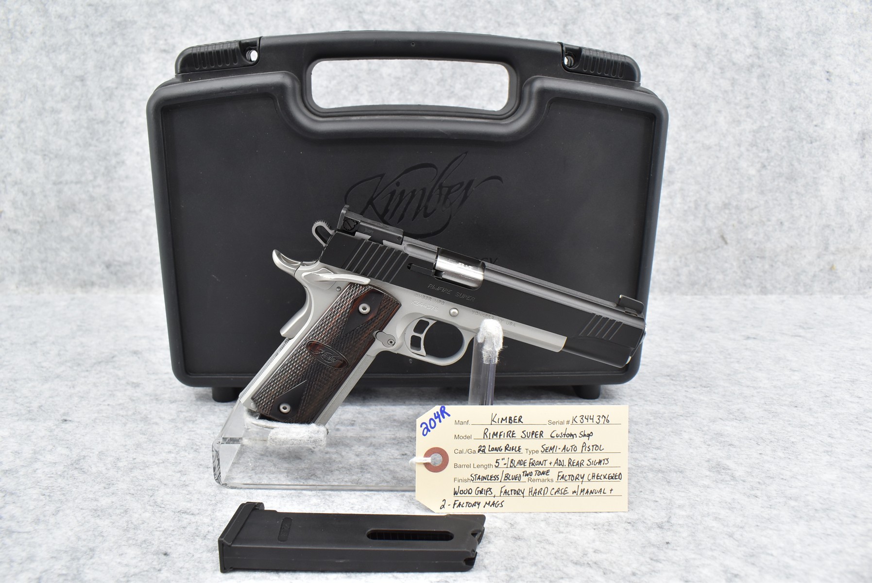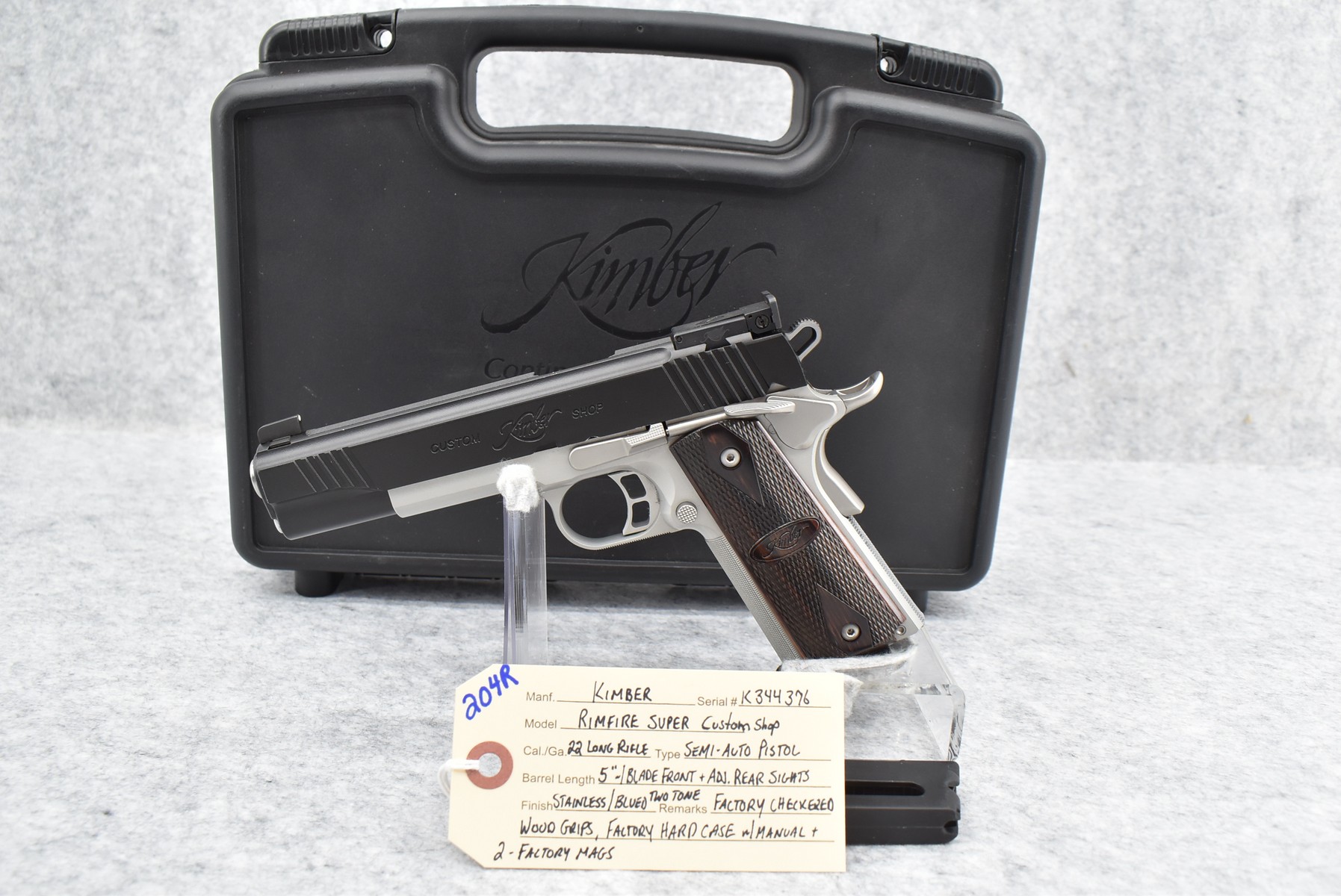 204R.     Kimber – Mod. Rimfire Super Custom Shop – 22LR Cal. Semi-Auto Pistol – w/5” Barrel w/Blade Front and Adjustable Rear Sights – Stainless/Blued 2-Toned Finish – w/Factory Checkered Wood Grips – As New w/Factory Hard Case, Manual, and 2 Factory Magazines