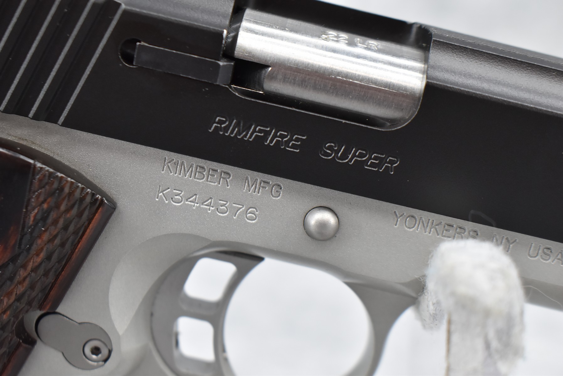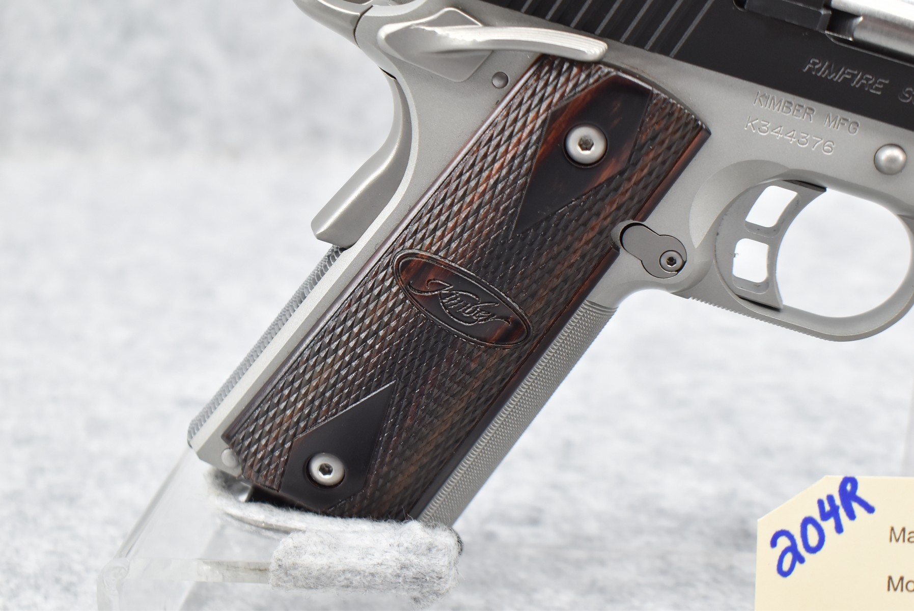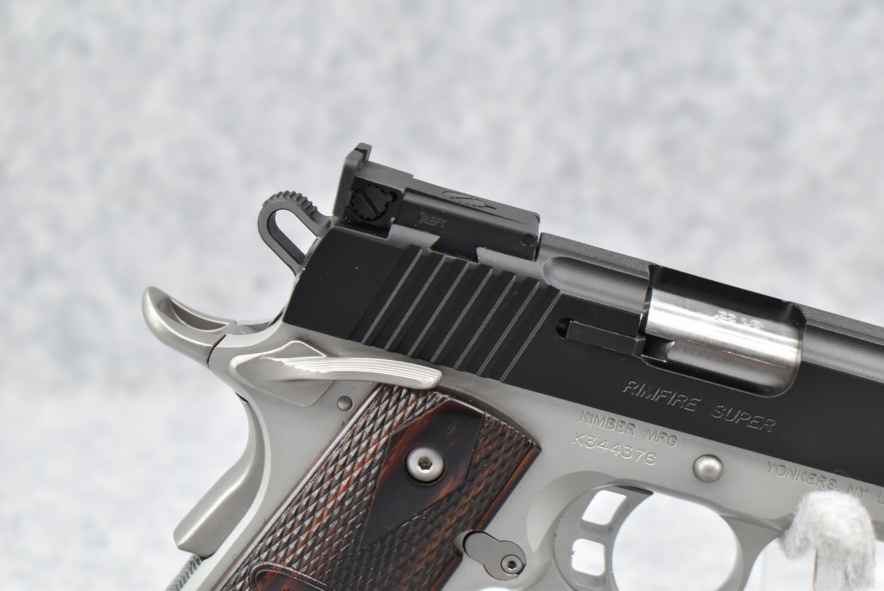 204R.     Kimber – Mod. Rimfire Super Custom Shop – 22LR Cal. Semi-Auto Pistol – w/5” Barrel w/Blade Front and Adjustable Rear Sights – Stainless/Blued 2-Toned Finish – w/Factory Checkered Wood Grips – As New w/Factory Hard Case, Manual, and 2 Factory Magazines