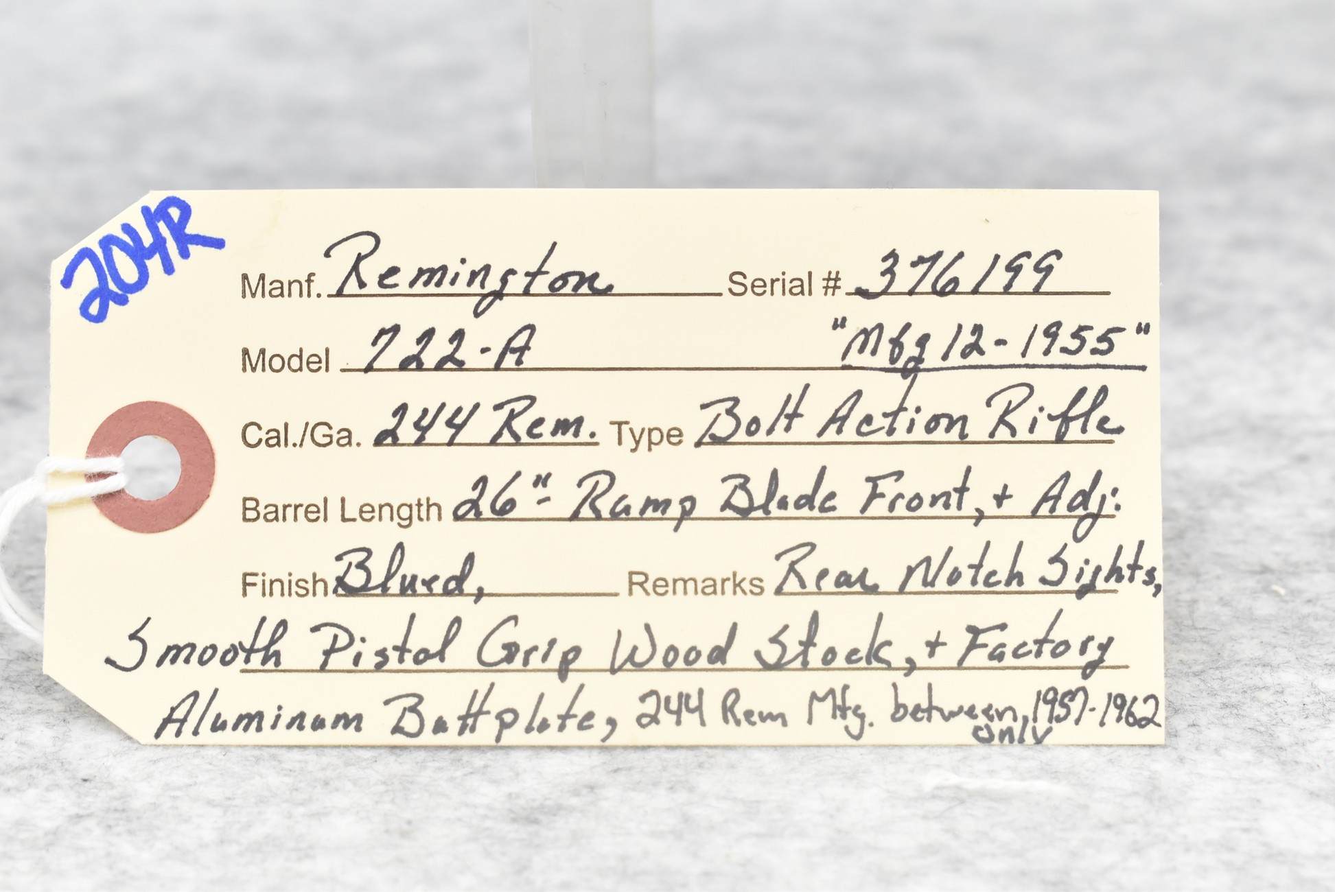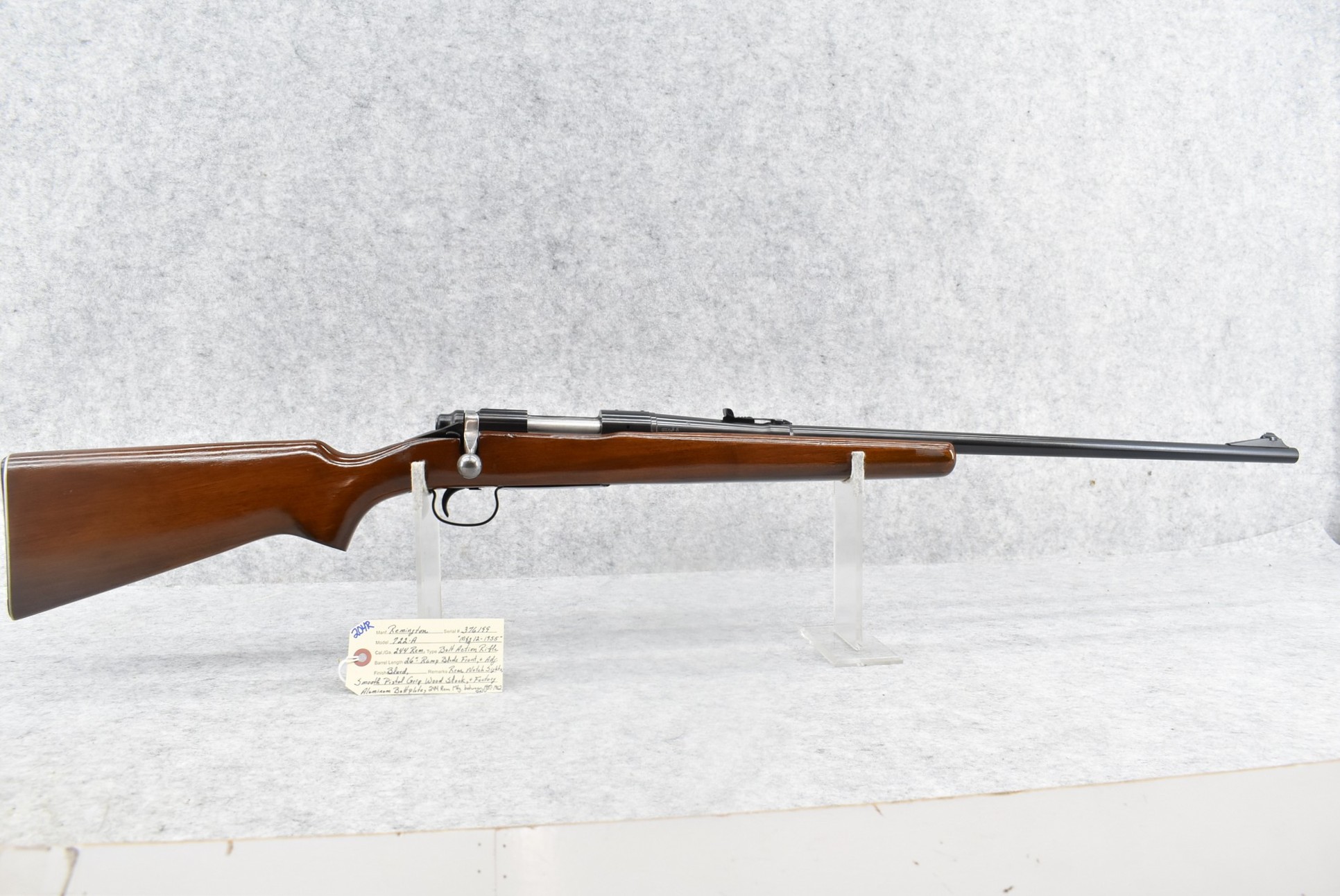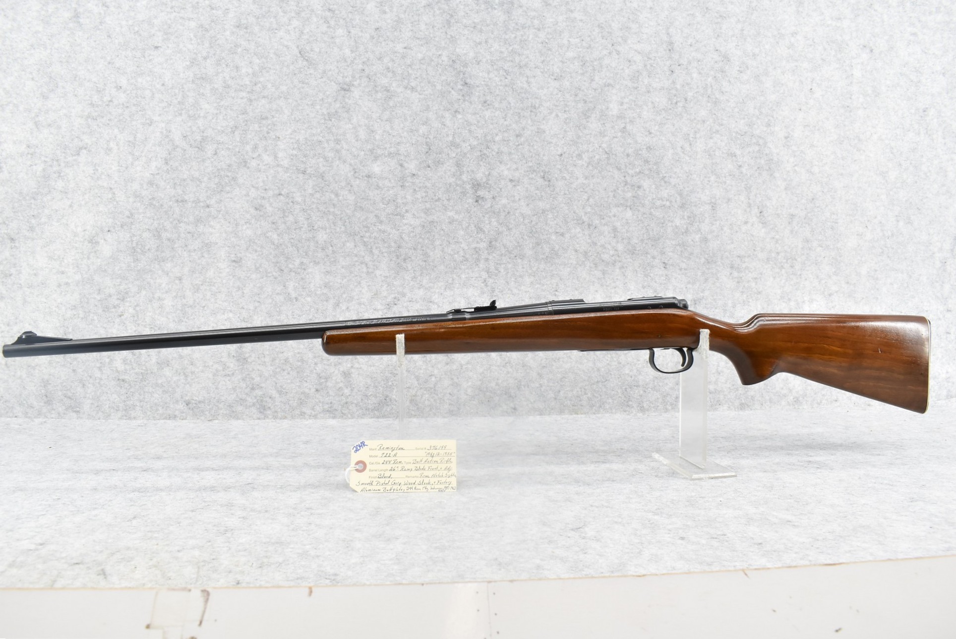 204R. Remington – Mod. 722-A – 244 Rem. Cal. Bolt Action Rifle – w/26” Barrel w/Ramp Blade Front & Adj. Rear Notch Sights – Blued Finish – w/Smooth Pistol Grip Wood Stock w/Factory Aluminum Butt Plate – 244 Rem. Mag. Was Mfg. Between 1957-1962 Only