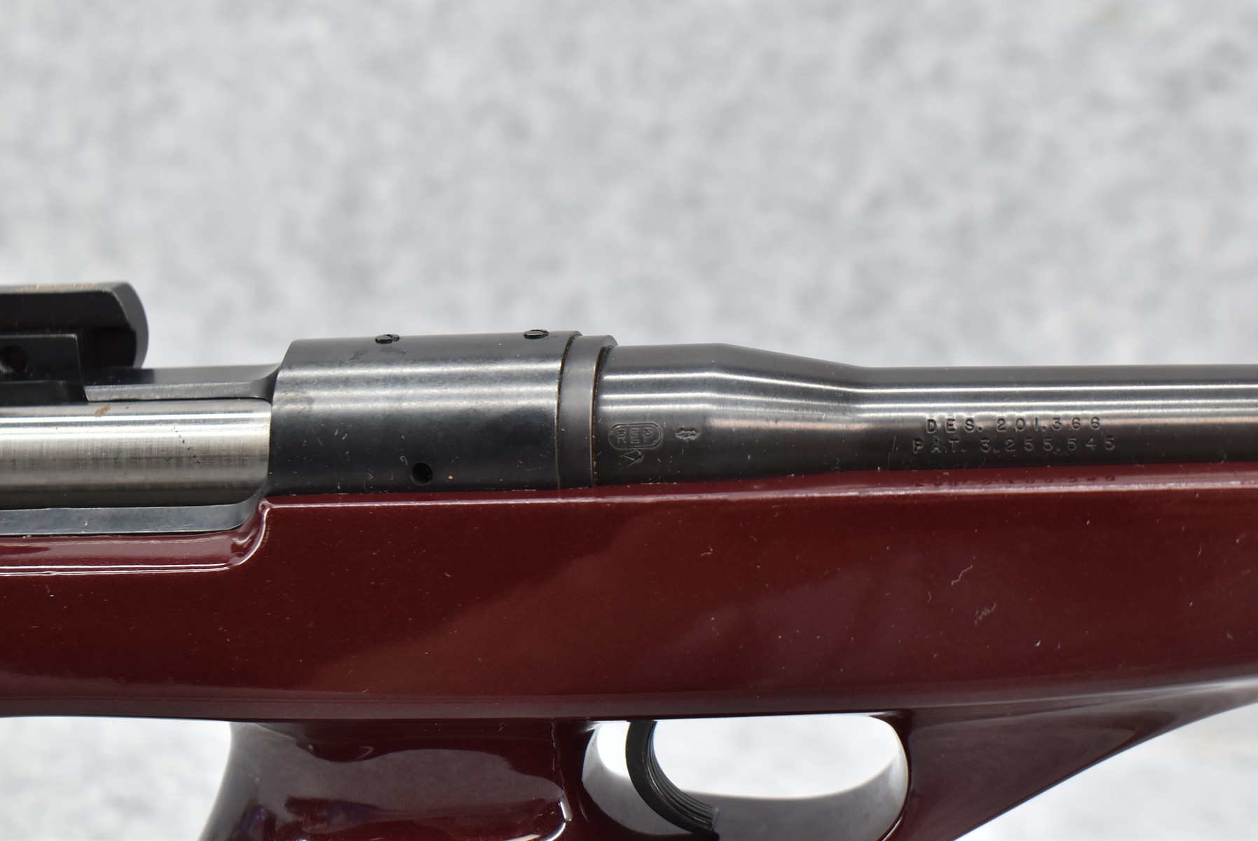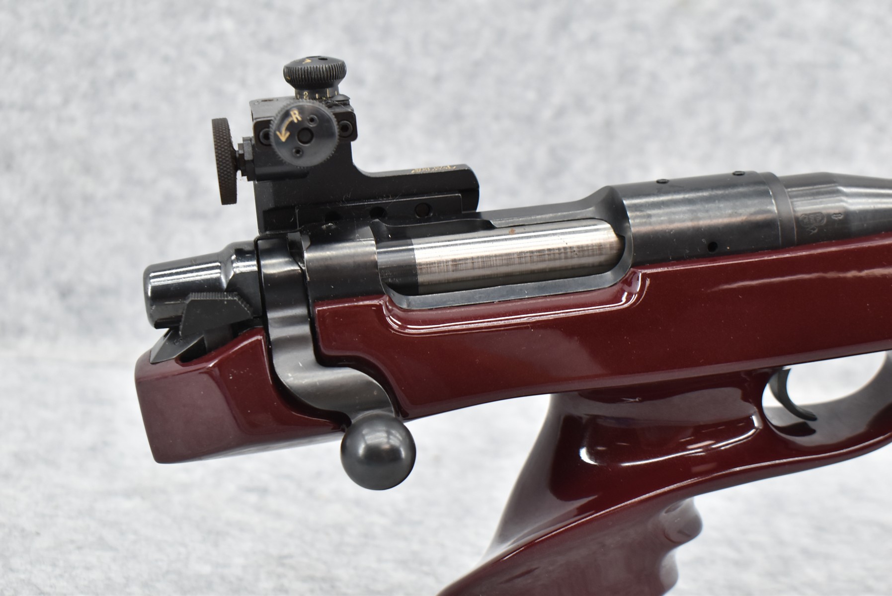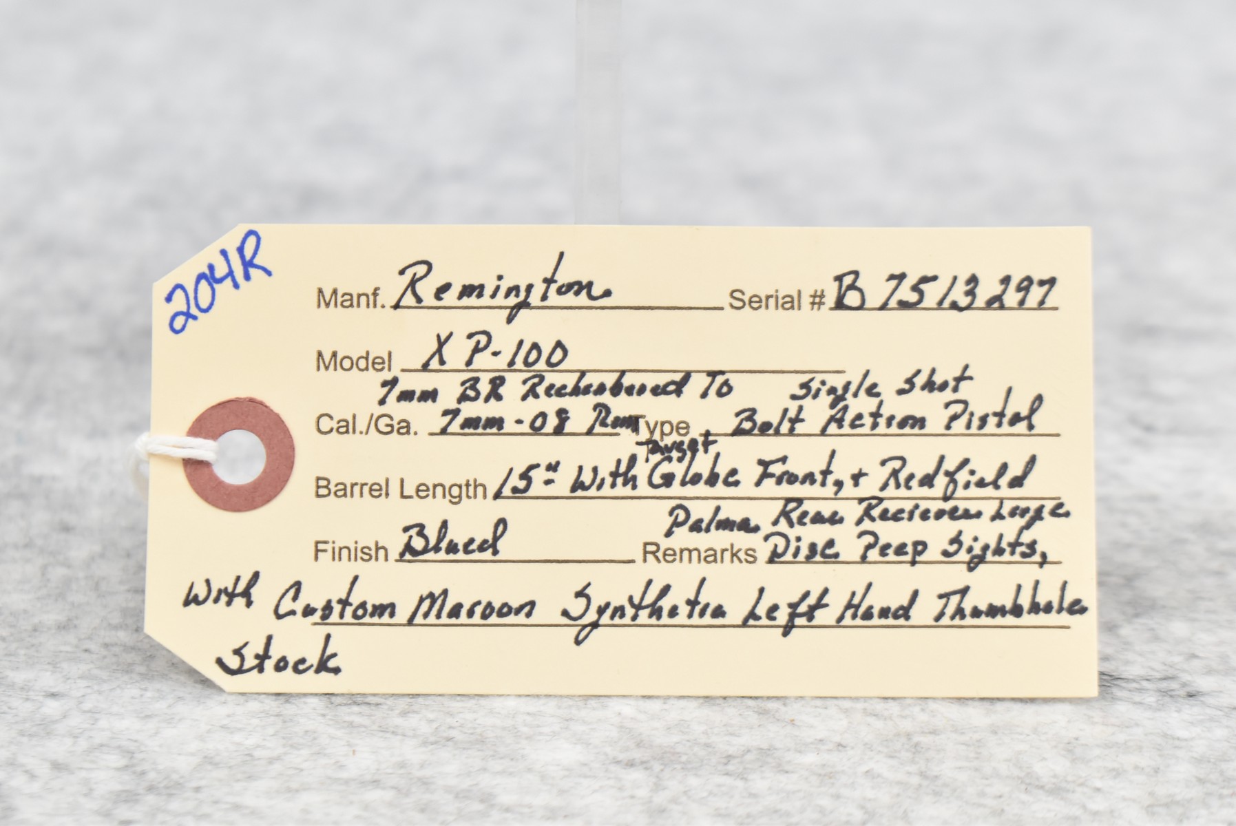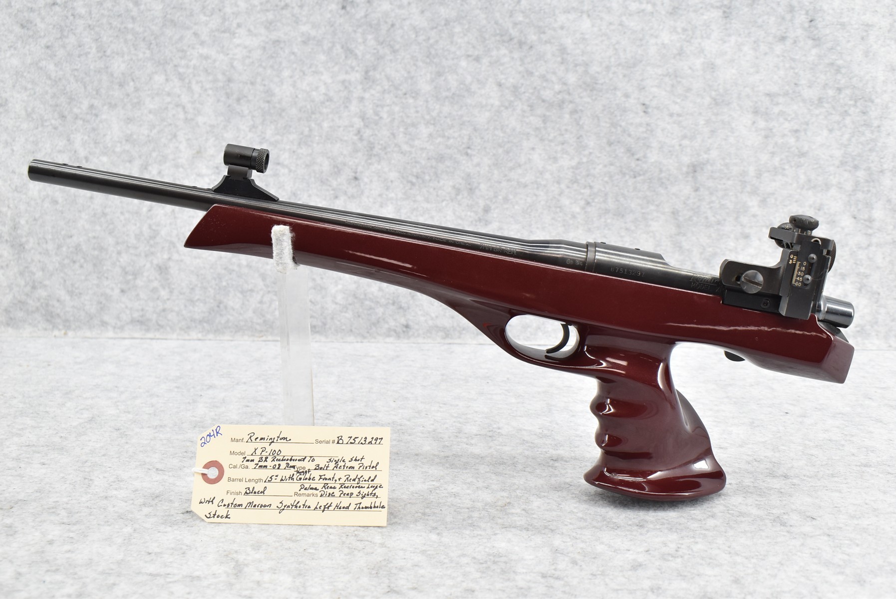 204R. Remington – Mod. XP-100 – 7mm BR Re-Chambered to 7mm-08 Rem. Cal. Bolt Action Single Shot Pistol – w/15” Barrel w/Target Globe Front & Redfield Palma Rear Receiver Large Disc Peep Sights – Blued Finish – w/Custom Maroon Synthetic Left Hand Thumb-Hole Stock