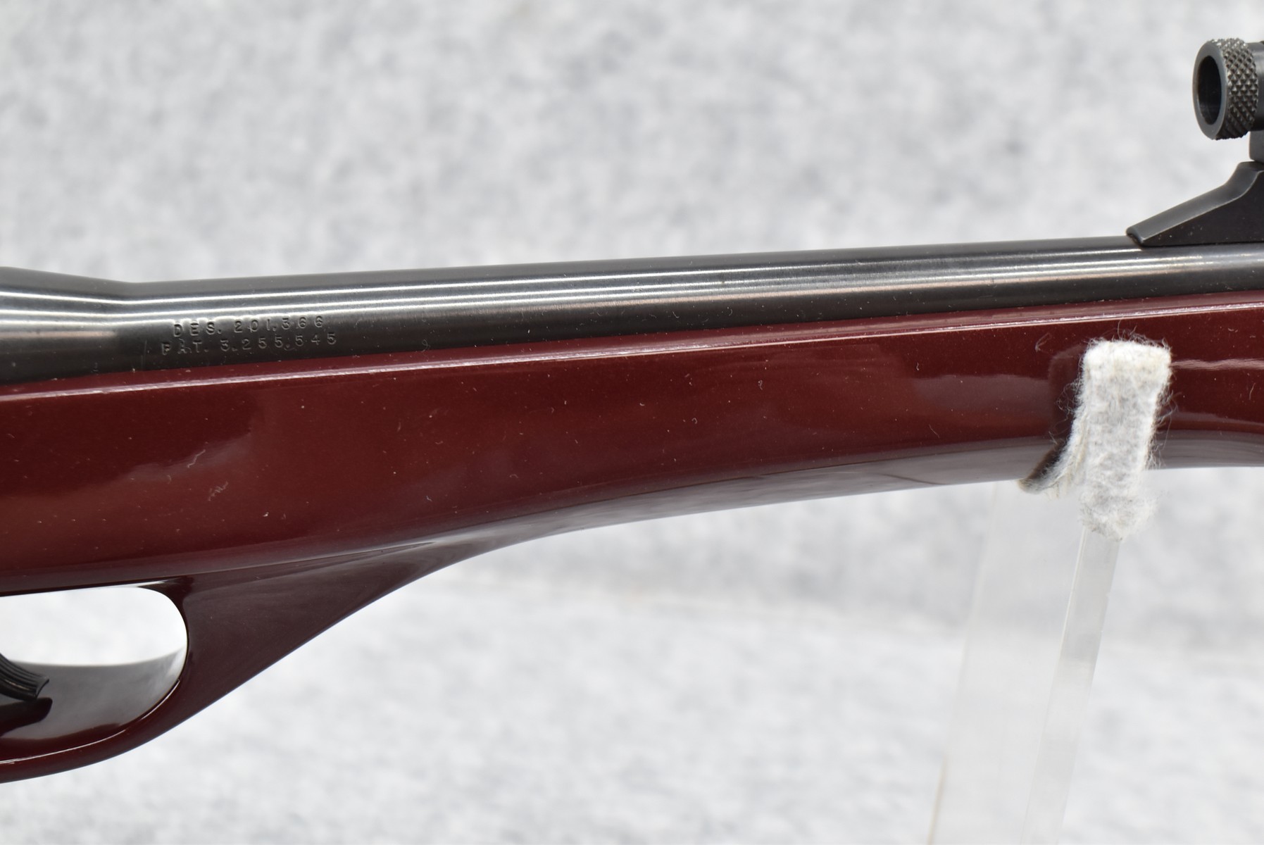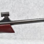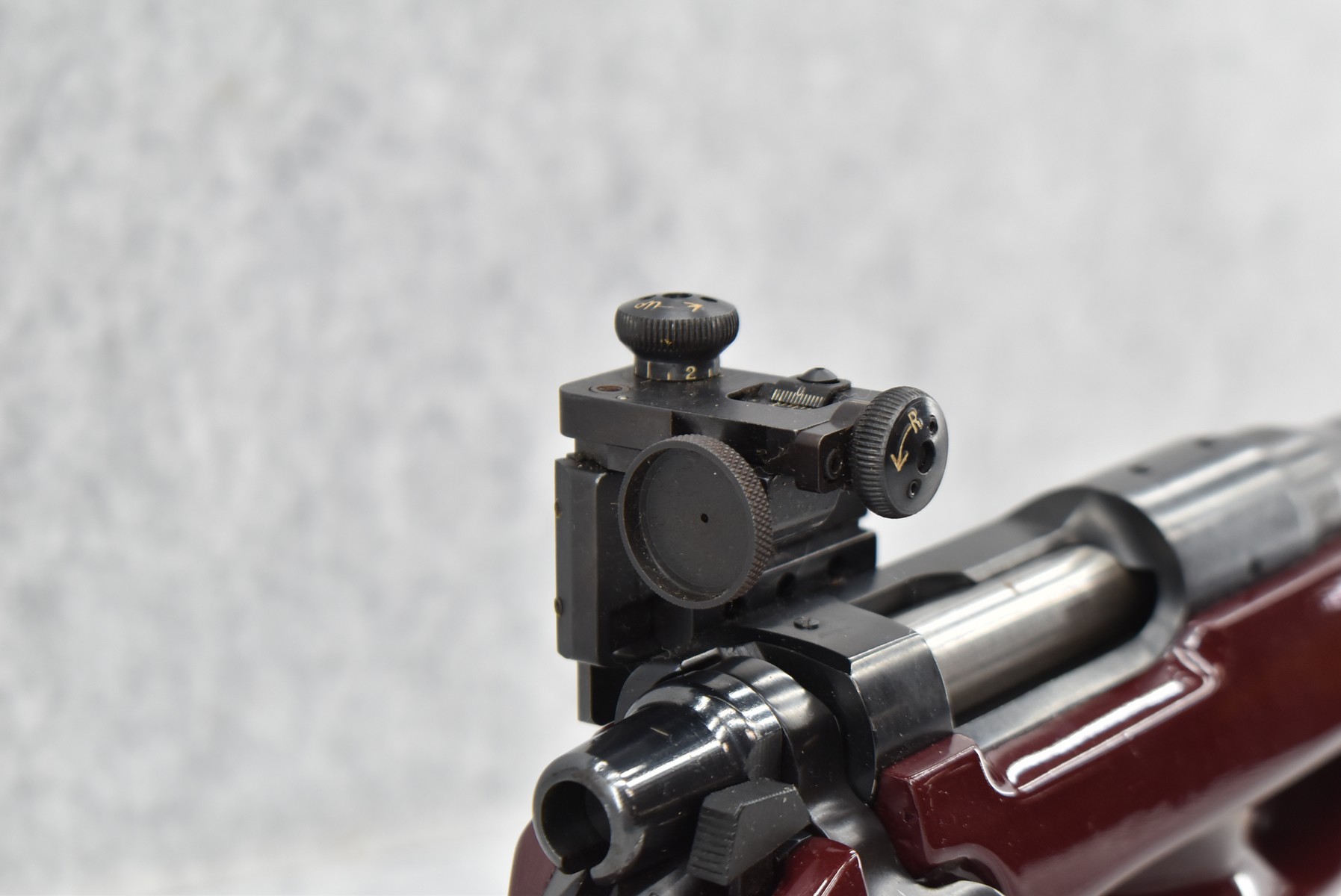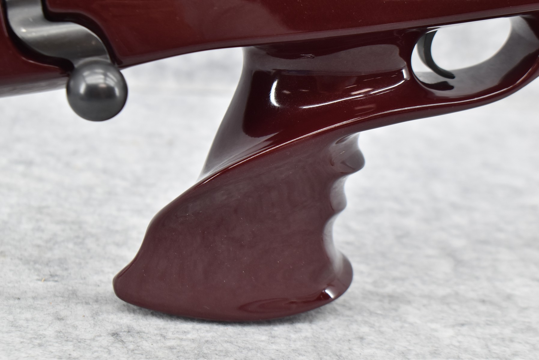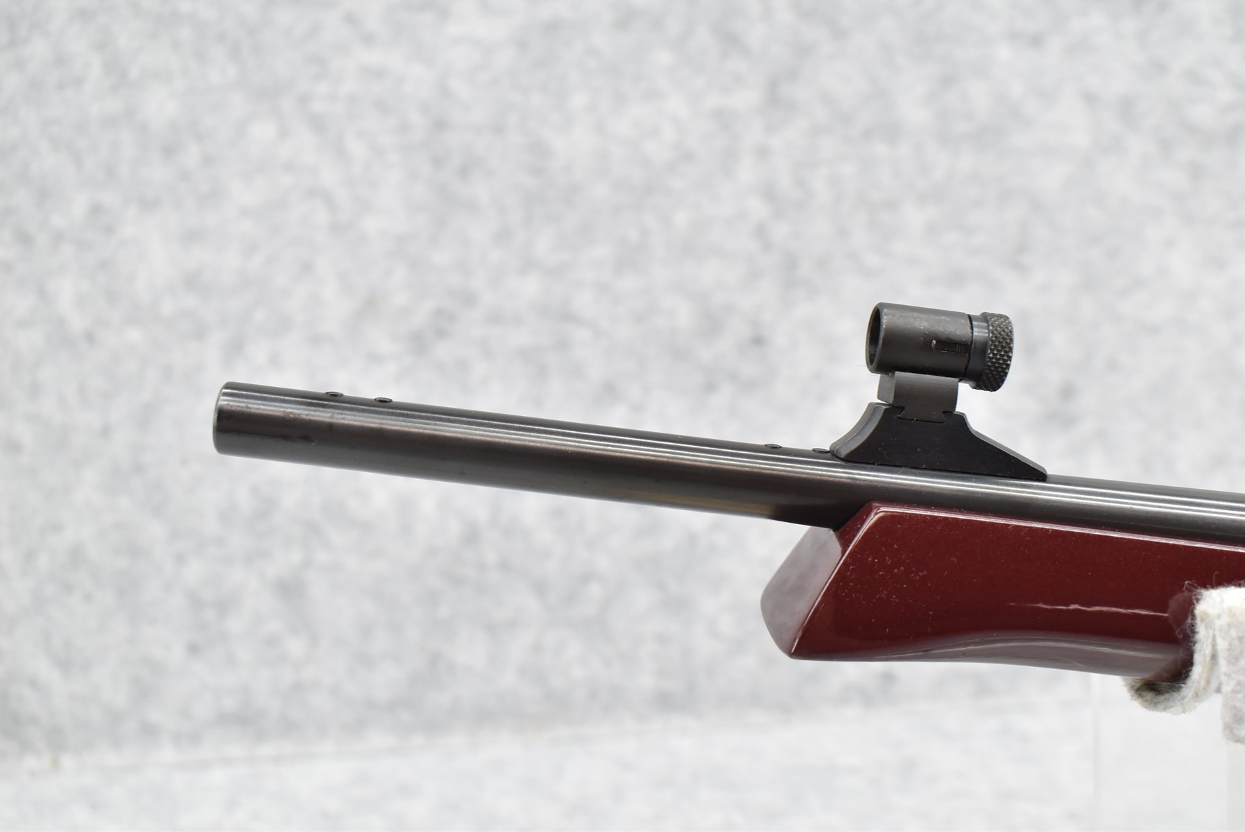 204R. Remington – Mod. XP-100 – 7mm BR Re-Chambered to 7mm-08 Rem. Cal. Bolt Action Single Shot Pistol – w/15” Barrel w/Target Globe Front & Redfield Palma Rear Receiver Large Disc Peep Sights – Blued Finish – w/Custom Maroon Synthetic Left Hand Thumb-Hole Stock