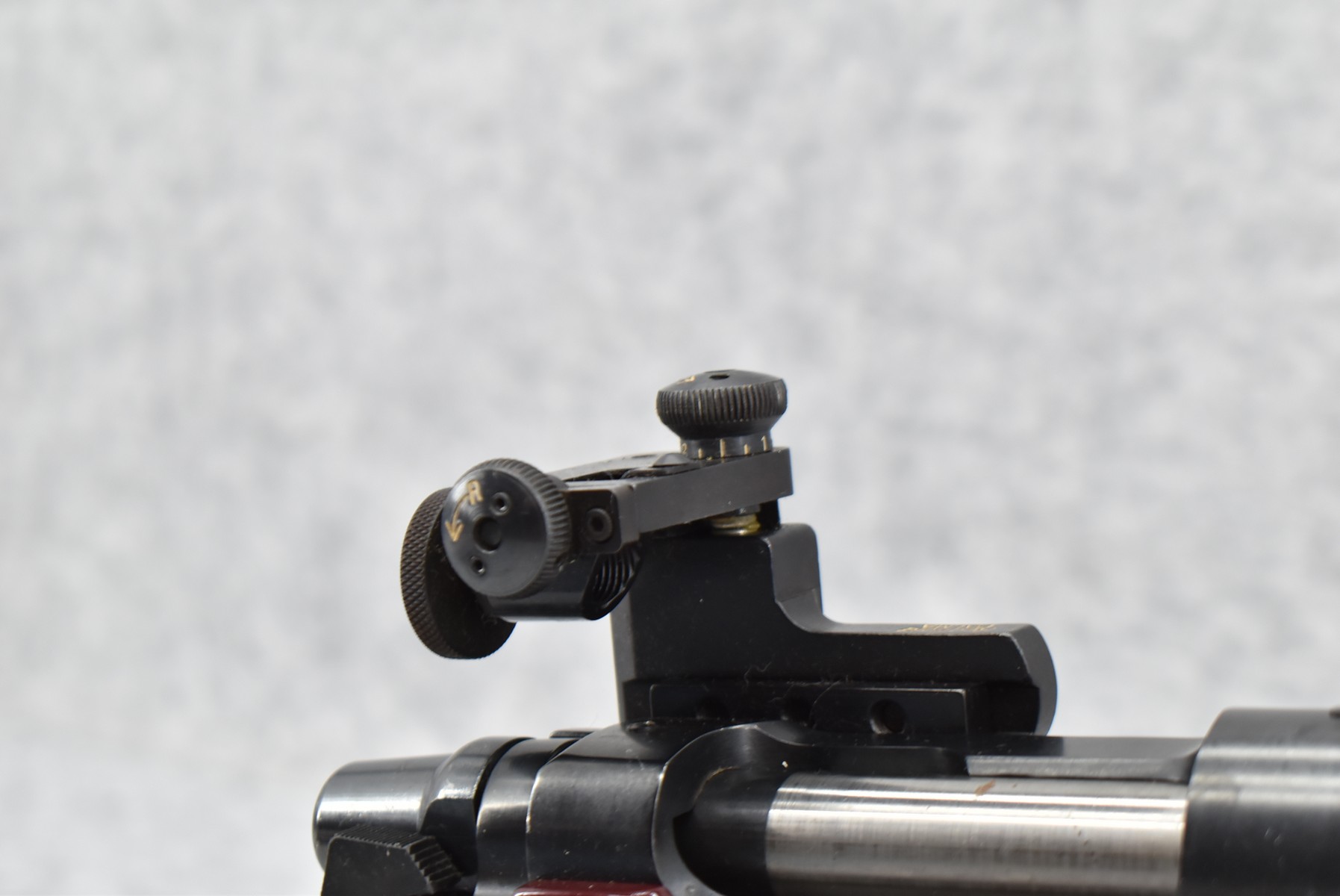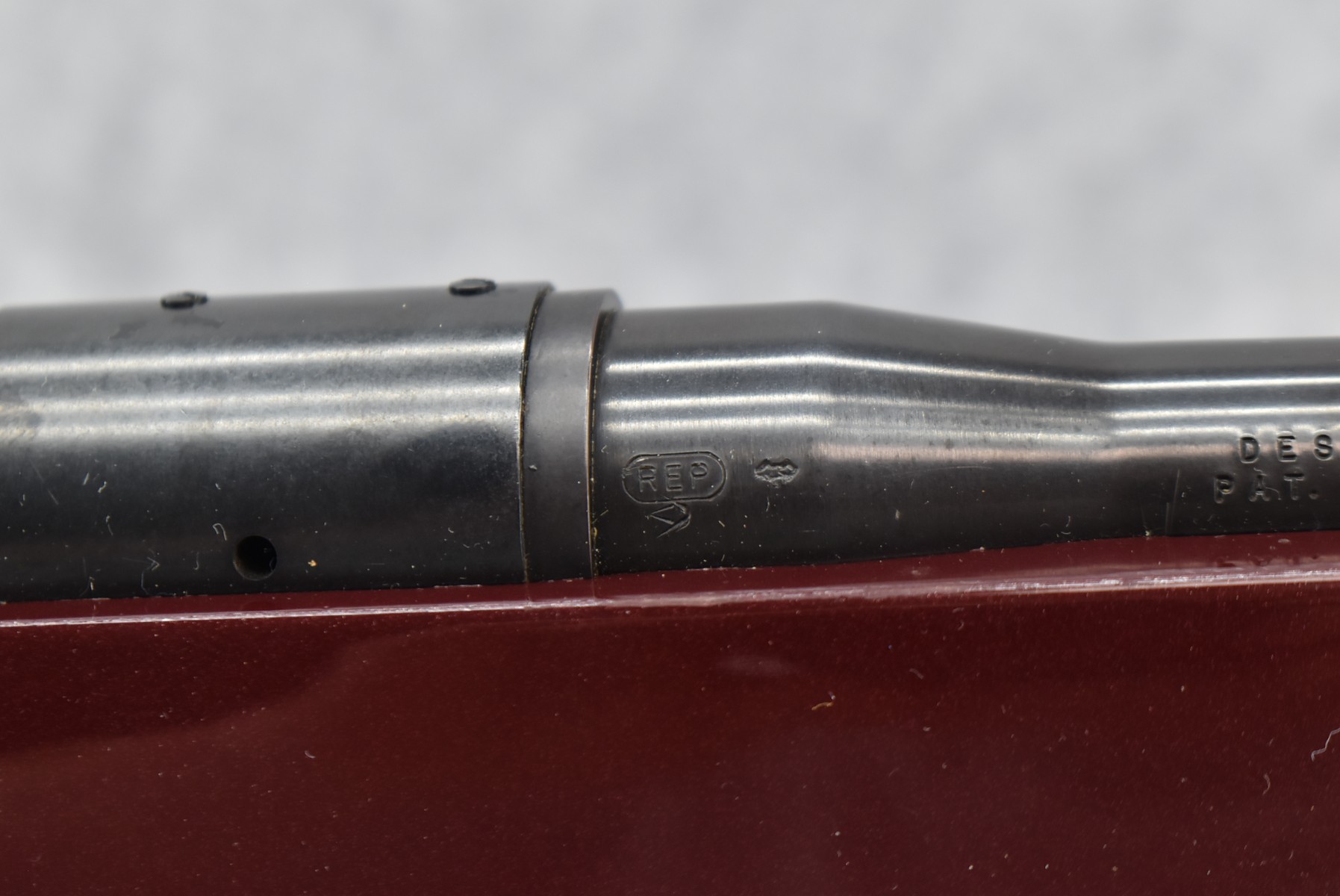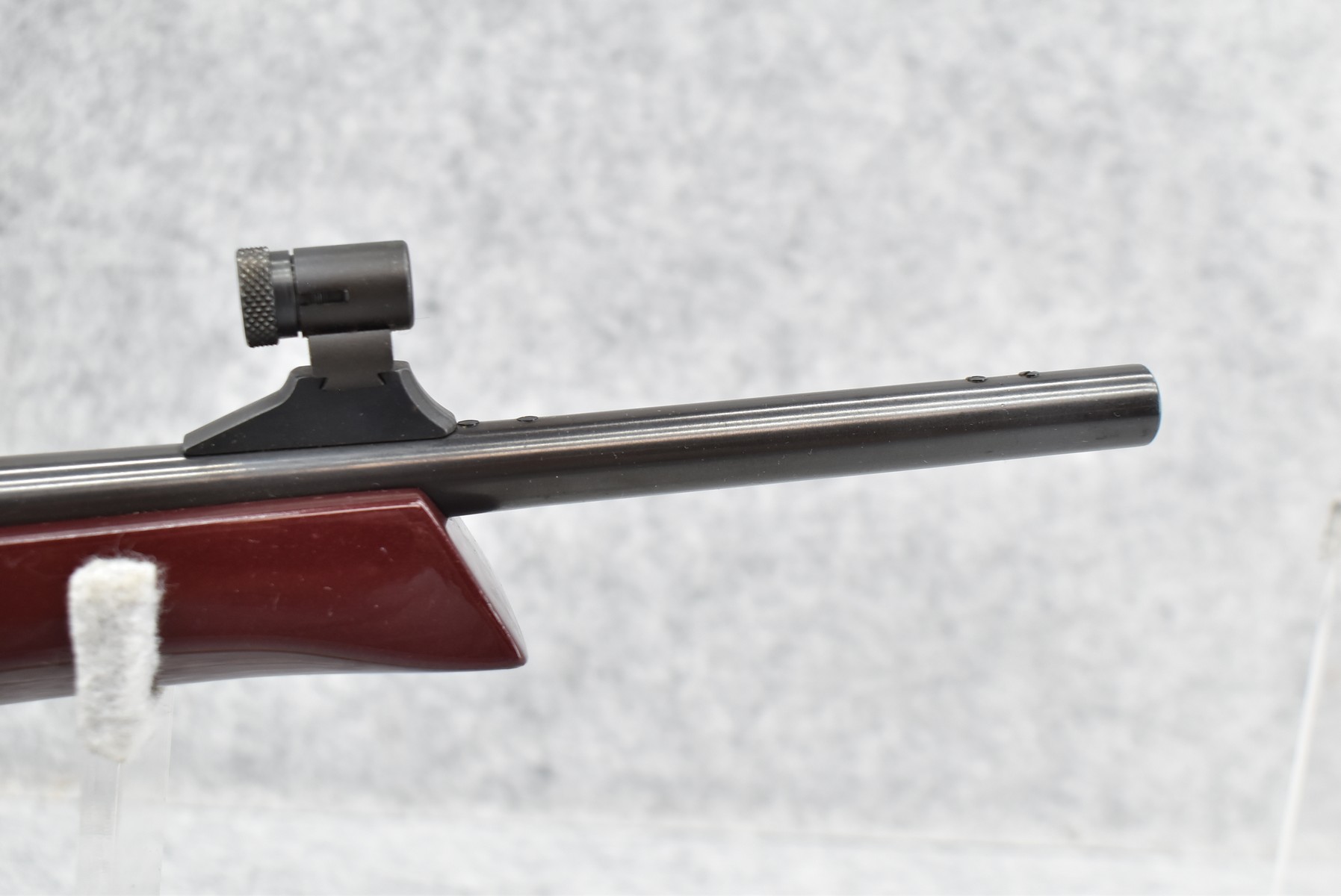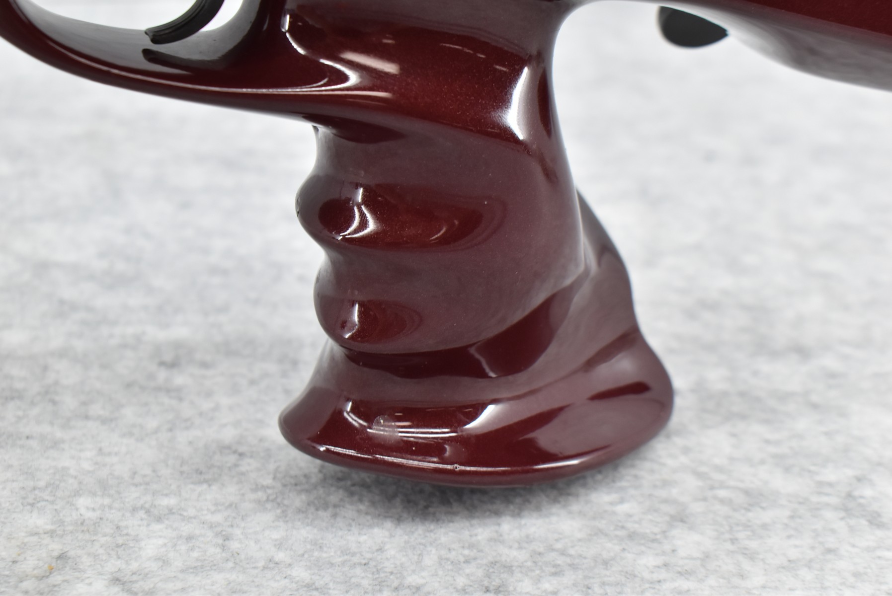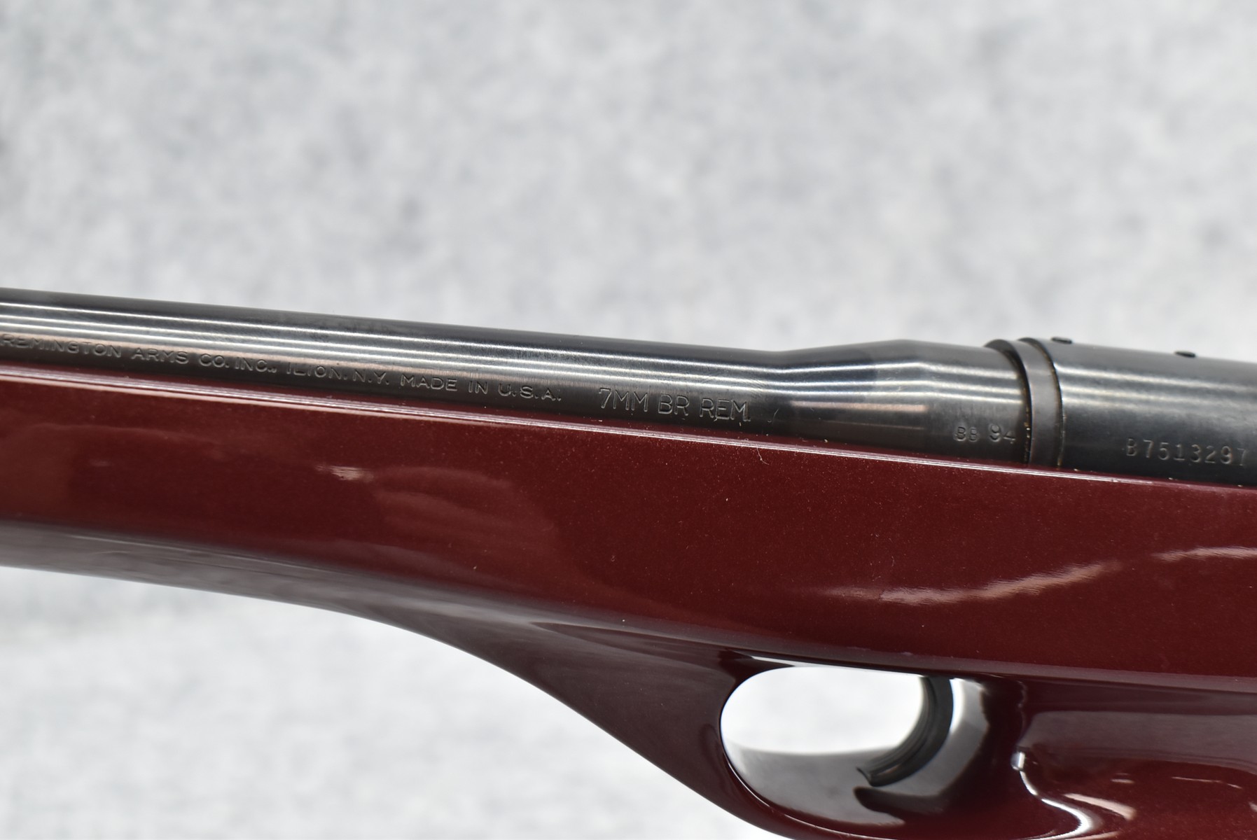 204R. Remington – Mod. XP-100 – 7mm BR Re-Chambered to 7mm-08 Rem. Cal. Bolt Action Single Shot Pistol – w/15” Barrel w/Target Globe Front & Redfield Palma Rear Receiver Large Disc Peep Sights – Blued Finish – w/Custom Maroon Synthetic Left Hand Thumb-Hole Stock