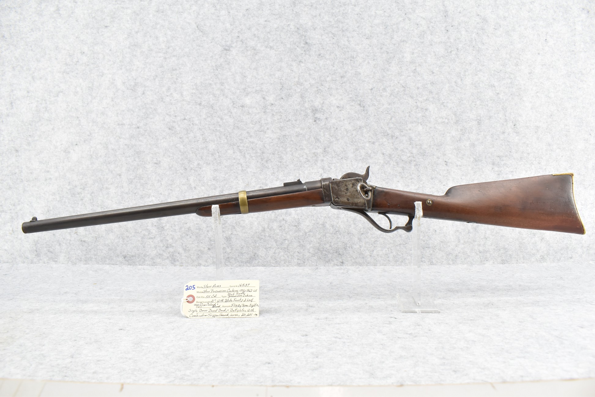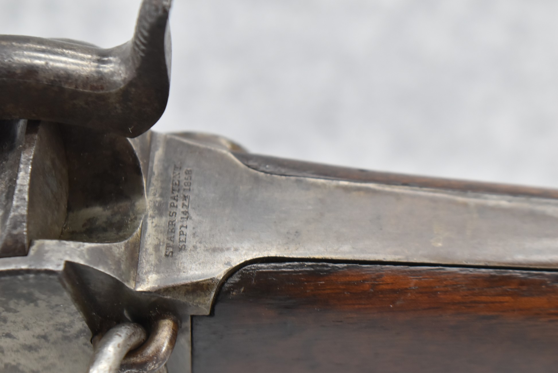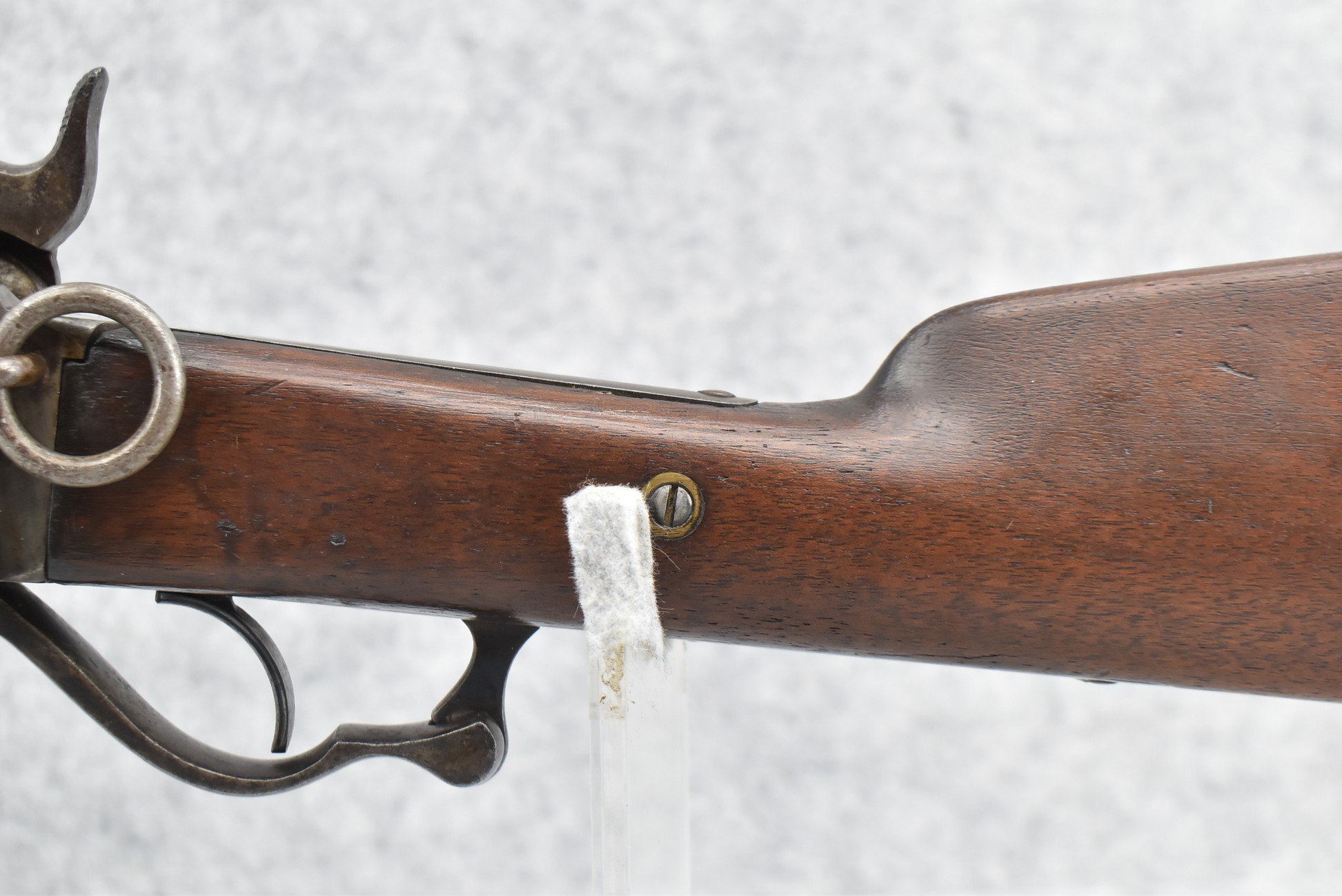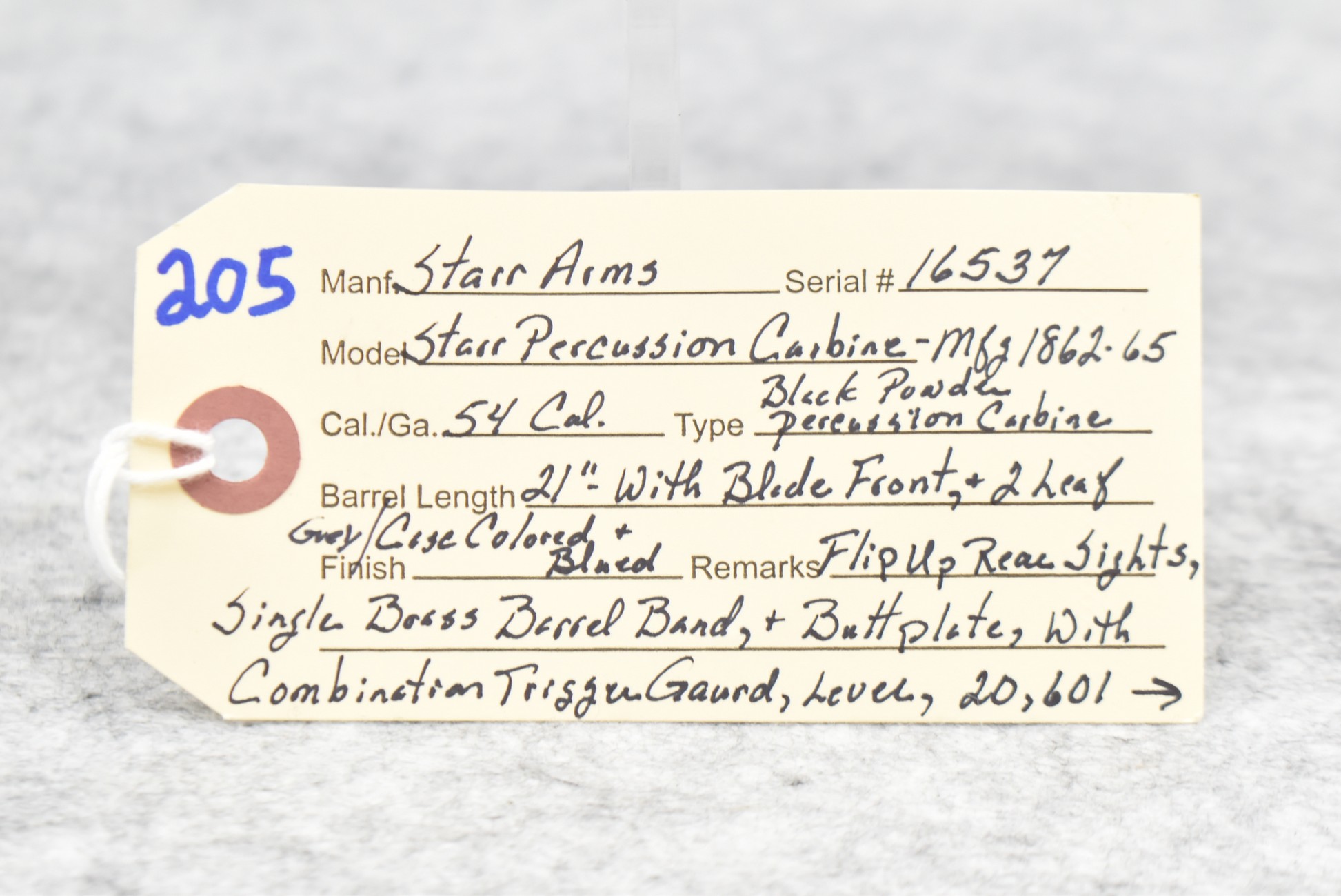 205. Starr Arms – Mod. Starr Percussion Carbine – 54 Cal. Percussion Black Powder Carbine – w/21” Barrel w/Blade Front & 2-Leaf Flip Up Rear Sights – Gray/Case Colored/Blued Finish – w/Straight Grip Wood Stock w/Single Brass Barrel Band & Butt Plate – w/Combination Trigger Guard/Lever – 20,601 Total Mfg. Between 1862-1865