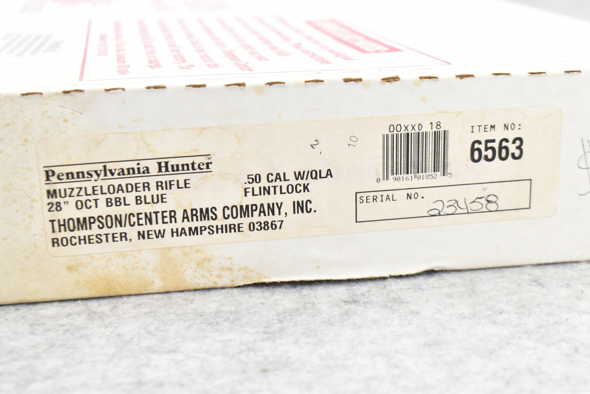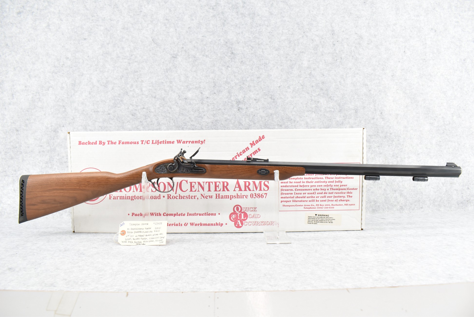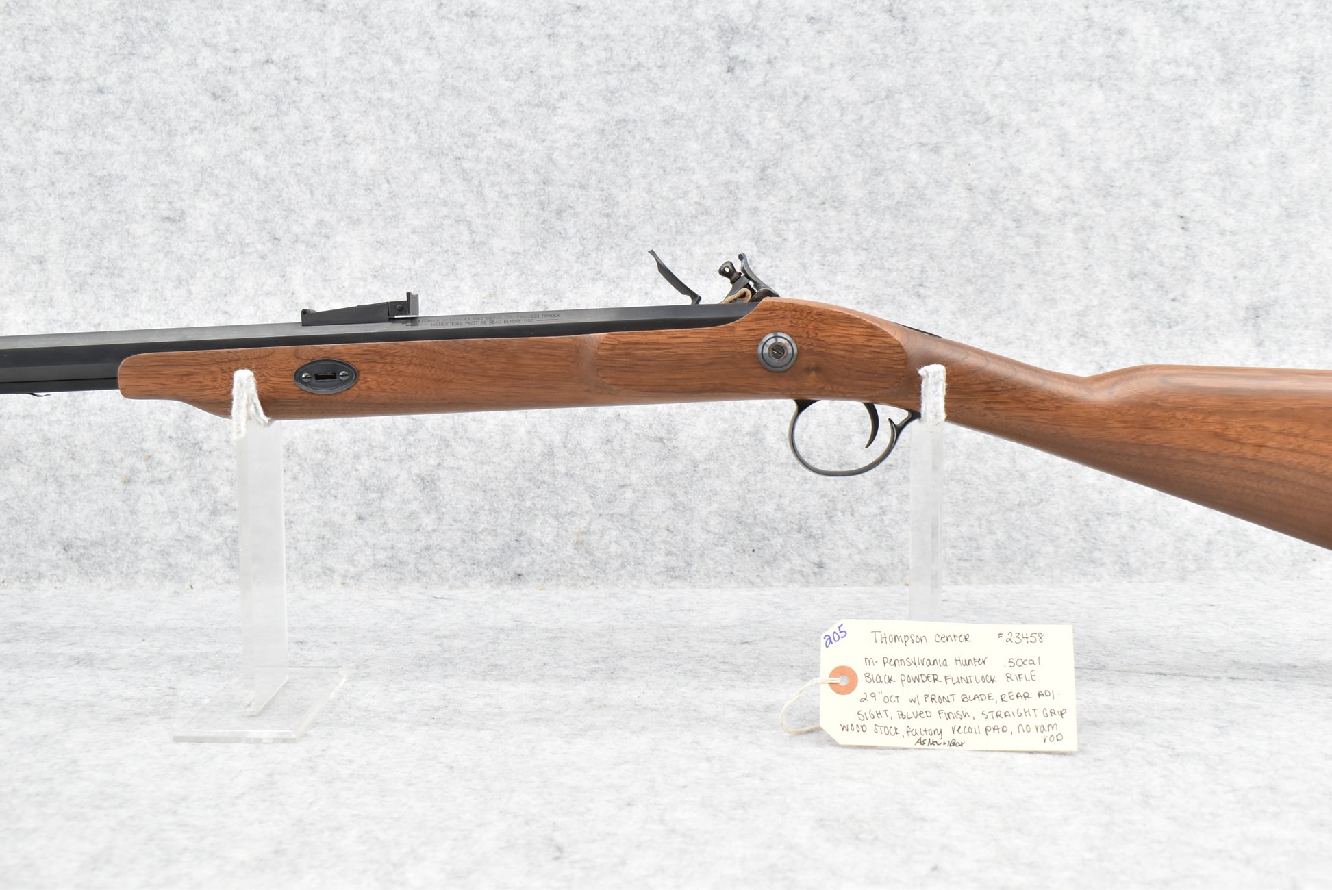 205. Thompson Center – Mod. Pennsylvania Hunter – 50 Cal. Black Powder Flintlock Rifle – w/29” Octagon Barrel w/Blade Front and Adjustable Rear Sights – Blued Finish – w/Straight Grip Wood Stock w/Factory Recoil Pad – No Ramrod – As New w/Box