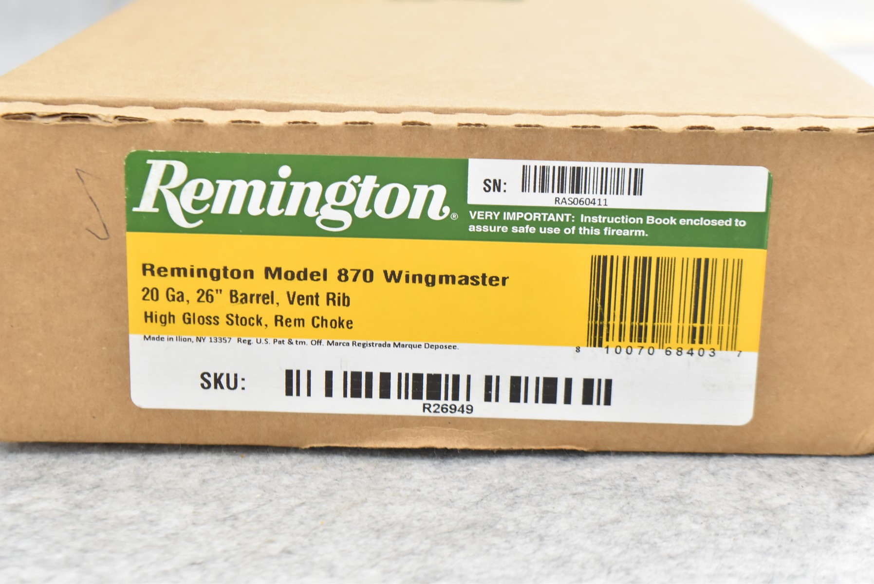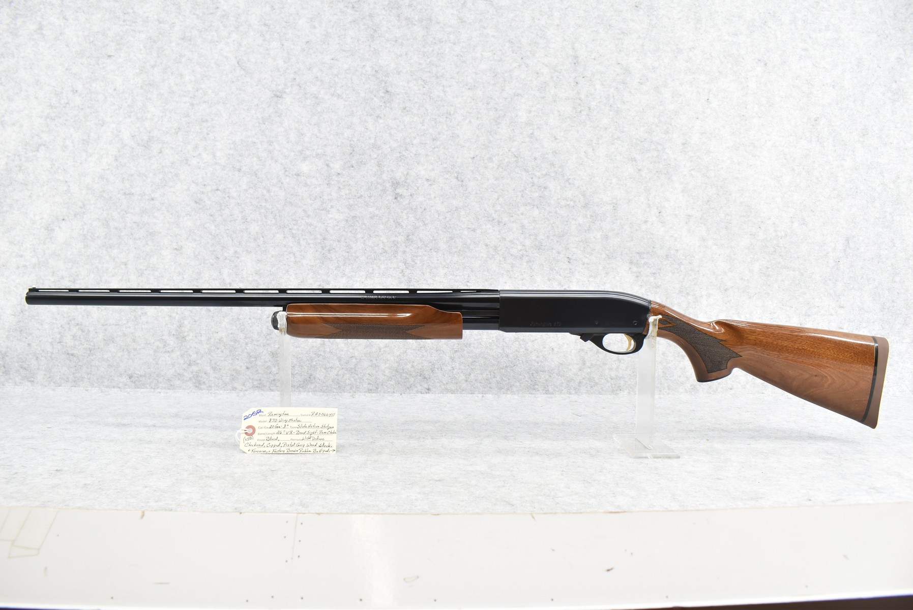 205R. Remington – Mod. 870 Wingmaster – 20ga. 3” Pump Action Shotgun – w/26” Rem. Choke, Vent-Rib Barrel w/Bead Sight – Blued Finish – w/Deluxe Checkered Capped Pistol Grip Wood Stocks w/Factory Butt Pad – New & Unfired w/Factory Box, Manual & Chokes