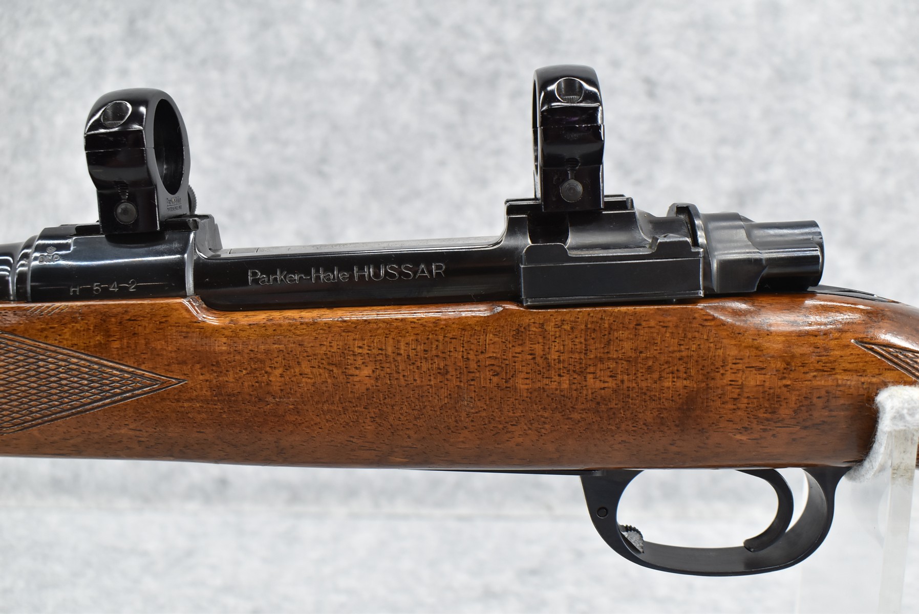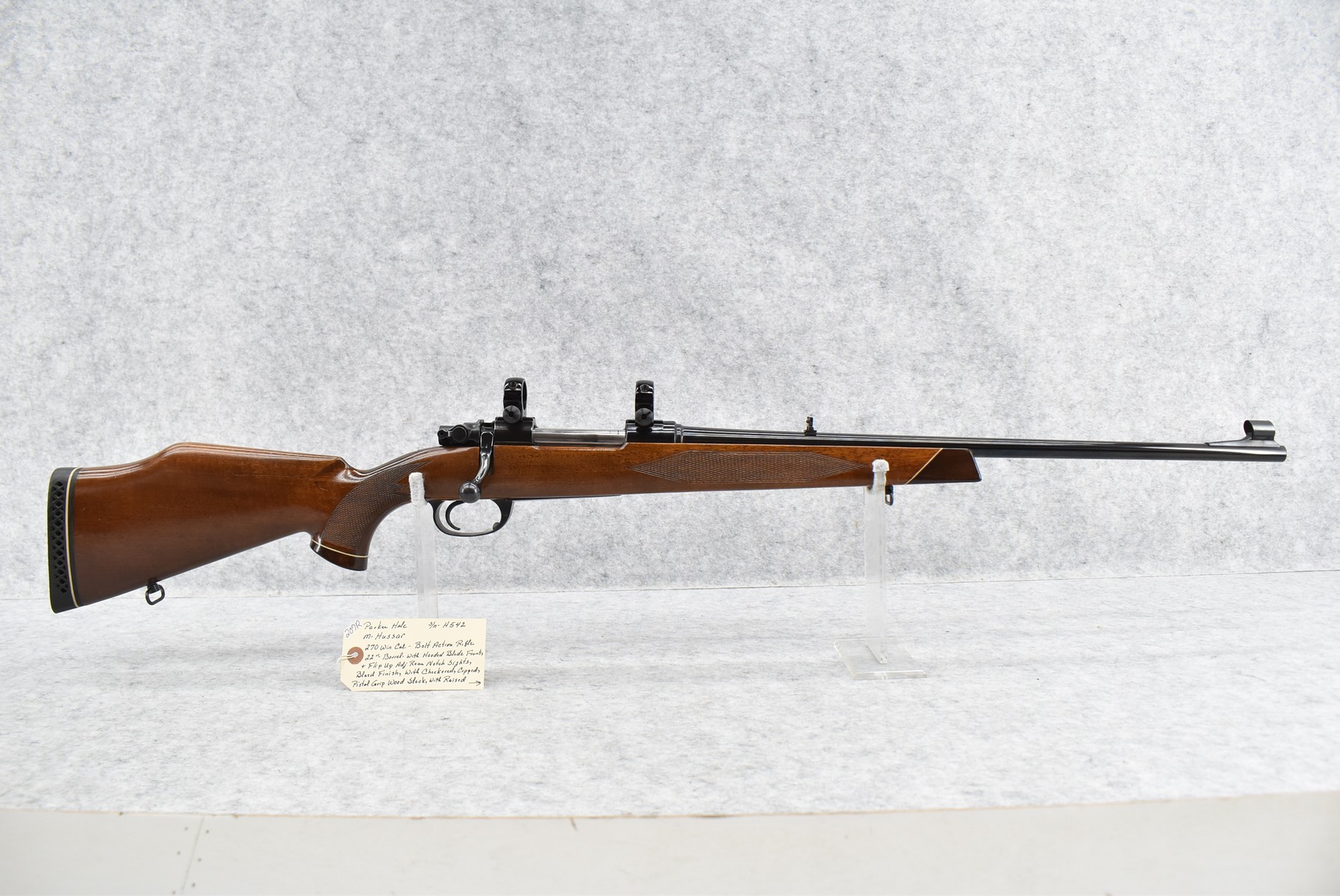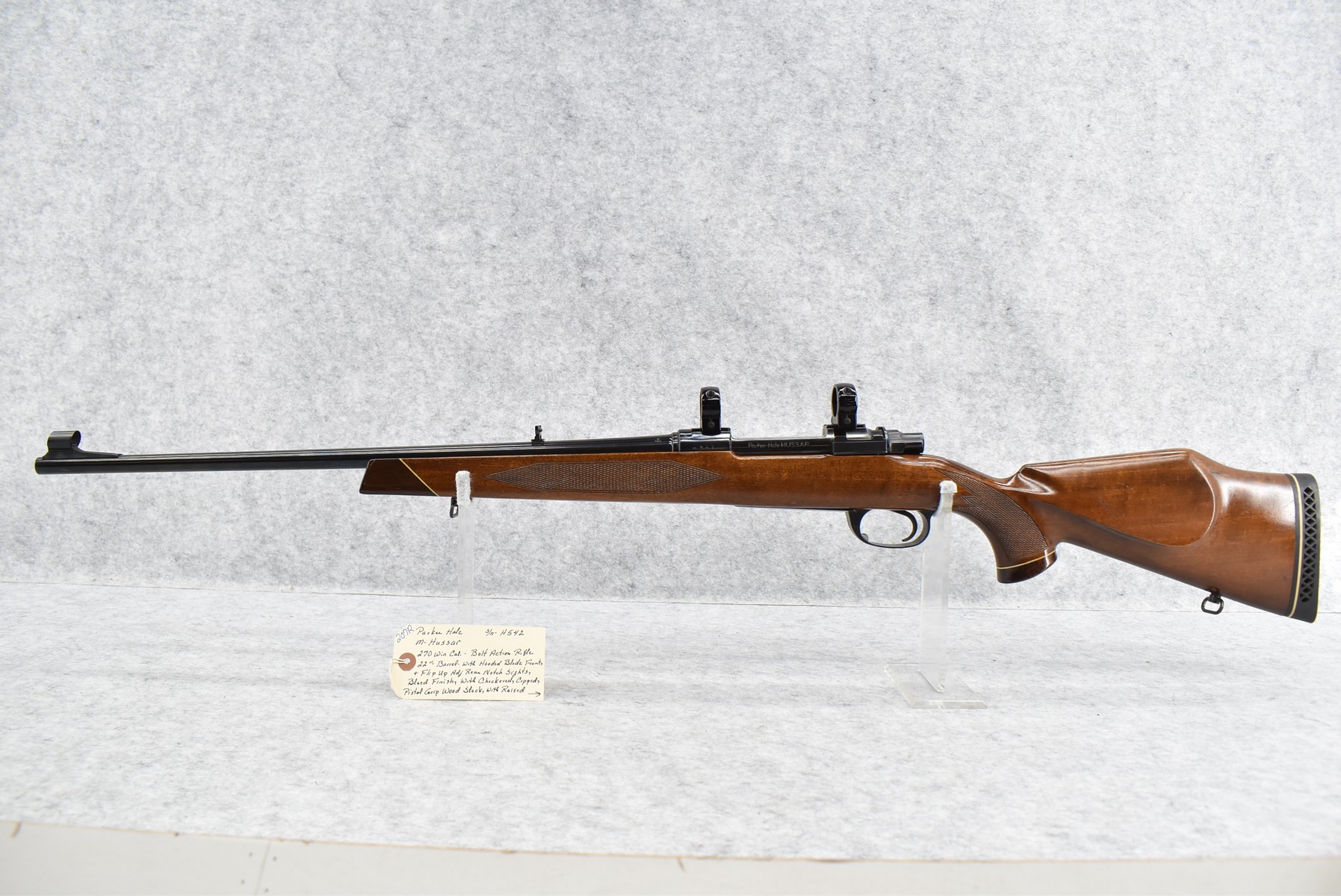 207R.     Parker Hale – Mod. Hussar – 270 Win. Cal. Bolt Action Rifle – w/22” Barrel w/Hooded Blade Front & Flip Up Adj. Rear Notch Sights – Blued Finish – w/Checkered Rosewood Capped Pistol Grip Wood Stock w/Raised Cheek Piece w/Pachmayr Butt Pad – w/Scope Mounting Rings