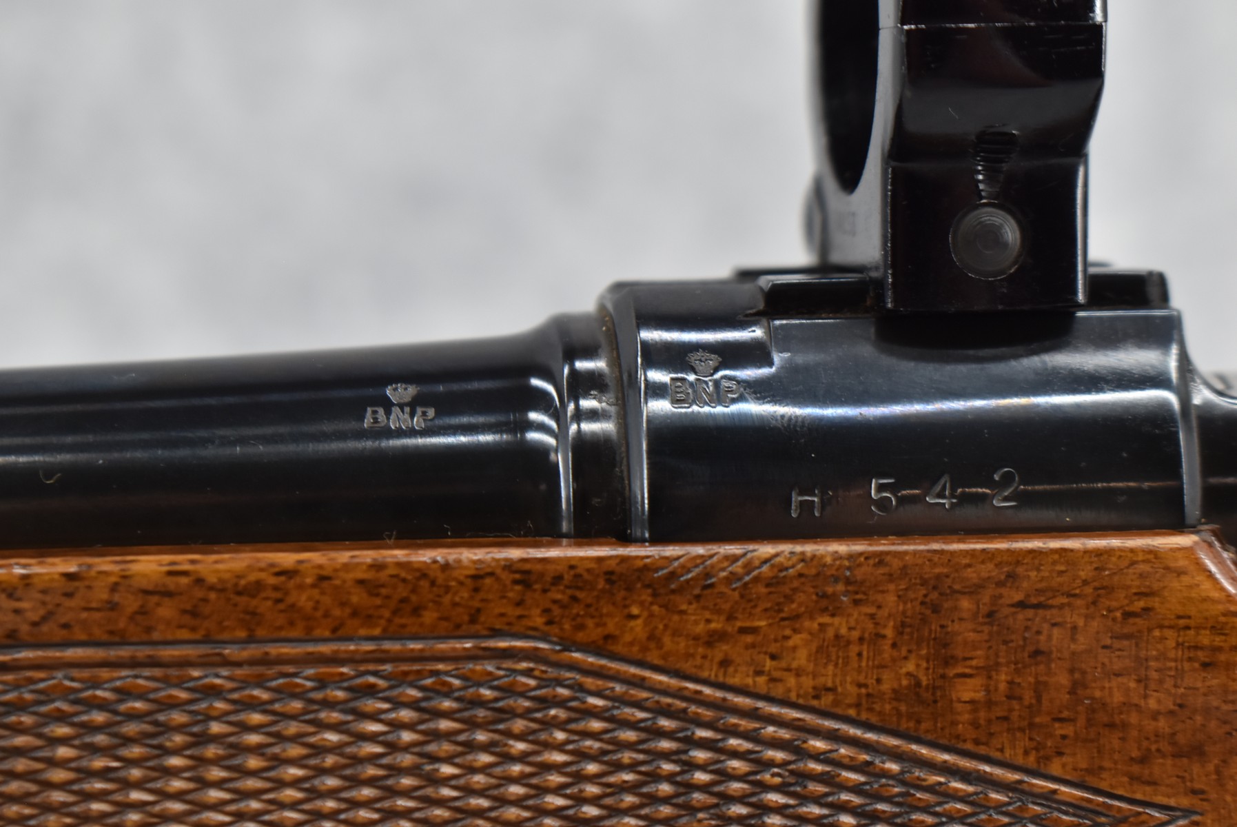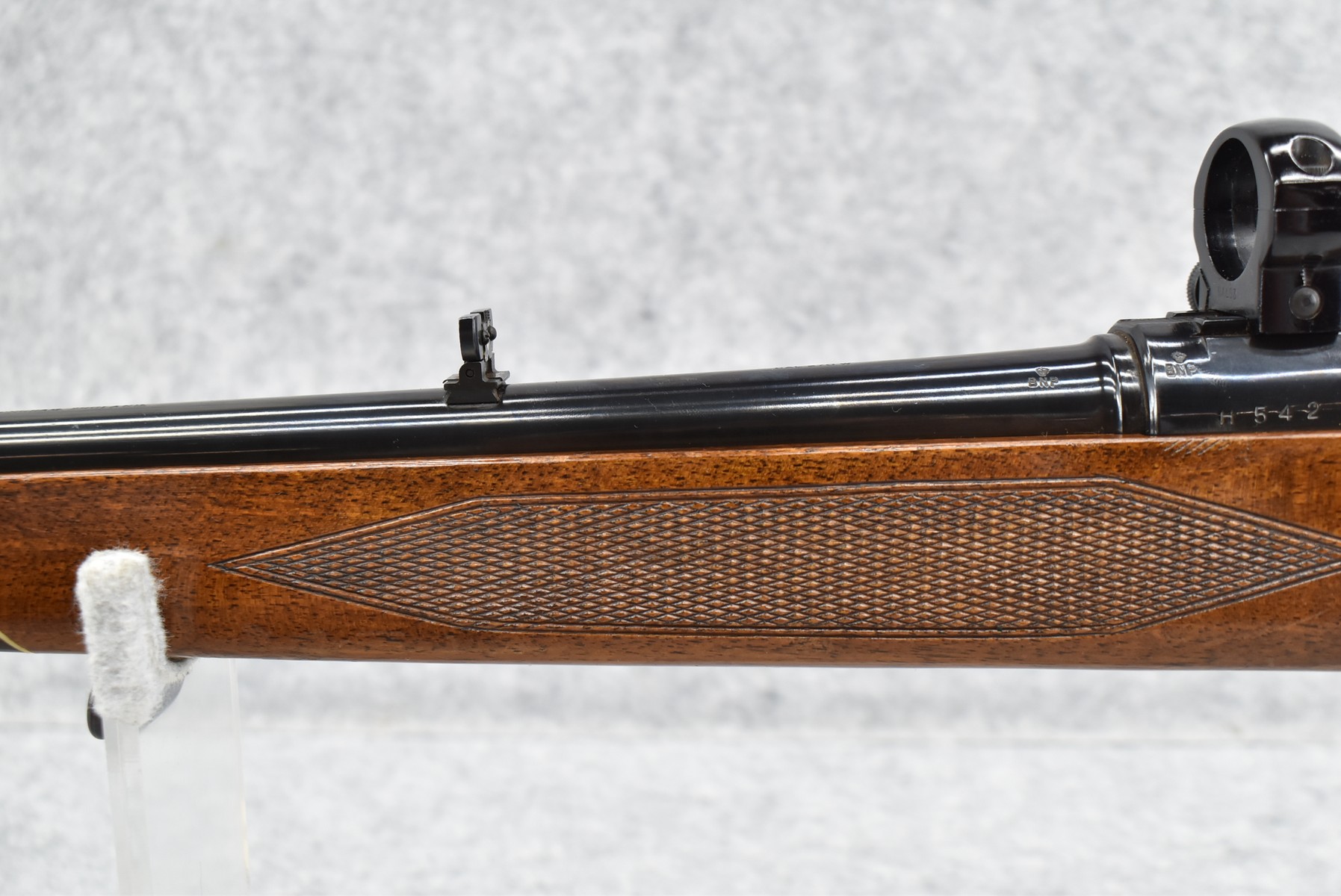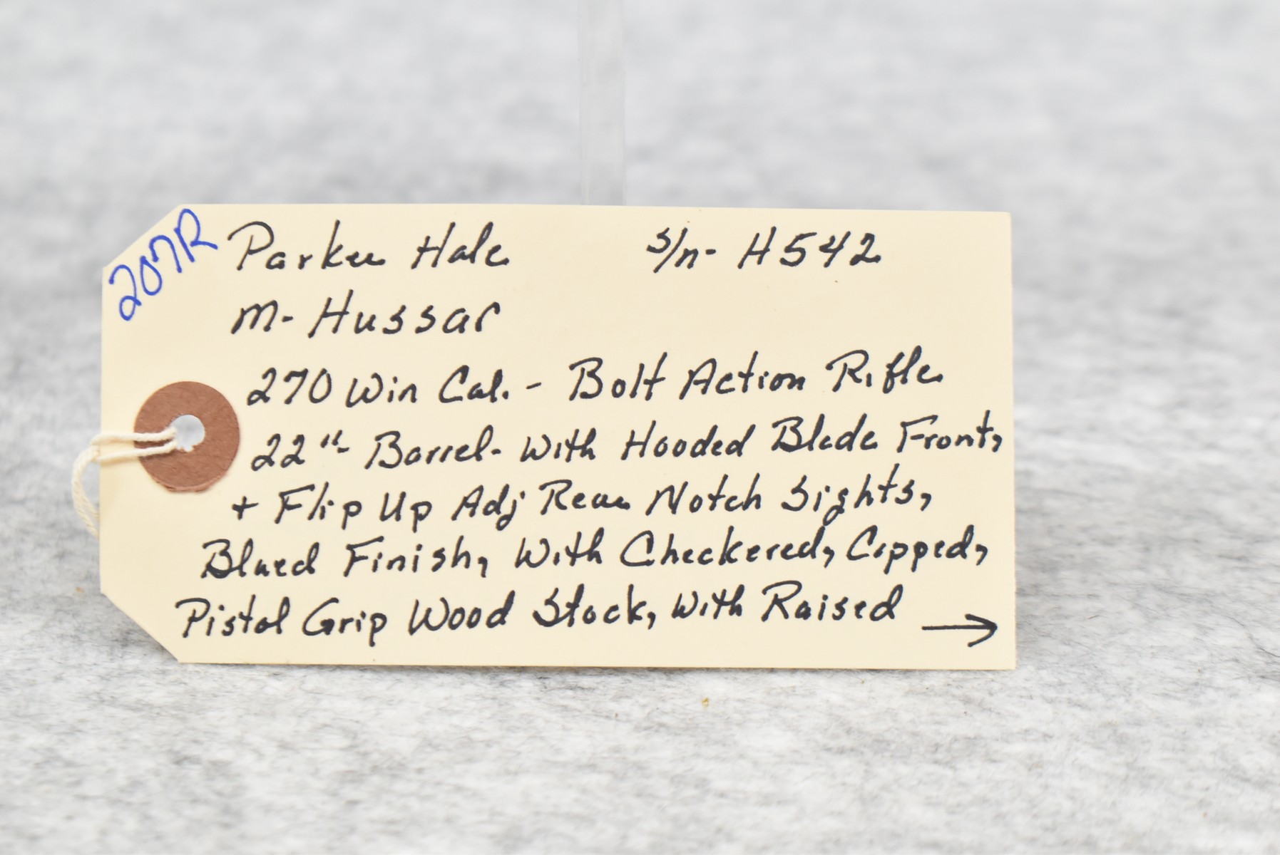 207R.     Parker Hale – Mod. Hussar – 270 Win. Cal. Bolt Action Rifle – w/22” Barrel w/Hooded Blade Front & Flip Up Adj. Rear Notch Sights – Blued Finish – w/Checkered Rosewood Capped Pistol Grip Wood Stock w/Raised Cheek Piece w/Pachmayr Butt Pad – w/Scope Mounting Rings
