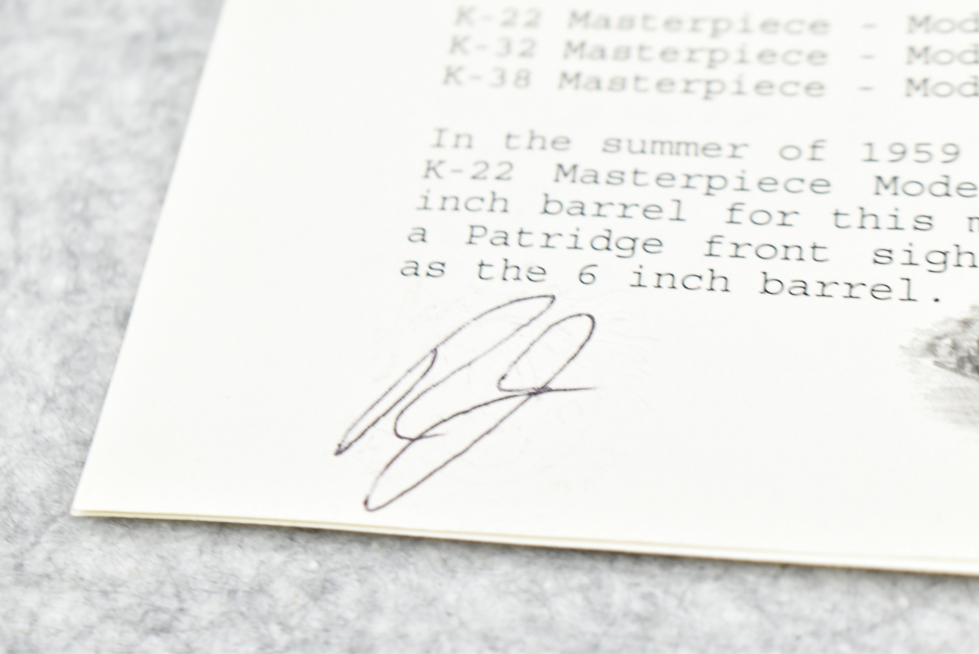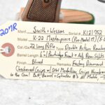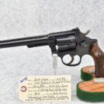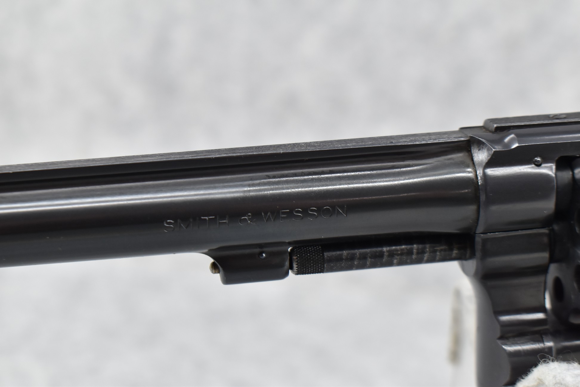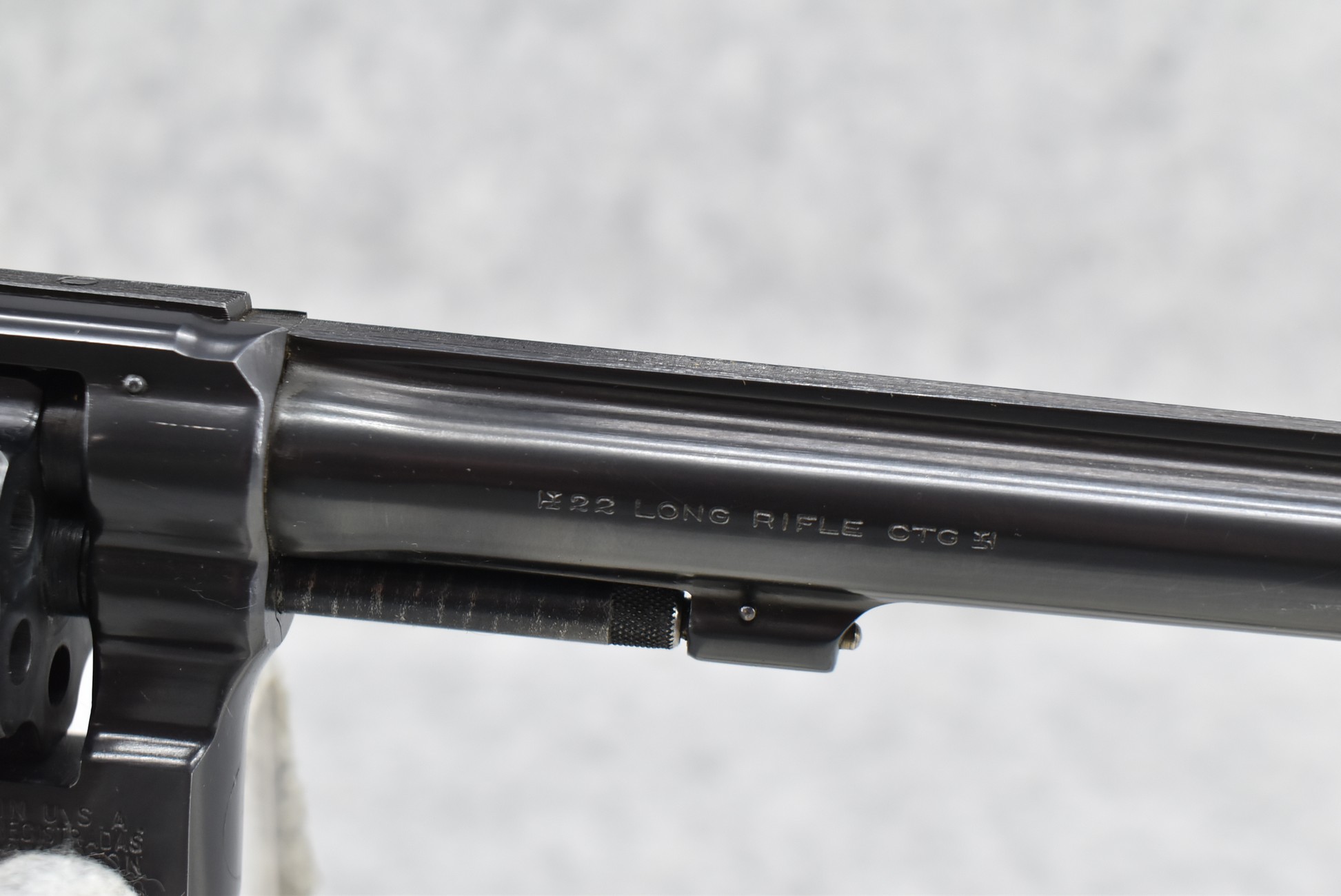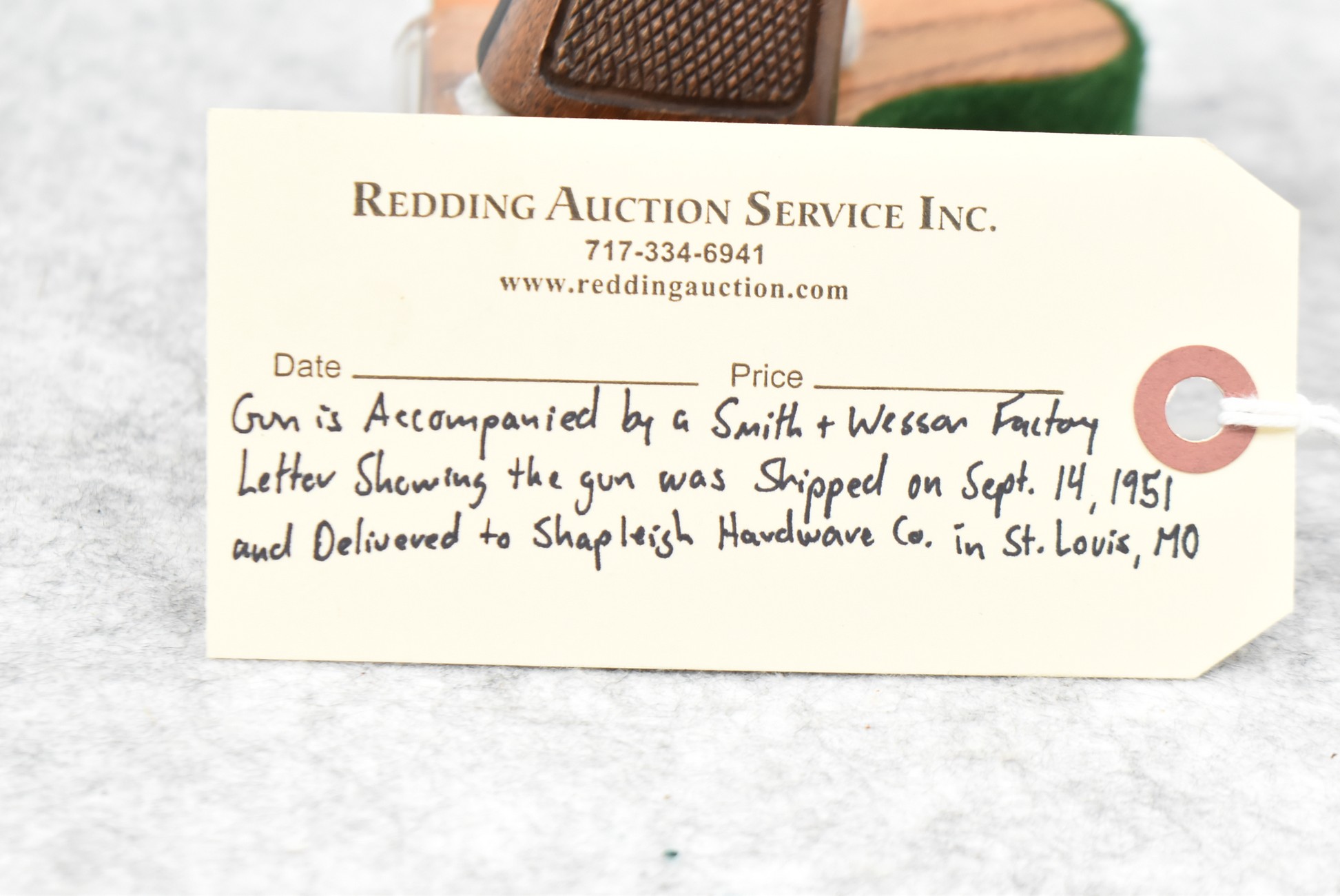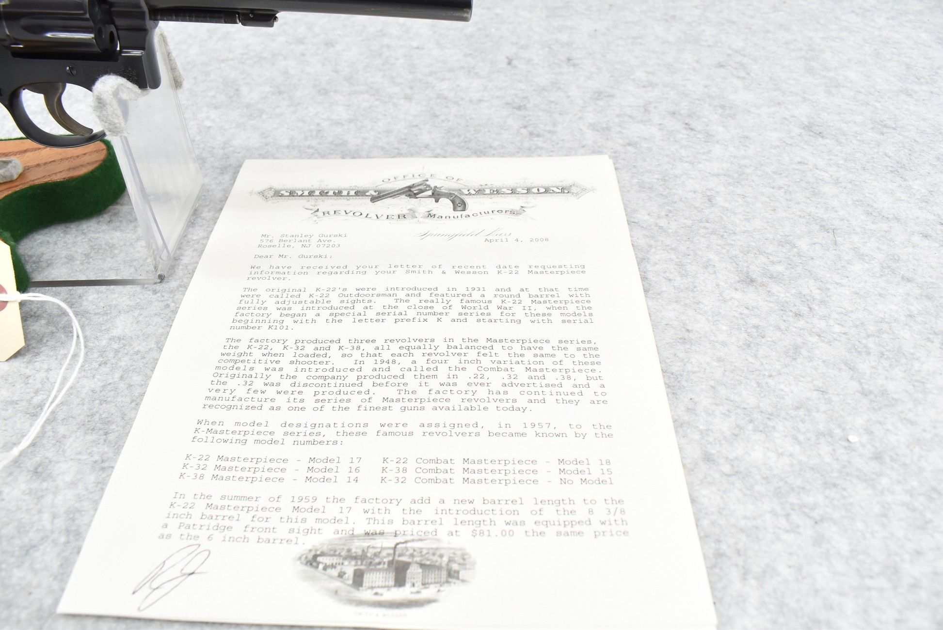 207R. Smith & Wesson – Mod. K-22 Masterpiece (Pre-Model 17) (5-Screw) – 22 Long Rifle Cal. Double Action Revolver – w/6” Barrel w/Partridge Front & Adj. Rear Sights – Blued Finish – w/Factory Diamond Checkered Grips w/S&W Medallion That Number to the Gun! – Butt, Barrel & Cylinder Numbers All Match! – Gun is Accompanied by a Smith & Wesson Factory Letter Showing the Gun Was Shipped on Sept. 14, 1951 & Delivered to Shapleigh Hardware Co. in St. Louis, MO