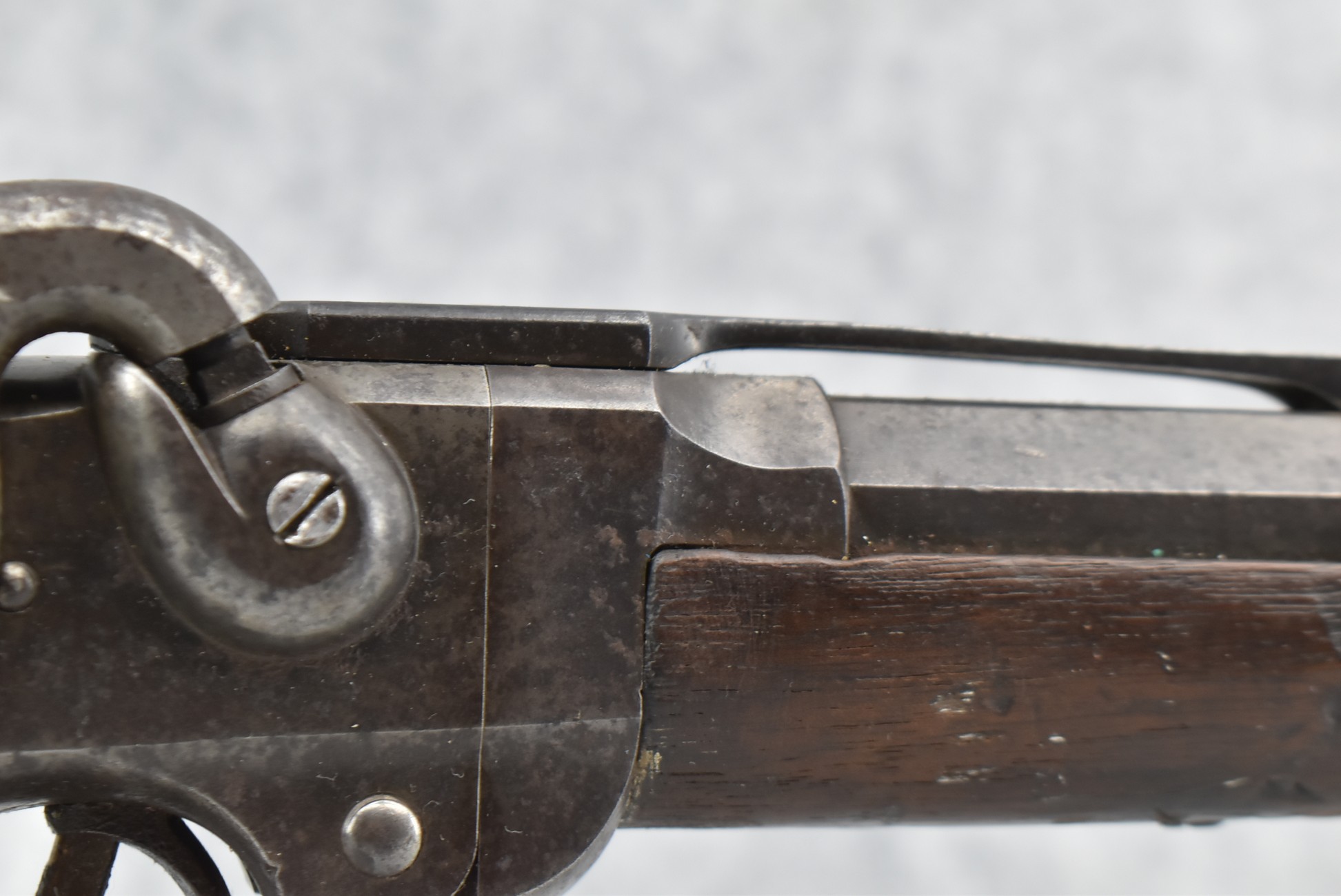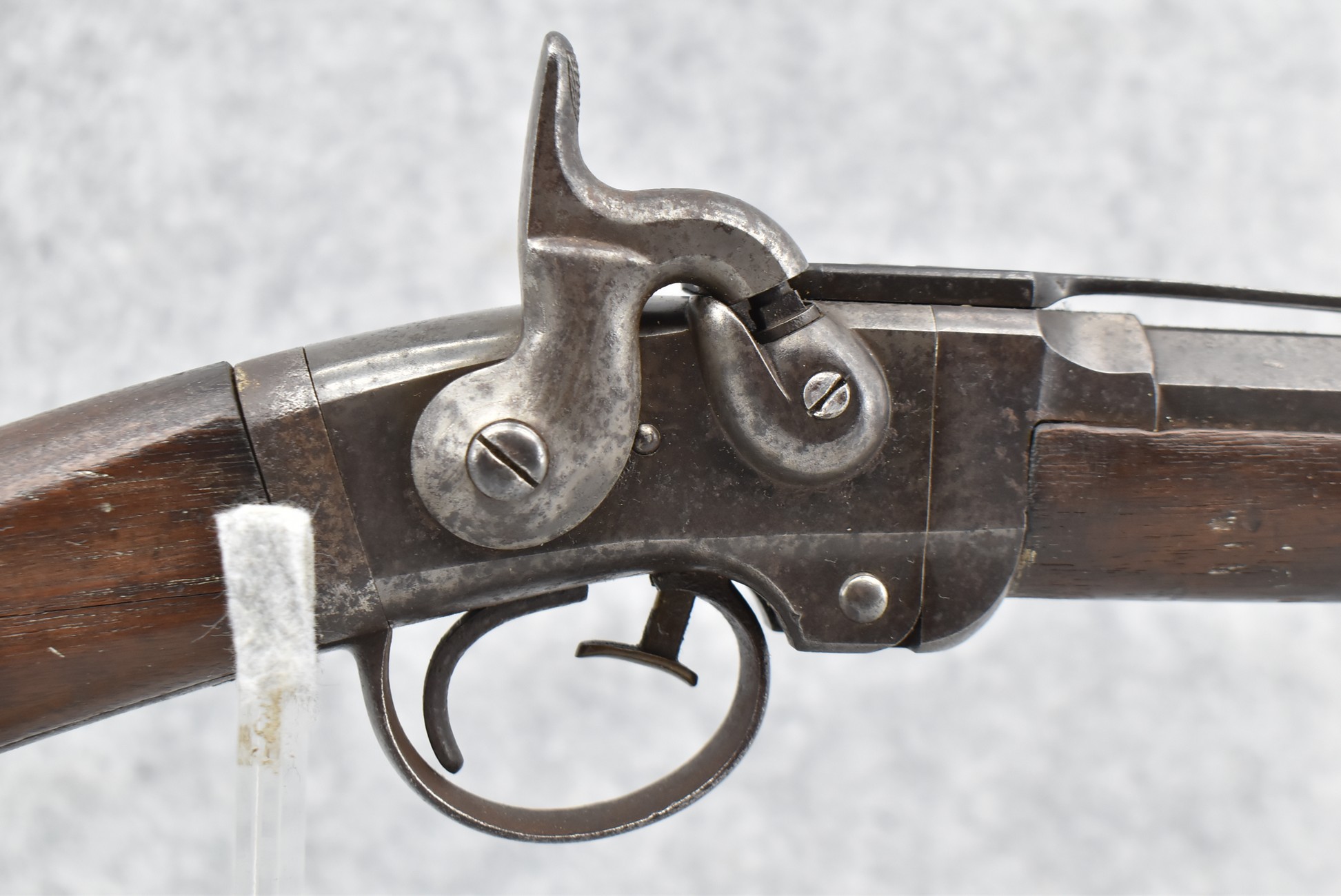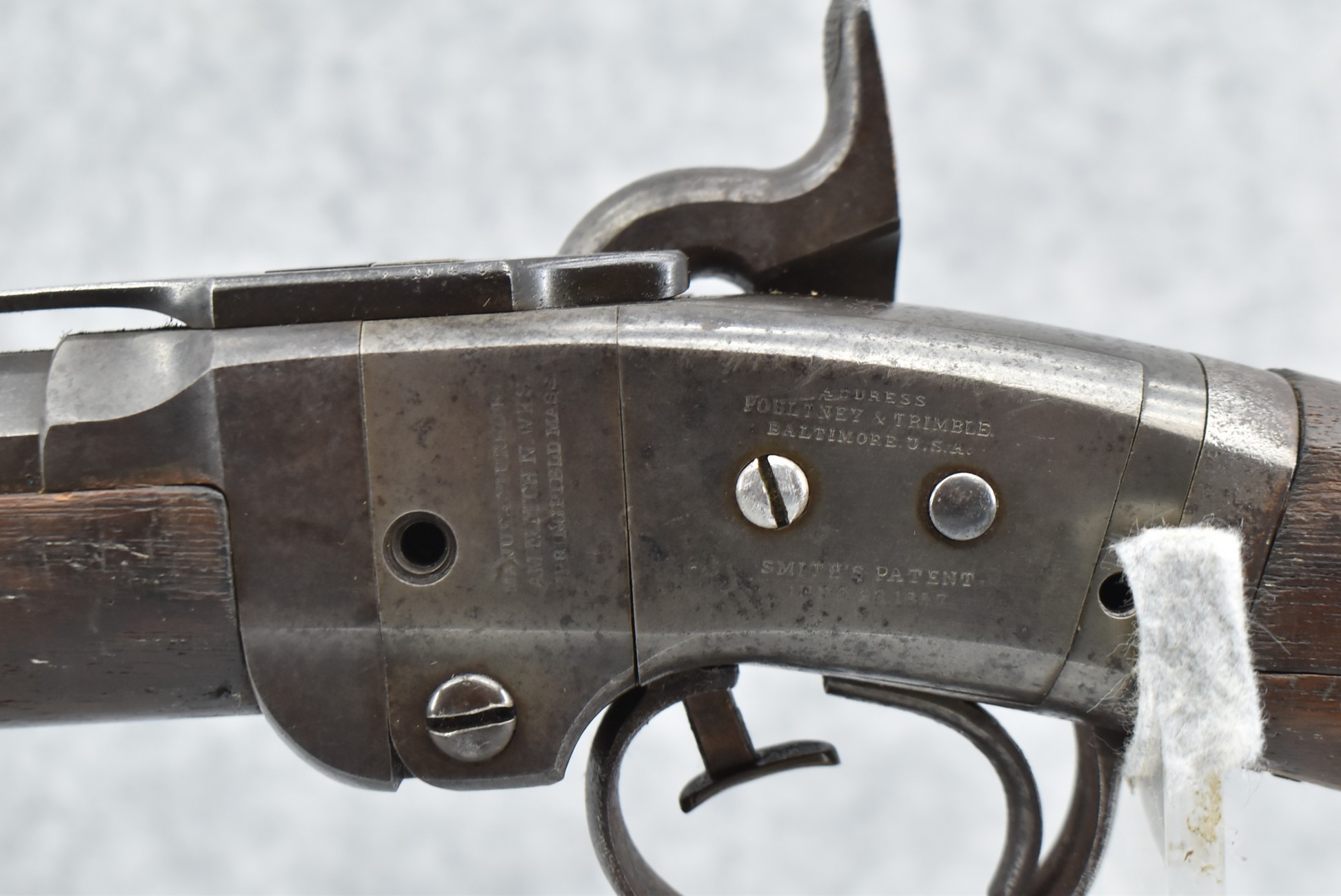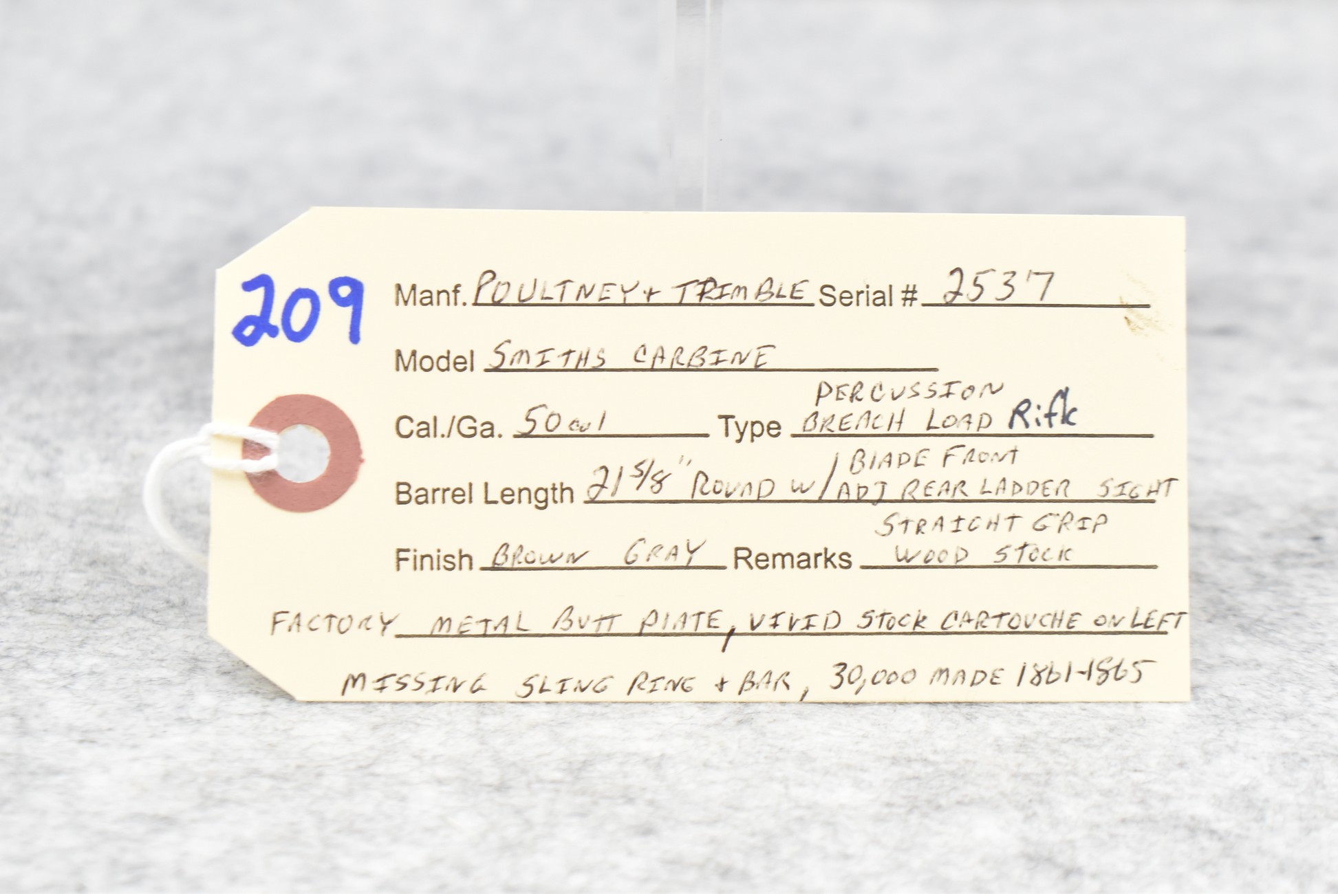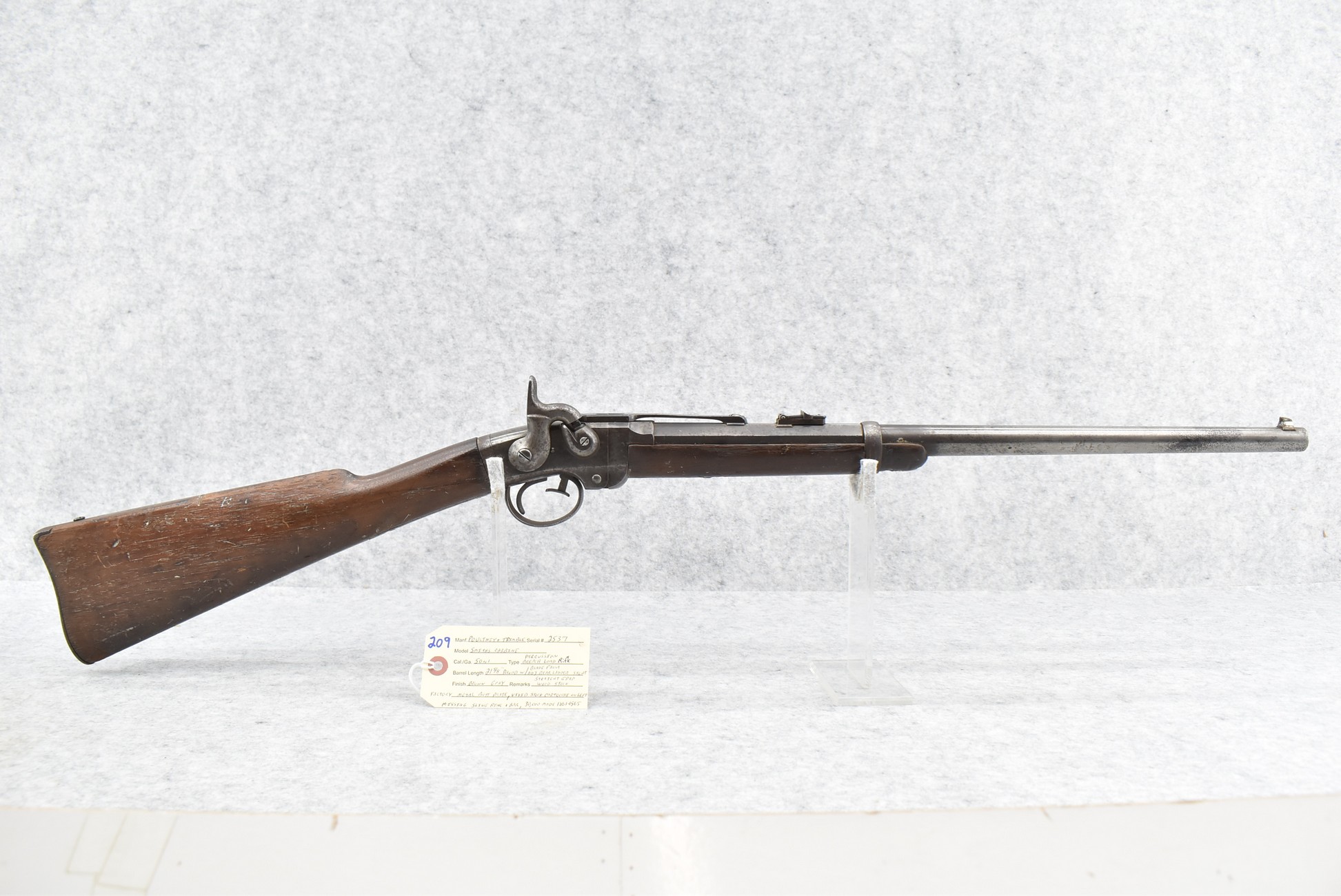 209. Poultney & Trimble – Mod. Smiths Carbine – 50 Cal. Percussion Breech Load Rifle – w/21 5/8” Round Barrel w/Blade Front & Adj. Rear Ladder Sights – Brown/Gray Finish – w/Straight Grip Wood Stock w/Factory Metal Butt Plate w/Vivid Stock Cartouche on Left Side – Approx. 30,000 Mfg. Between 1861-1865 – Note: Missing Saddle Ring & Bar