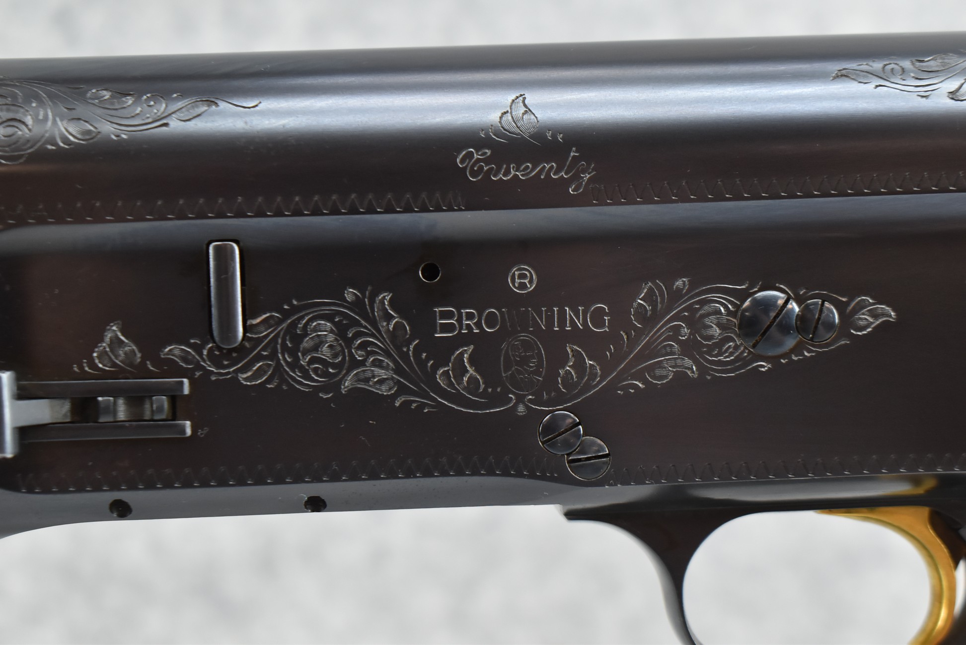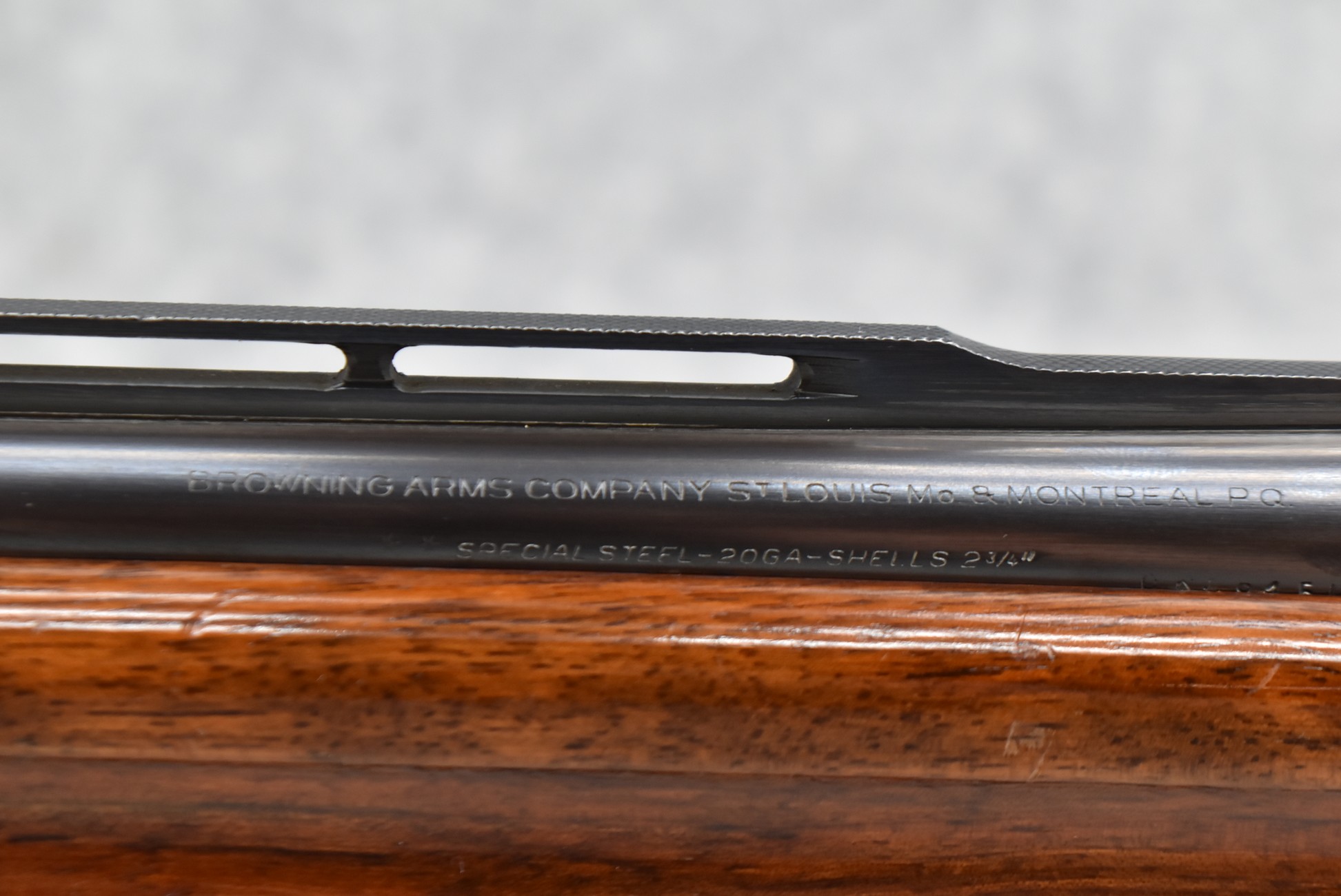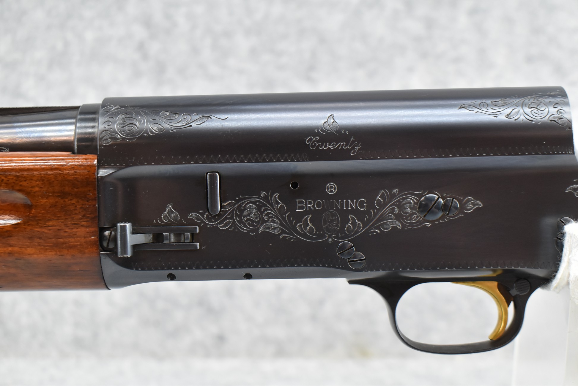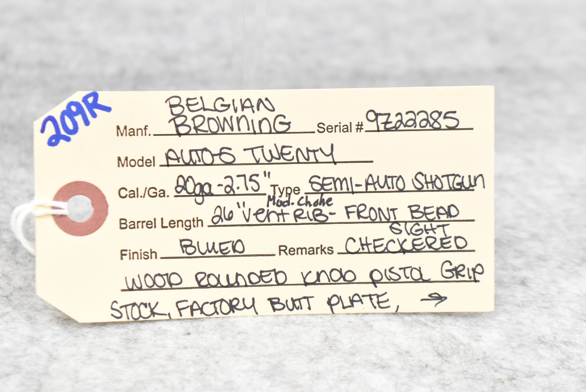 209R.     Browning (Belgian) – Mod. Auto-5 Twenty – 20ga. 2 ¾” Semi-Auto Shotgun – w/26” Mod Choke, Vent-Rib Barrel w/Front Bead Sight – Blued Finish – w/Engraved Receiver – w/Checkered Rounded Knob Pistol Grip Wood Stock w/Factory Butt Plate – w/Gold Trigger