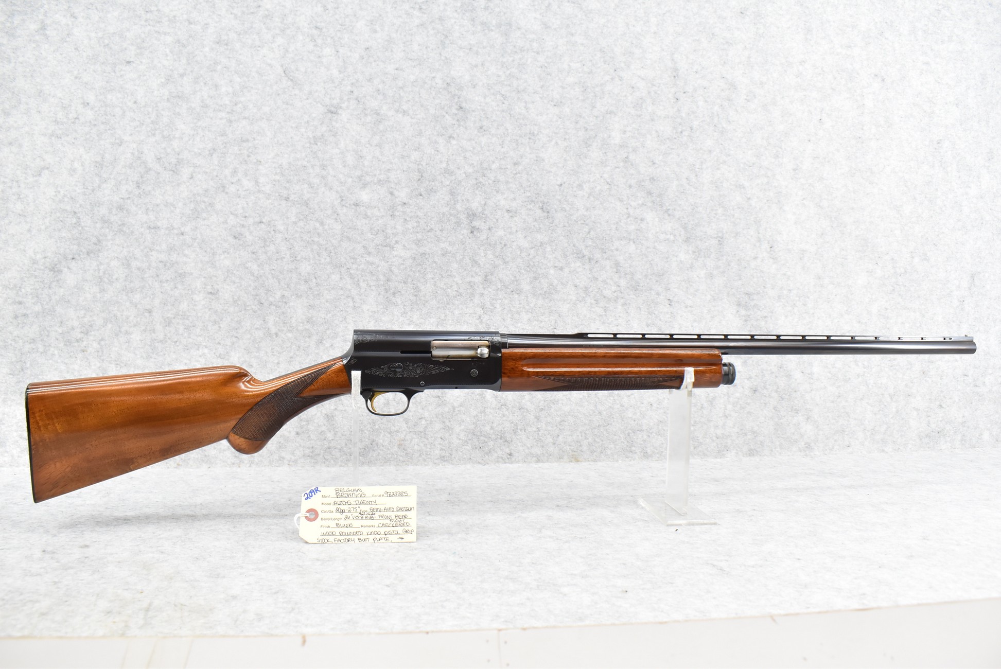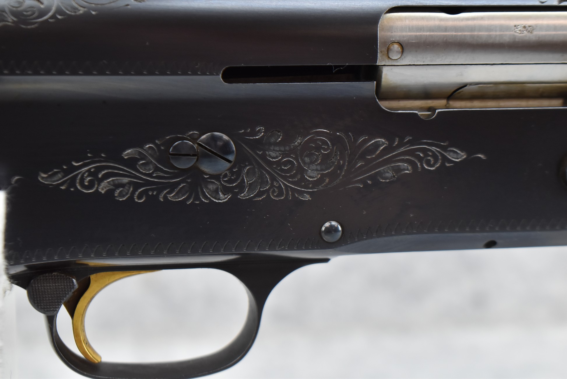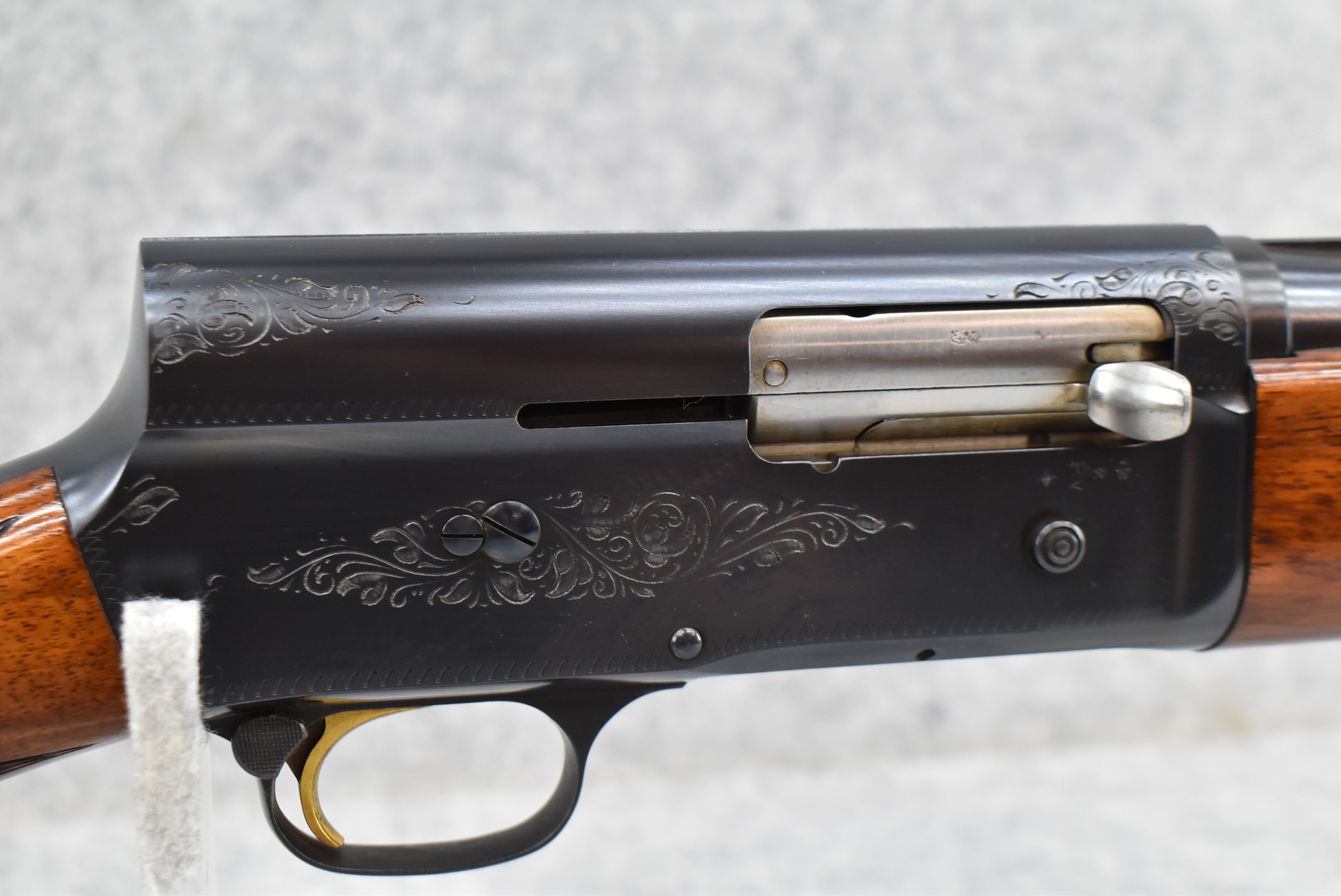 209R.     Browning (Belgian) – Mod. Auto-5 Twenty – 20ga. 2 ¾” Semi-Auto Shotgun – w/26” Mod Choke, Vent-Rib Barrel w/Front Bead Sight – Blued Finish – w/Engraved Receiver – w/Checkered Rounded Knob Pistol Grip Wood Stock w/Factory Butt Plate – w/Gold Trigger