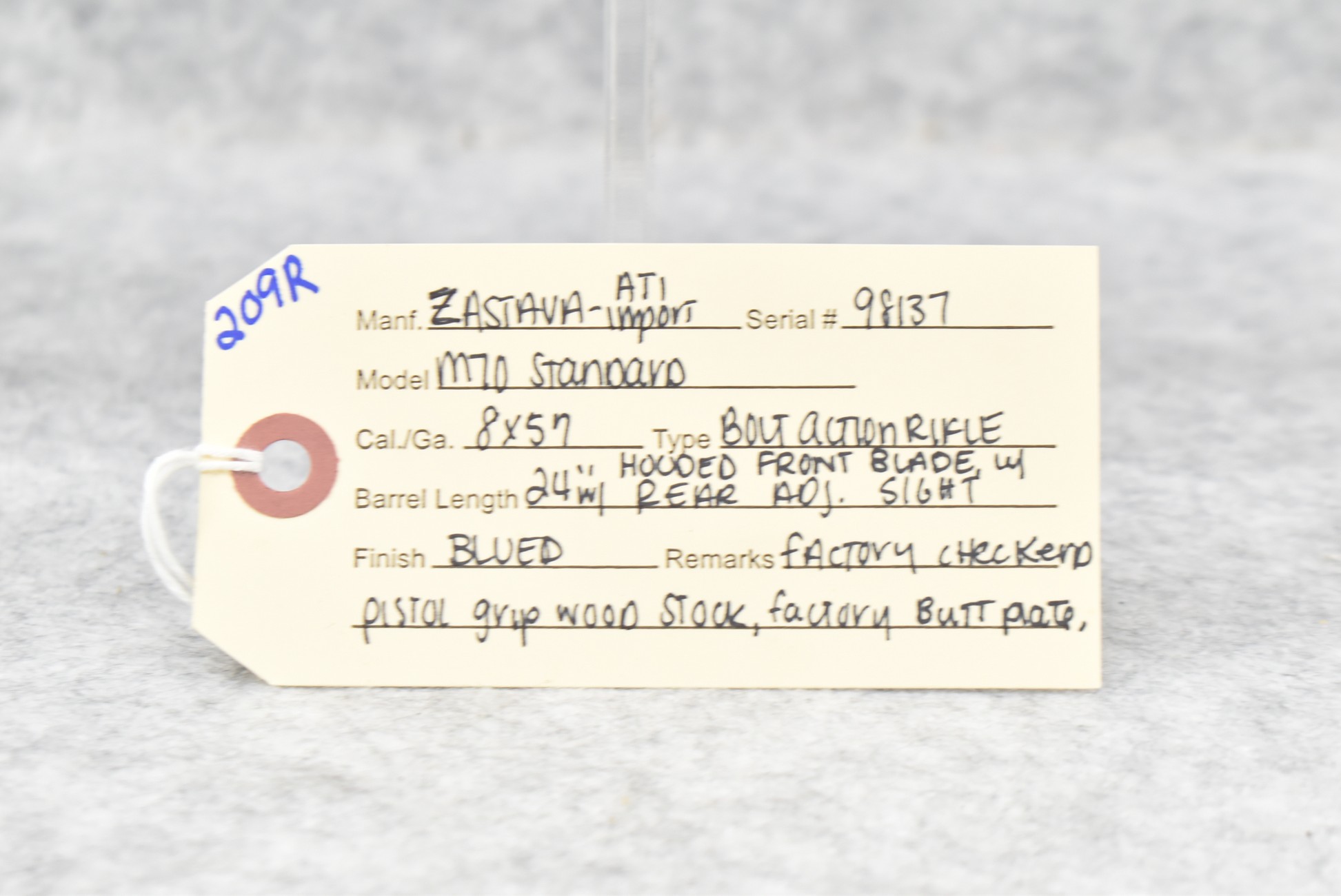 209R. Zastava – Mod. M70 Standard – 8×57 Cal. Bolt Action Rifle – w/24” Barrel w/Hooded Blade Front and Adjustable Rear Sights – Blued Finish – w/Factory Checkered Pistol Grip Wood Stock w/Factory Butt Plate