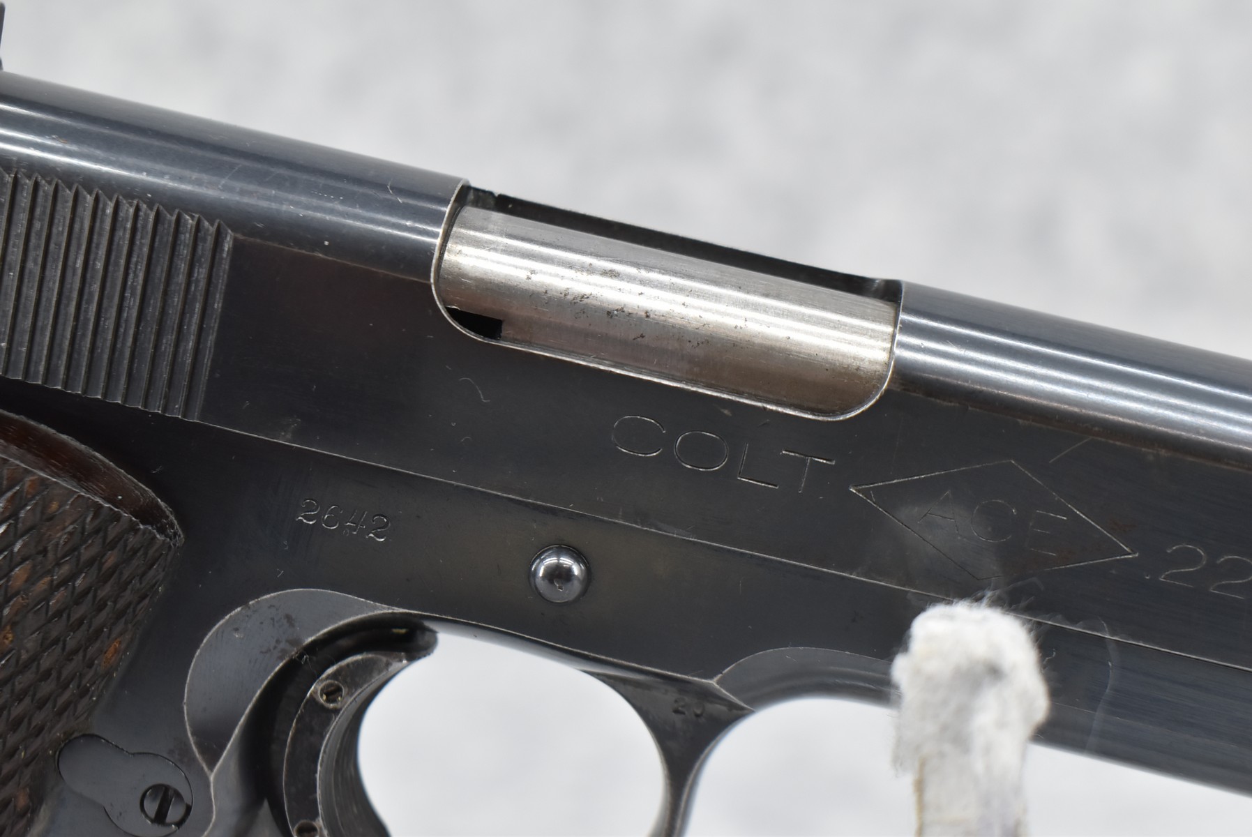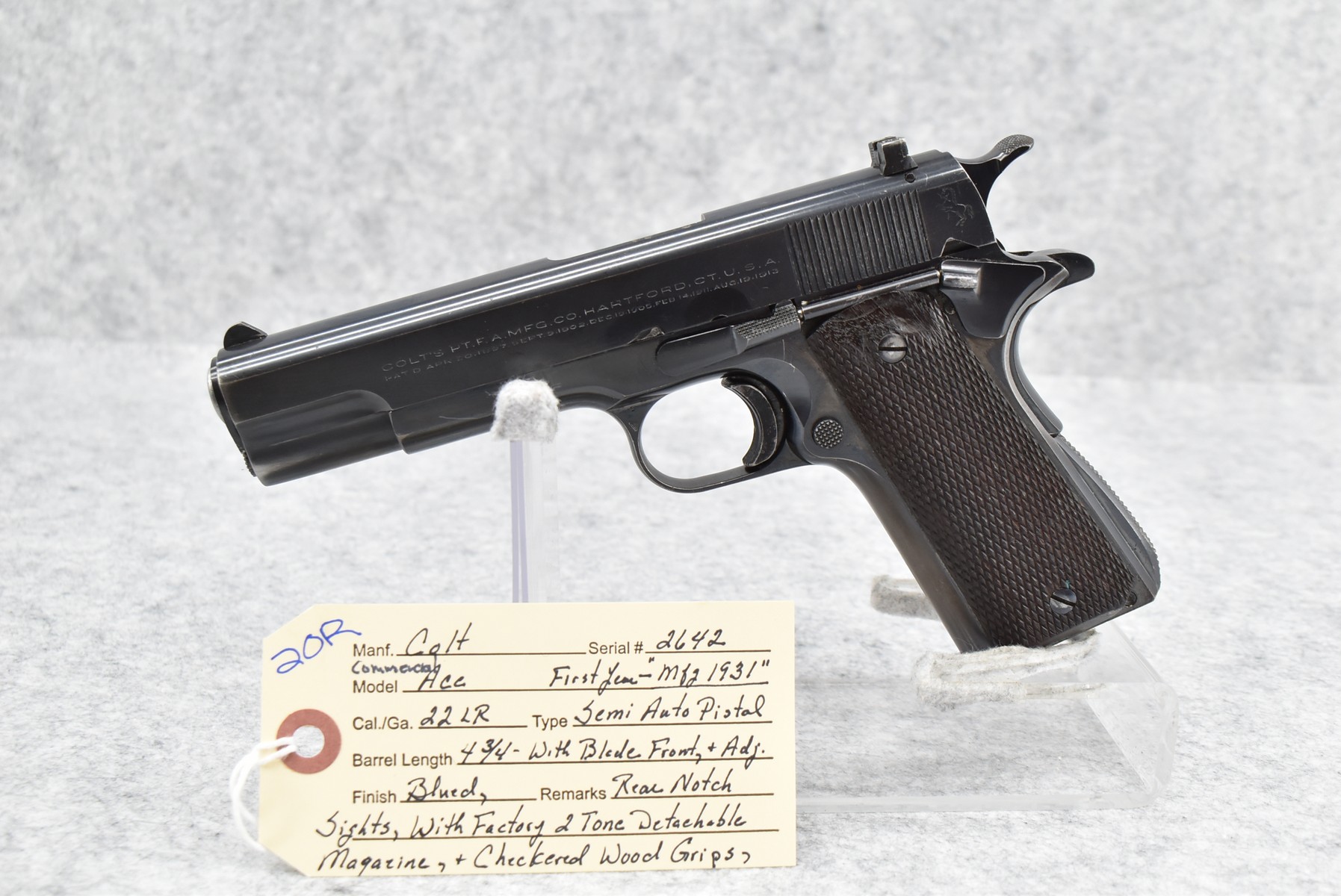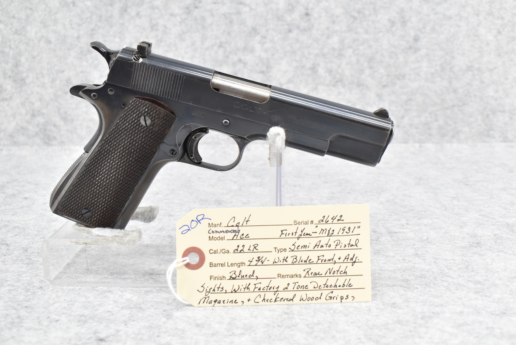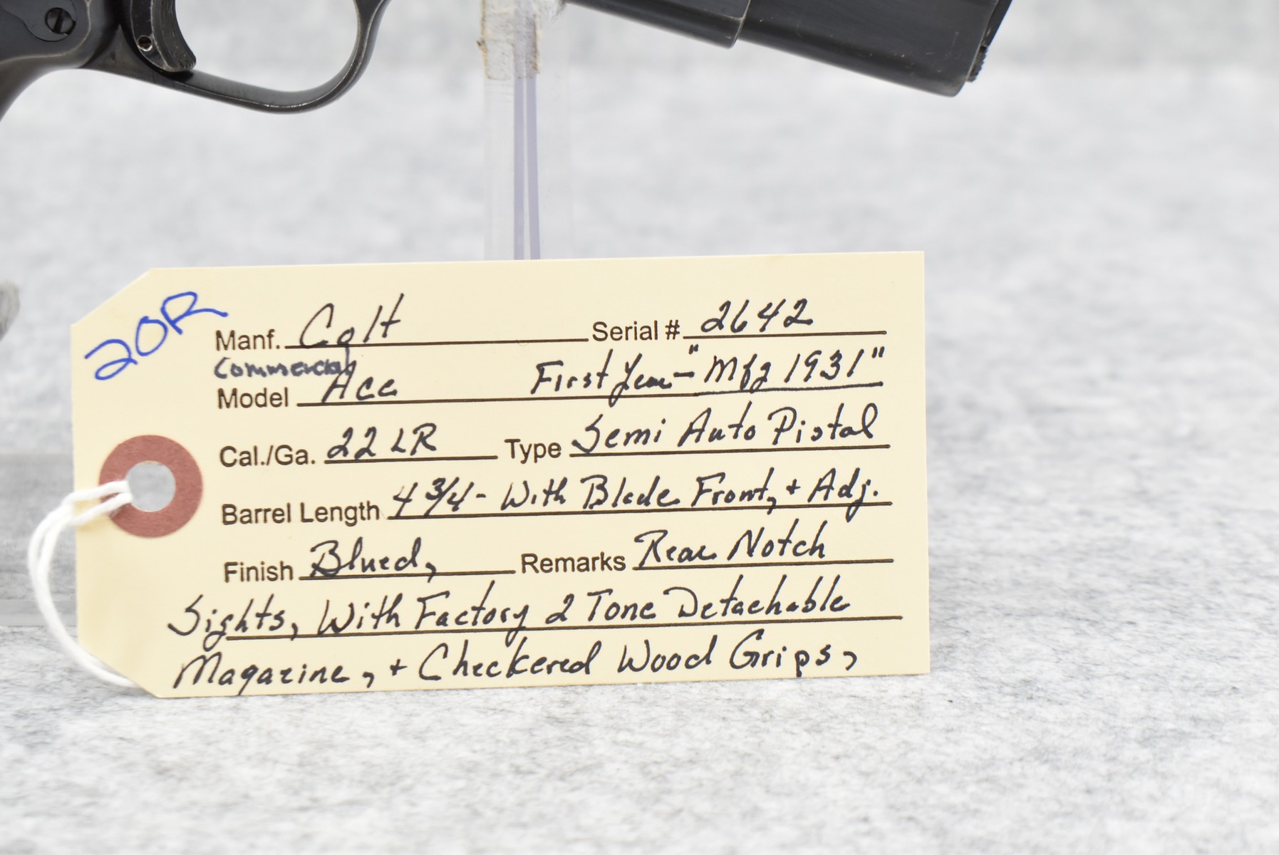 20R. Colt – Mod. Commercial Ace – 22LR Cal. Semi-Auto Pistol – w/4 ¾” Barrel w/Blade Front & Adj. Rear Notch Sights – Blued Finish – w/Factory Two-Tone Detachable Magazine – w/Checkered Wood Grips – Serial #2642, First Year of Mfg., 1931