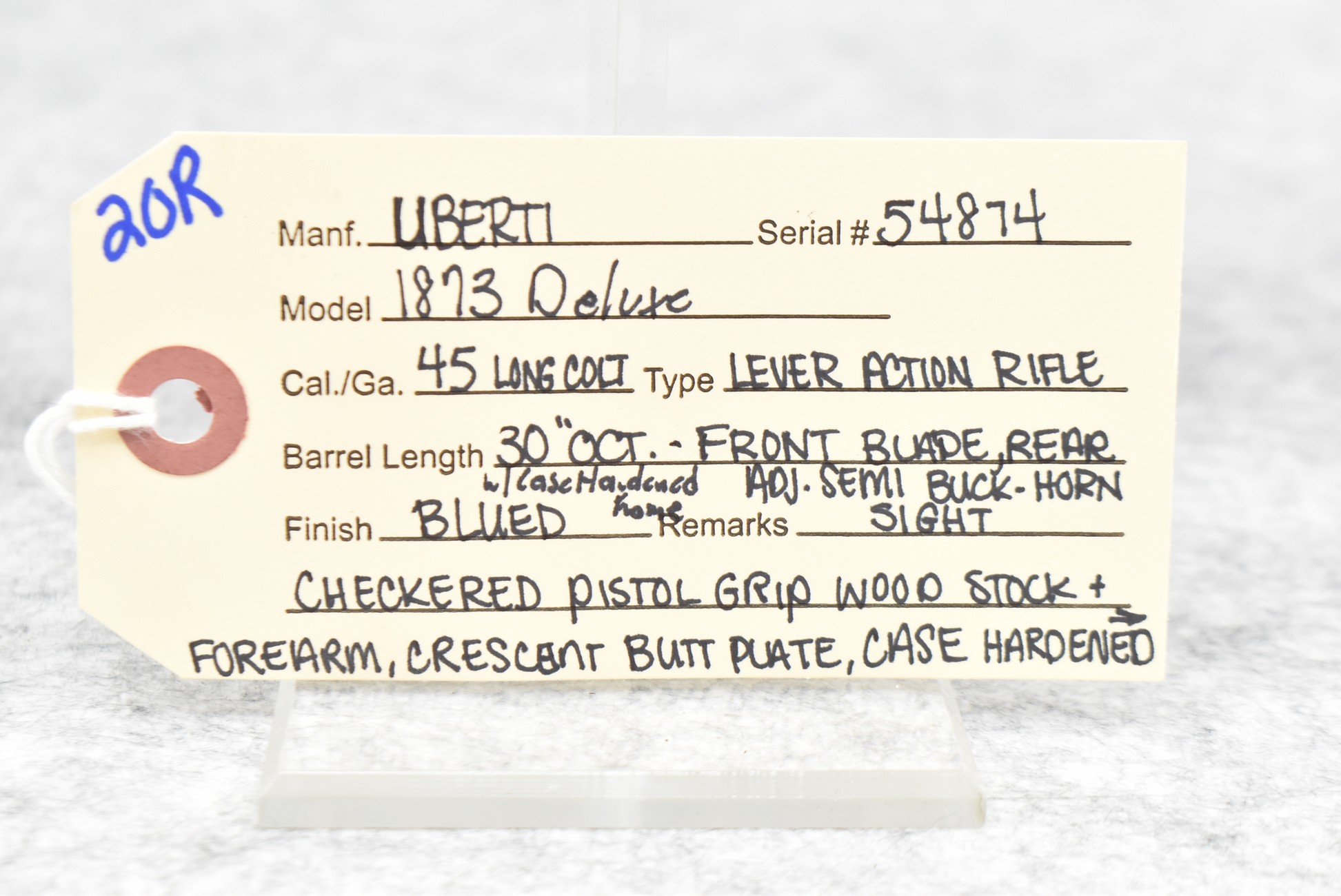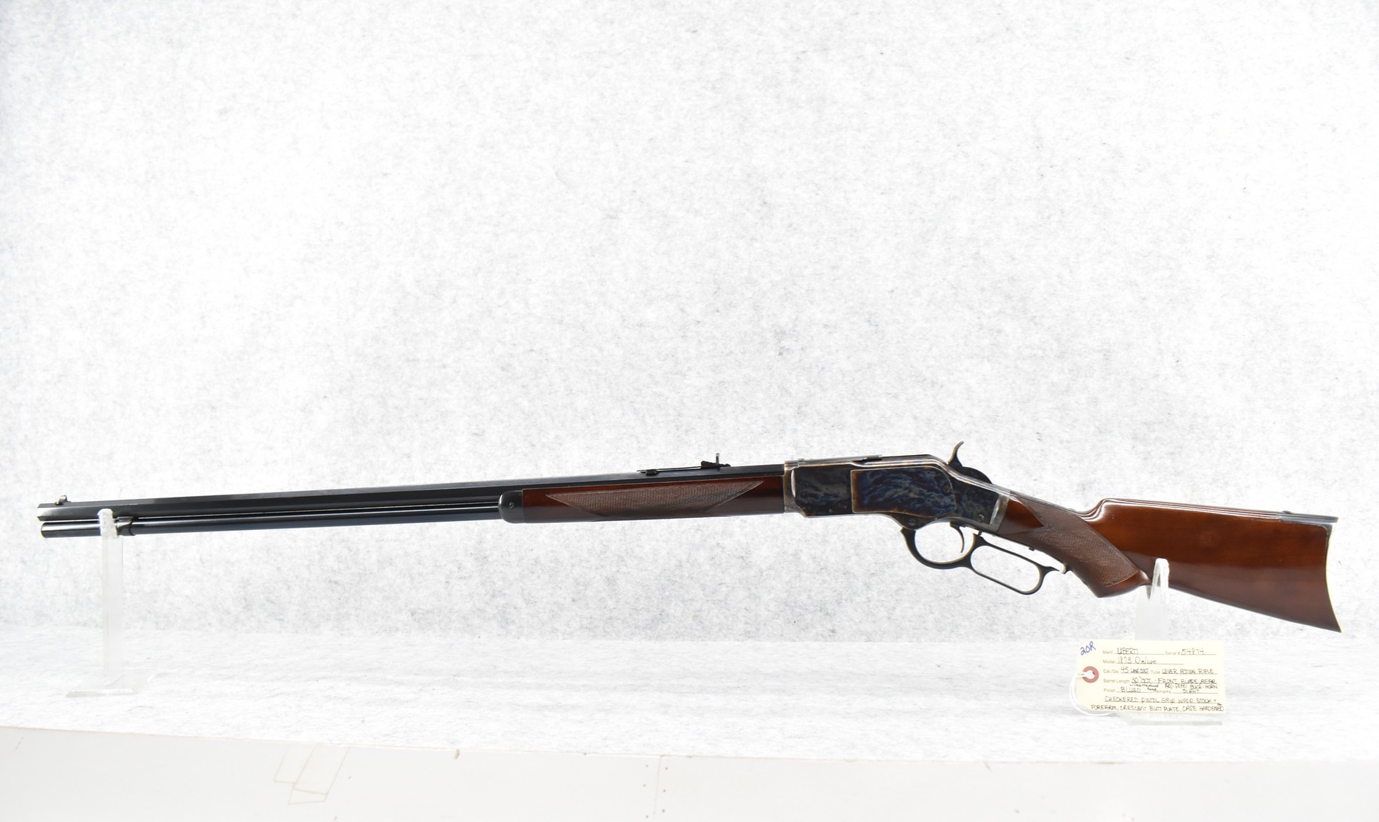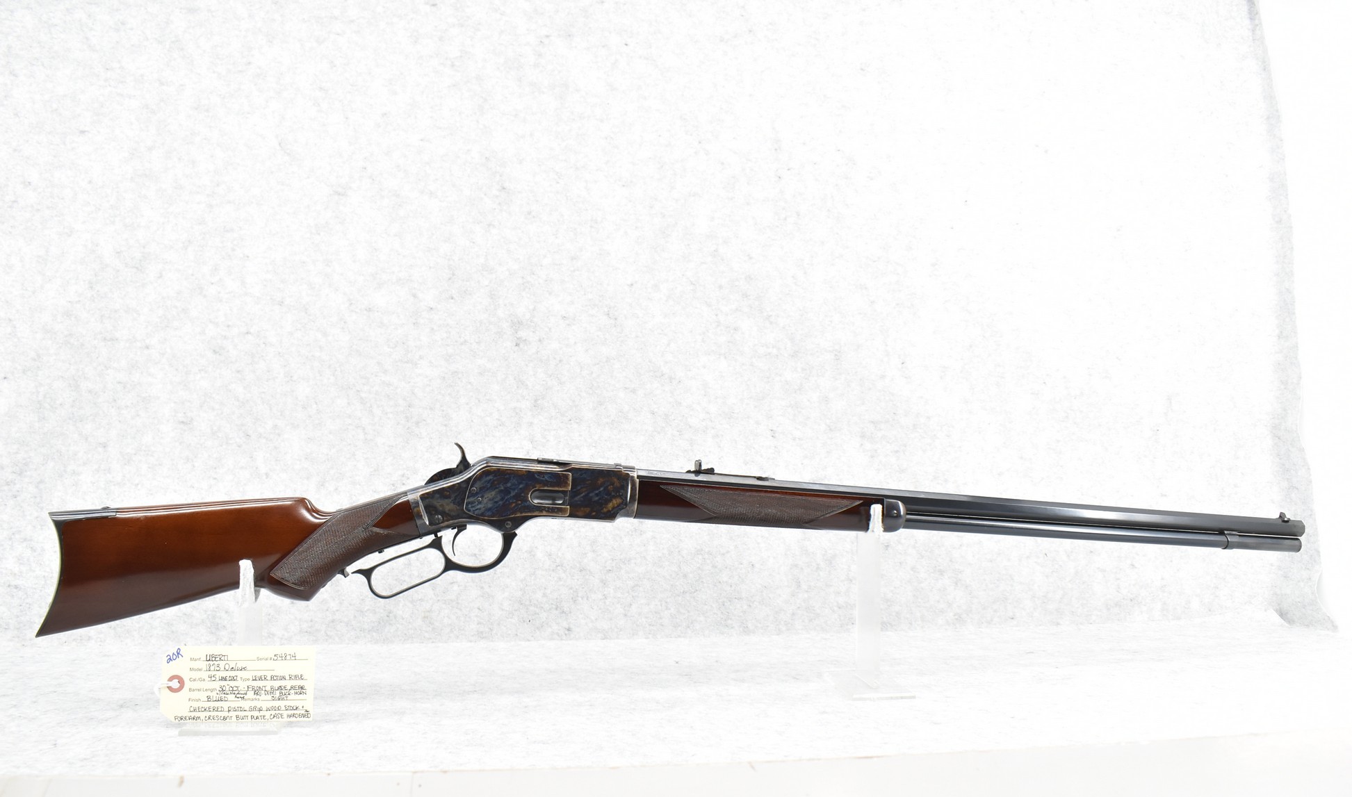 20R. Uberti – Mod. 1873 Deluxe – 45 Long Colt Cal. Lever Action Rifle – w/30” Octagon Barrel w/Blade Front and Adjustable Rear Semi-Buckhorn Sights – Blued Finish w/Case Hardened Frame – w/Checkered Pistol Grip Wood Stocks w/Crescent Butt Plate – w/Full Length Tubular Magazine