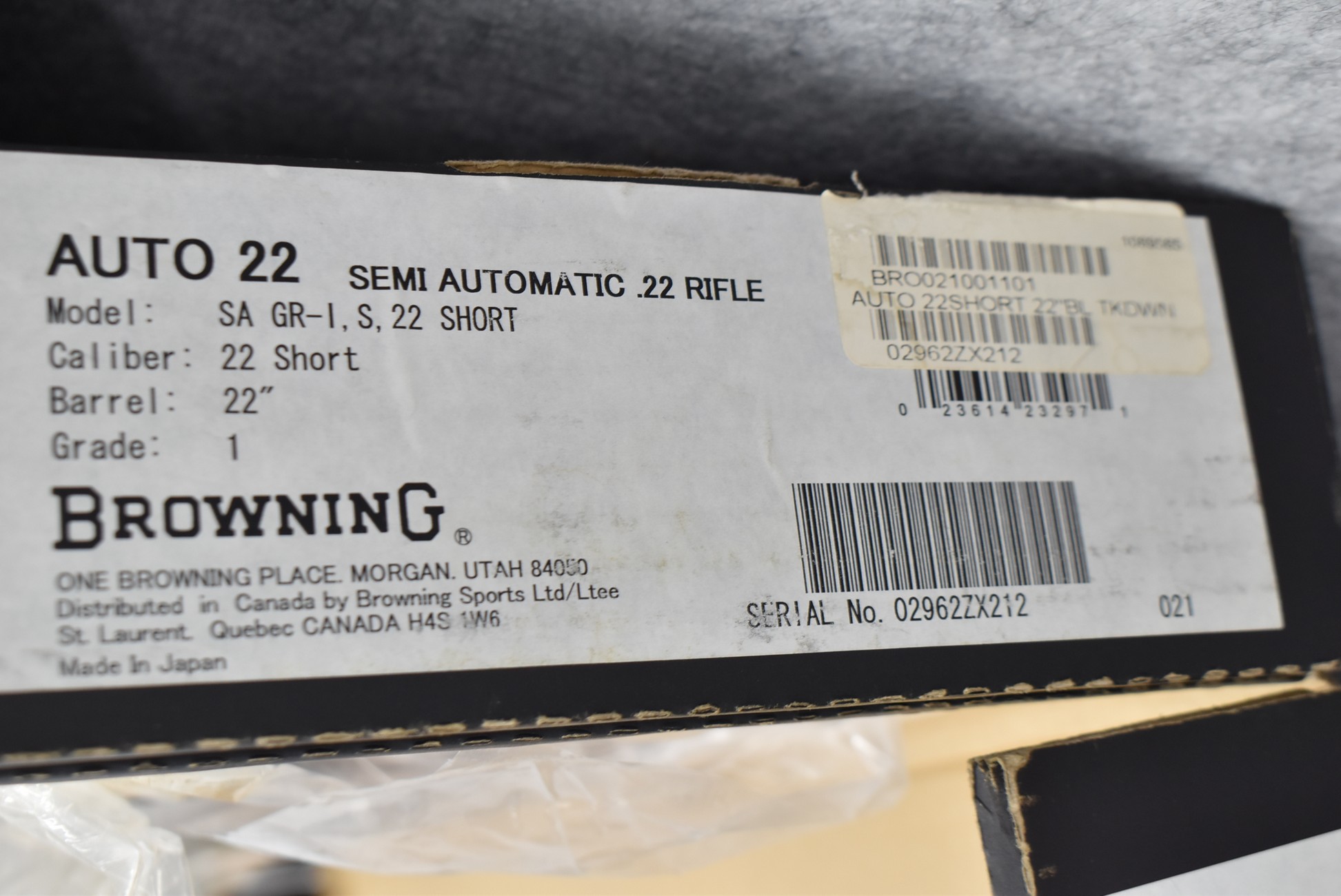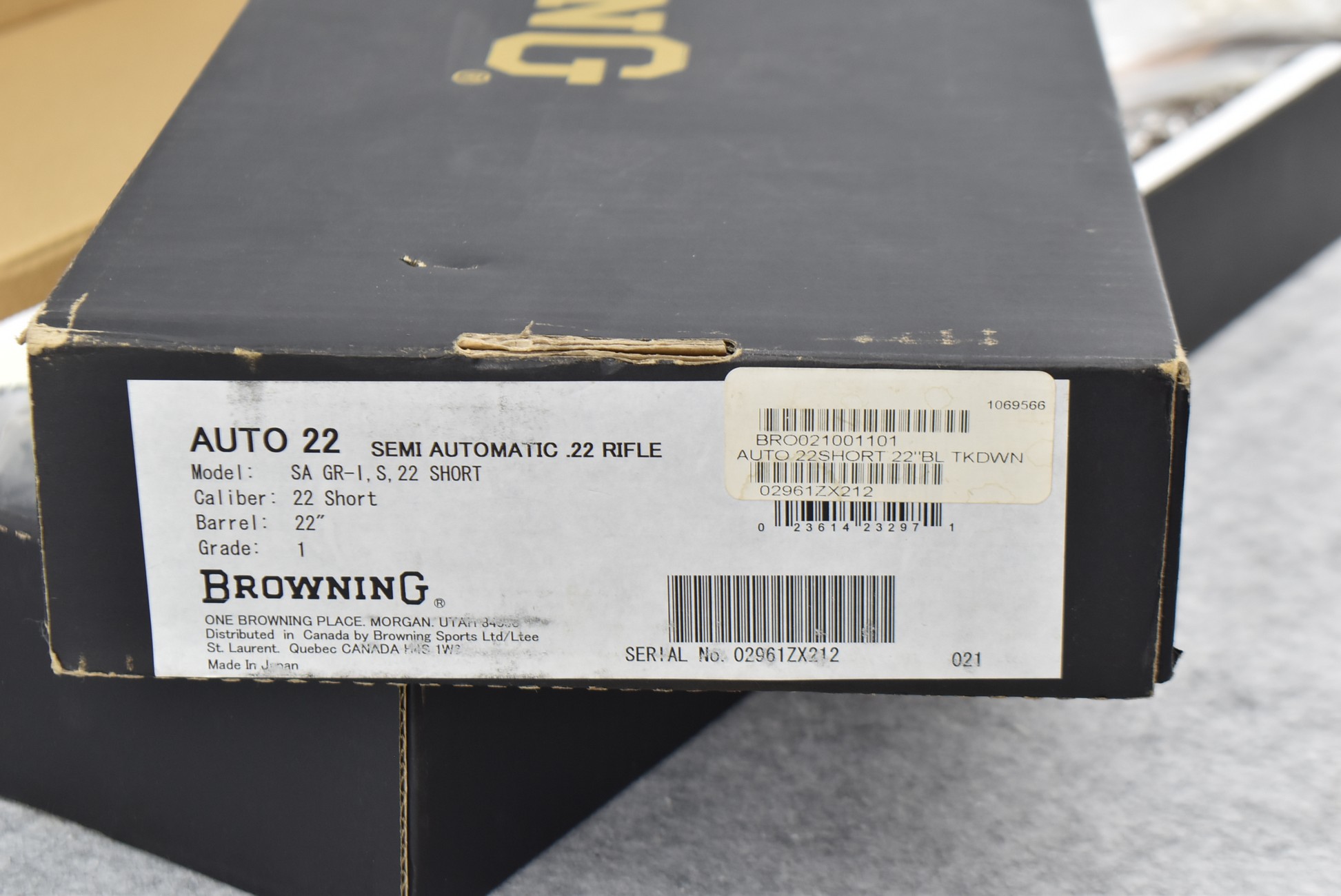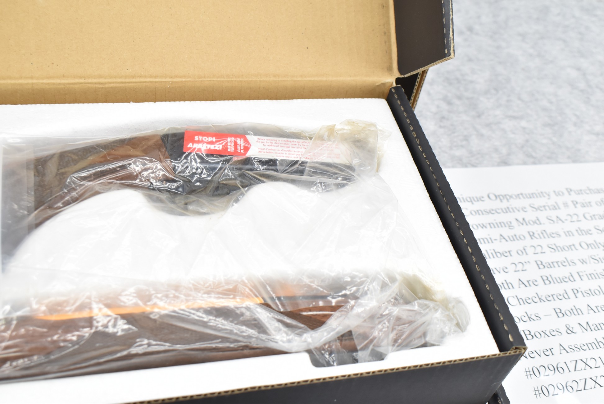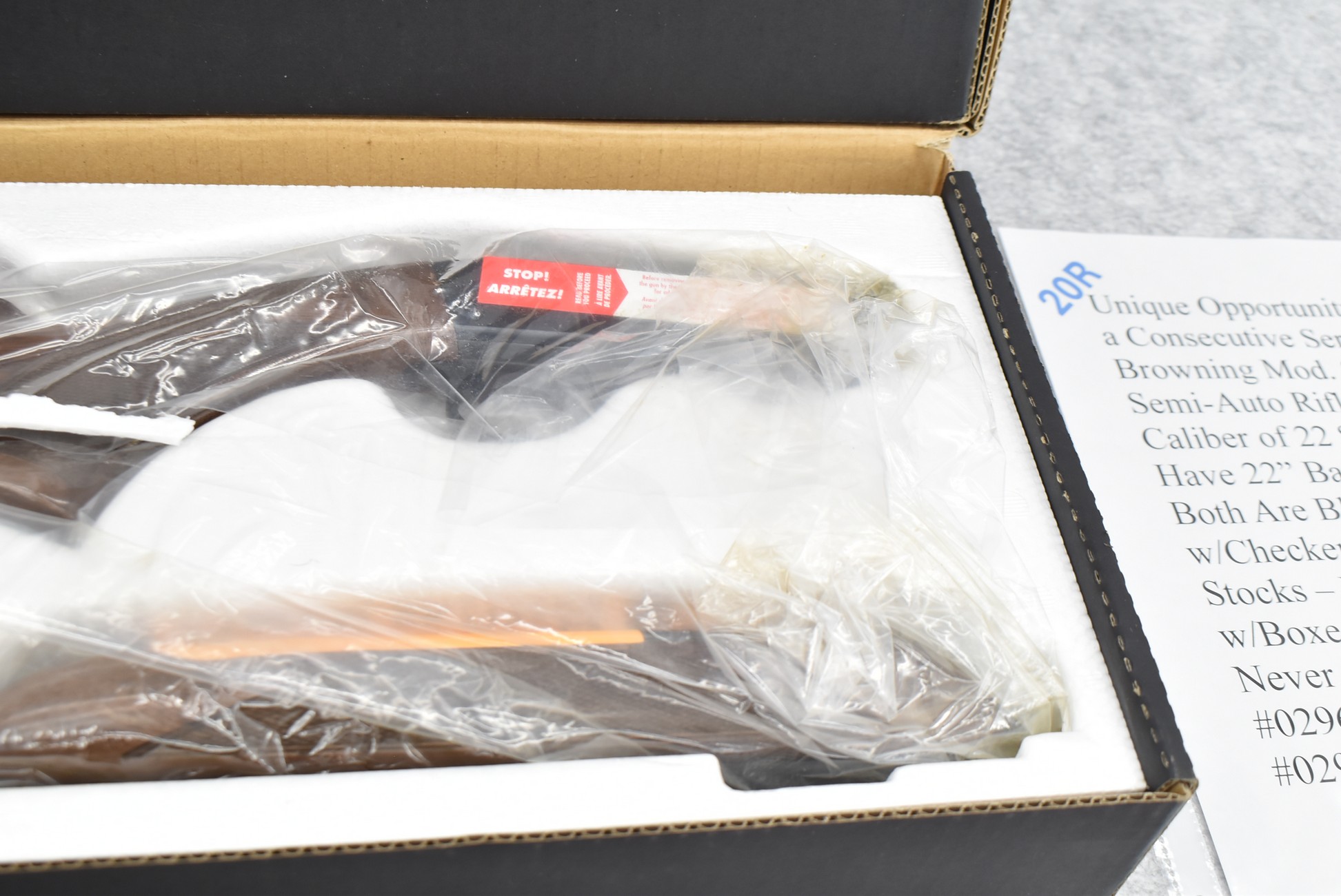 20R.       Unique Opportunity to Purchase a Consecutive Serial # Pair of Browning Mod. SA-22 Grade-1 Semi-Auto Rifles in the Scarce Caliber of 22 Short Only – Both Have 22” Barrels w/Sights – Both Are Blued Finish – Both w/Checkered Pistol Grip Wood Stocks – Both Are Unfired w/Boxes & Manuals & Appear Never Assembled – Serial #02961ZX212 & Serial #02962ZX212 – Great Find