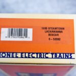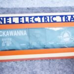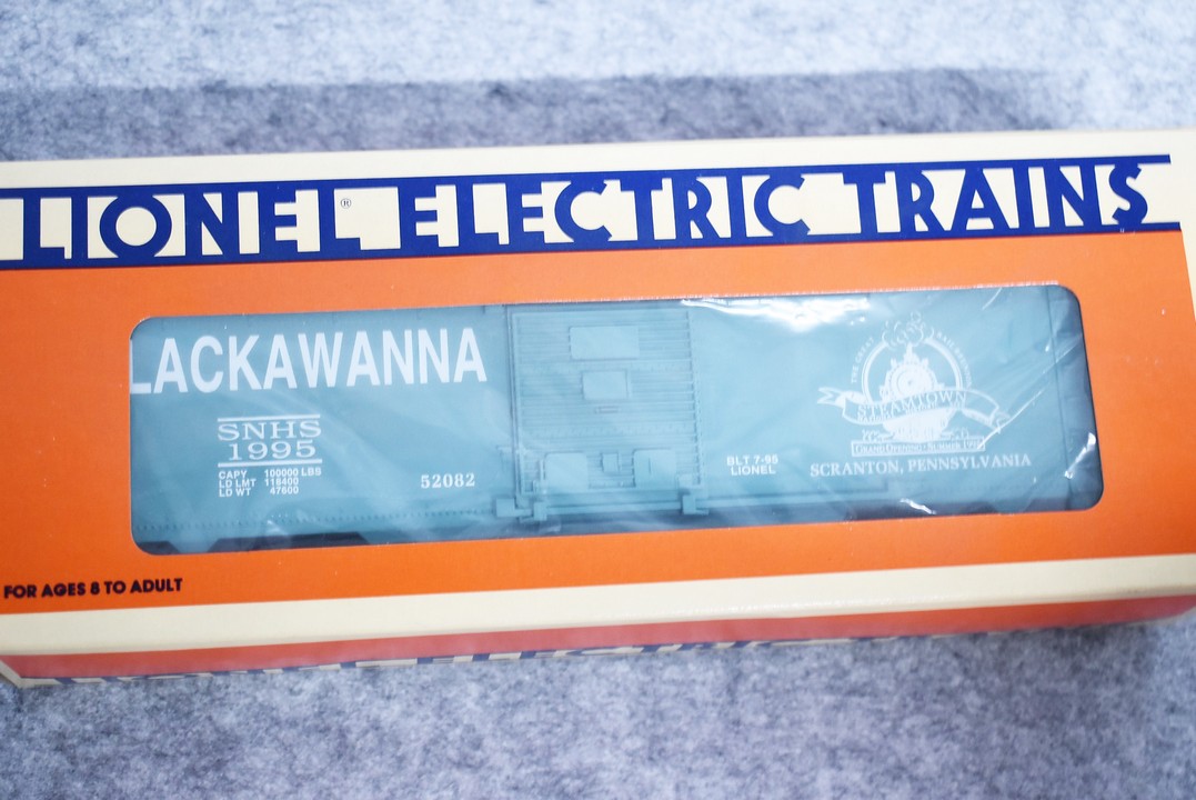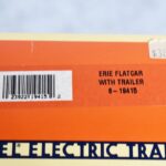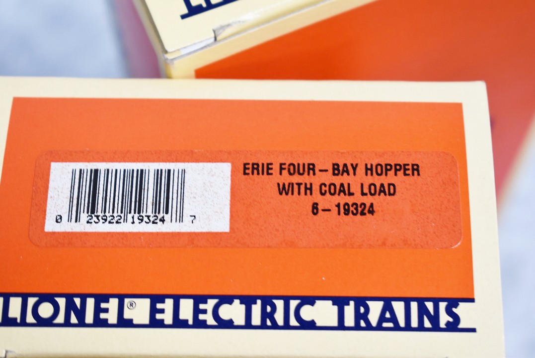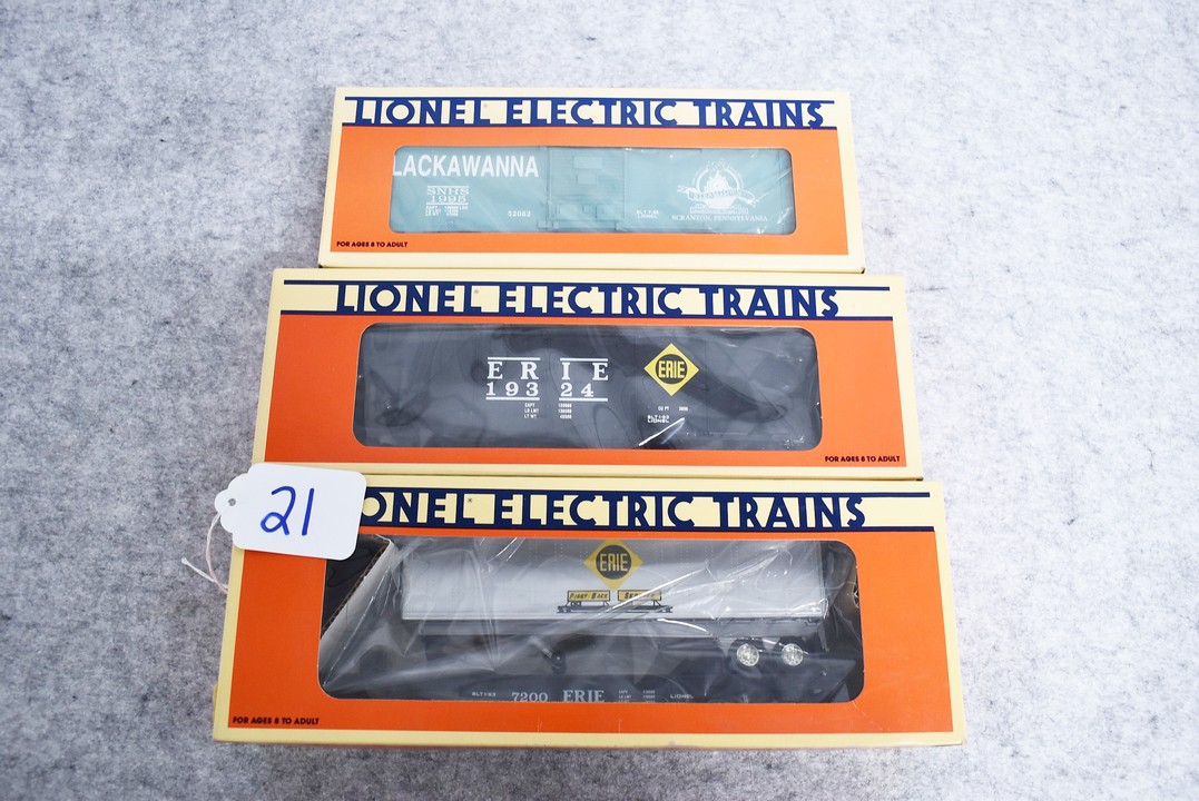 21.       Lot of 3 Lionel O gauge train cars including 6-52082 Steam town Lackawanna boxcar, 6-19415 Erie flat car with trailer, 6-19324 Erie four bay hopper with coal load, all with boxes