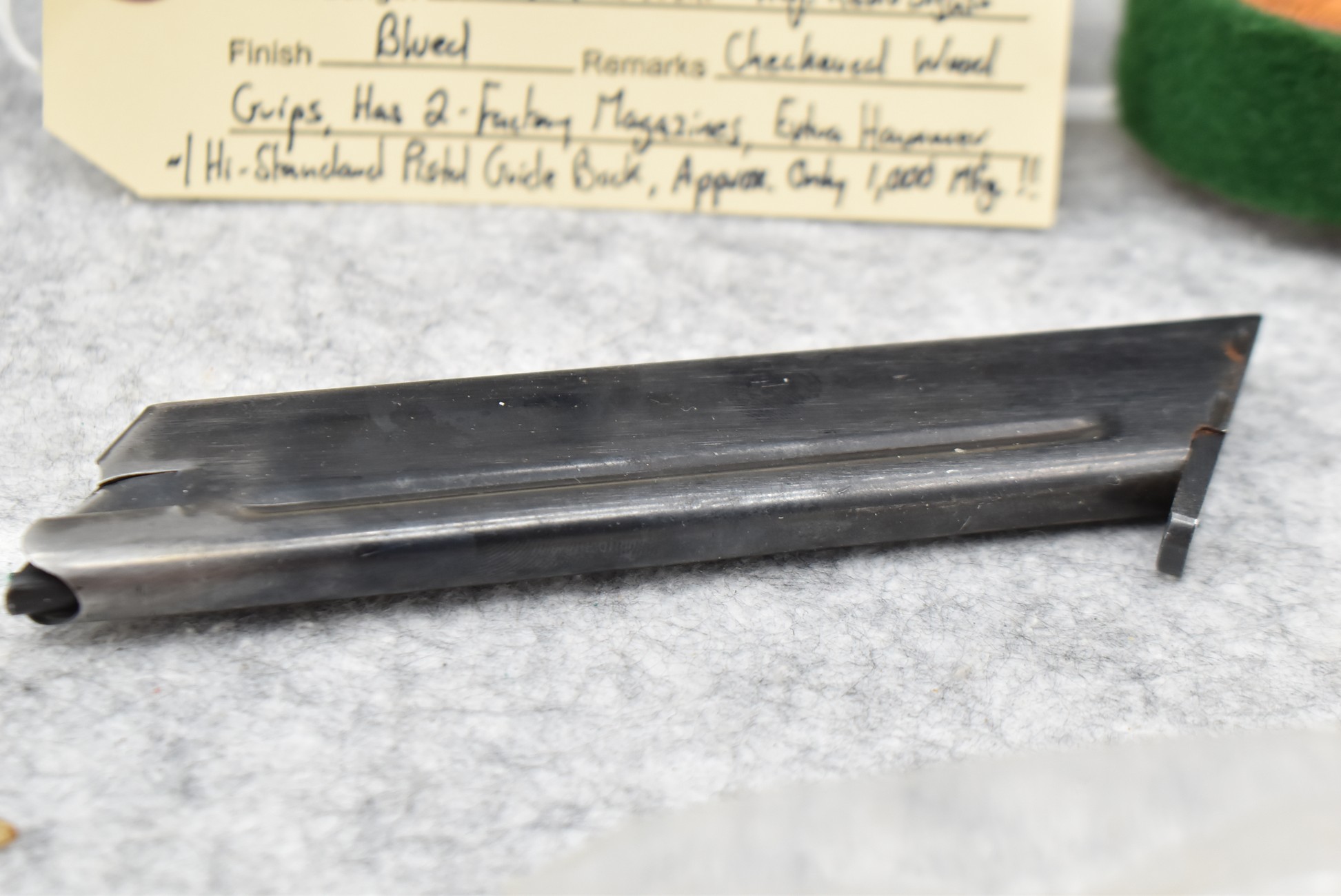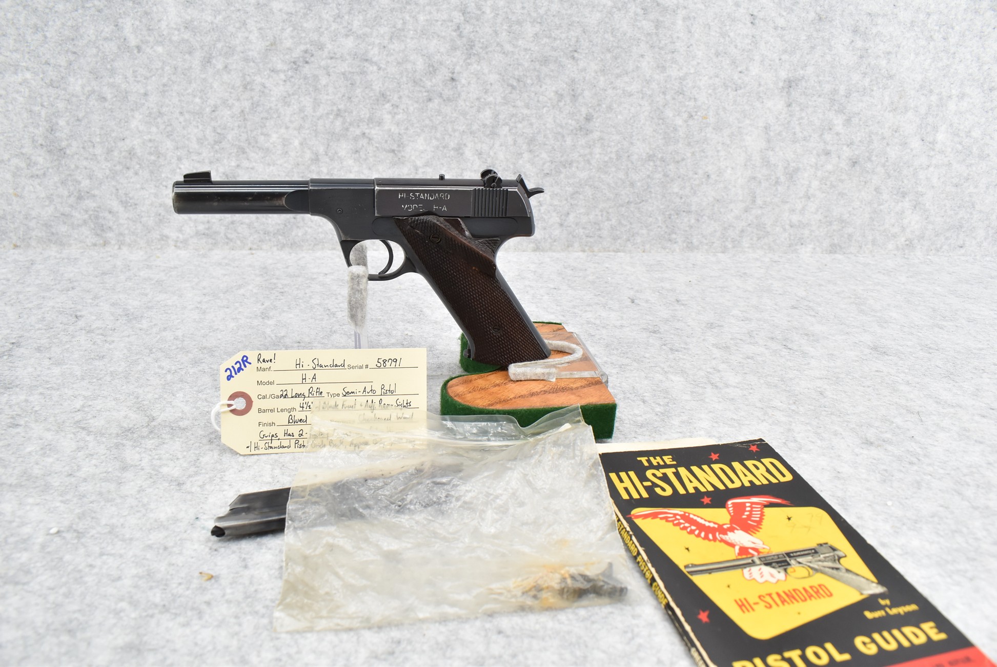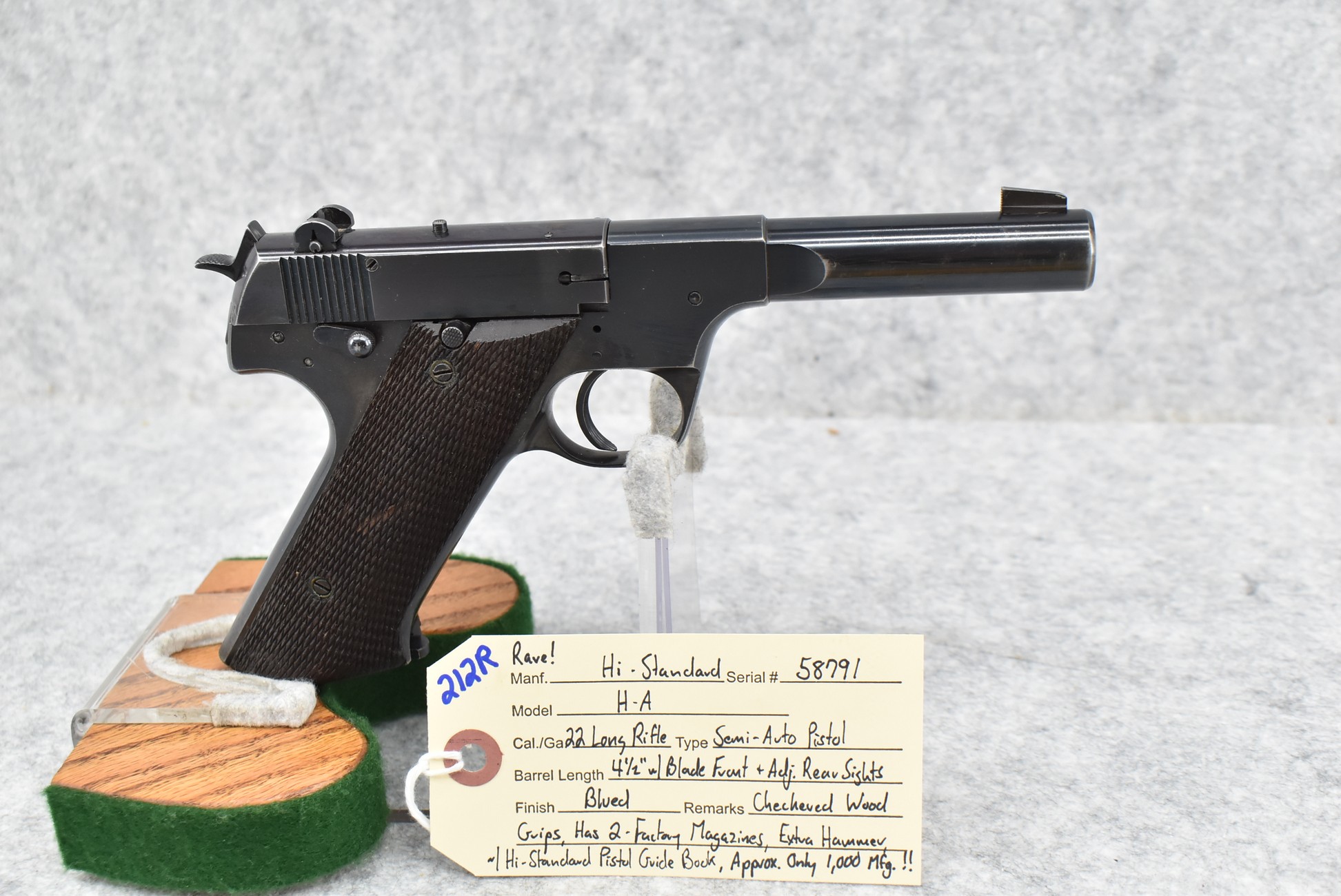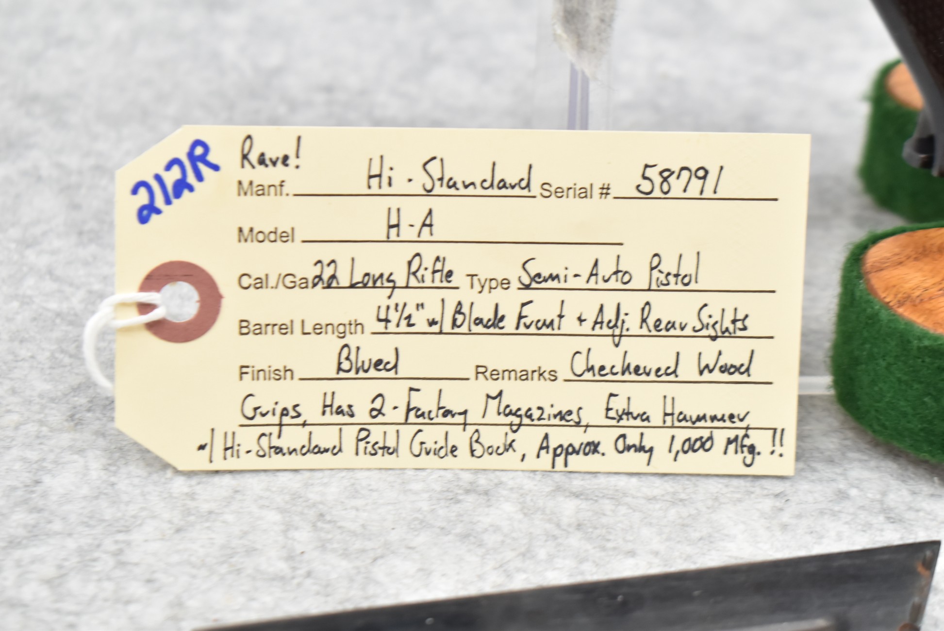 212R. Rare! Hi-Standard – Mod. H-A – 22 Long Rifle Cal. Semi-Auto Pistol – w/4 ½” Barrel w/Blade Front & Adj. Rear Sights – Blued Finish – w/Checkered Wood Grips – w/2 Factory Magazines – w/Extra Hammer – w/Hi-Standard Pistol Guide Book – Approx. Only 1,000 Mfg.!!