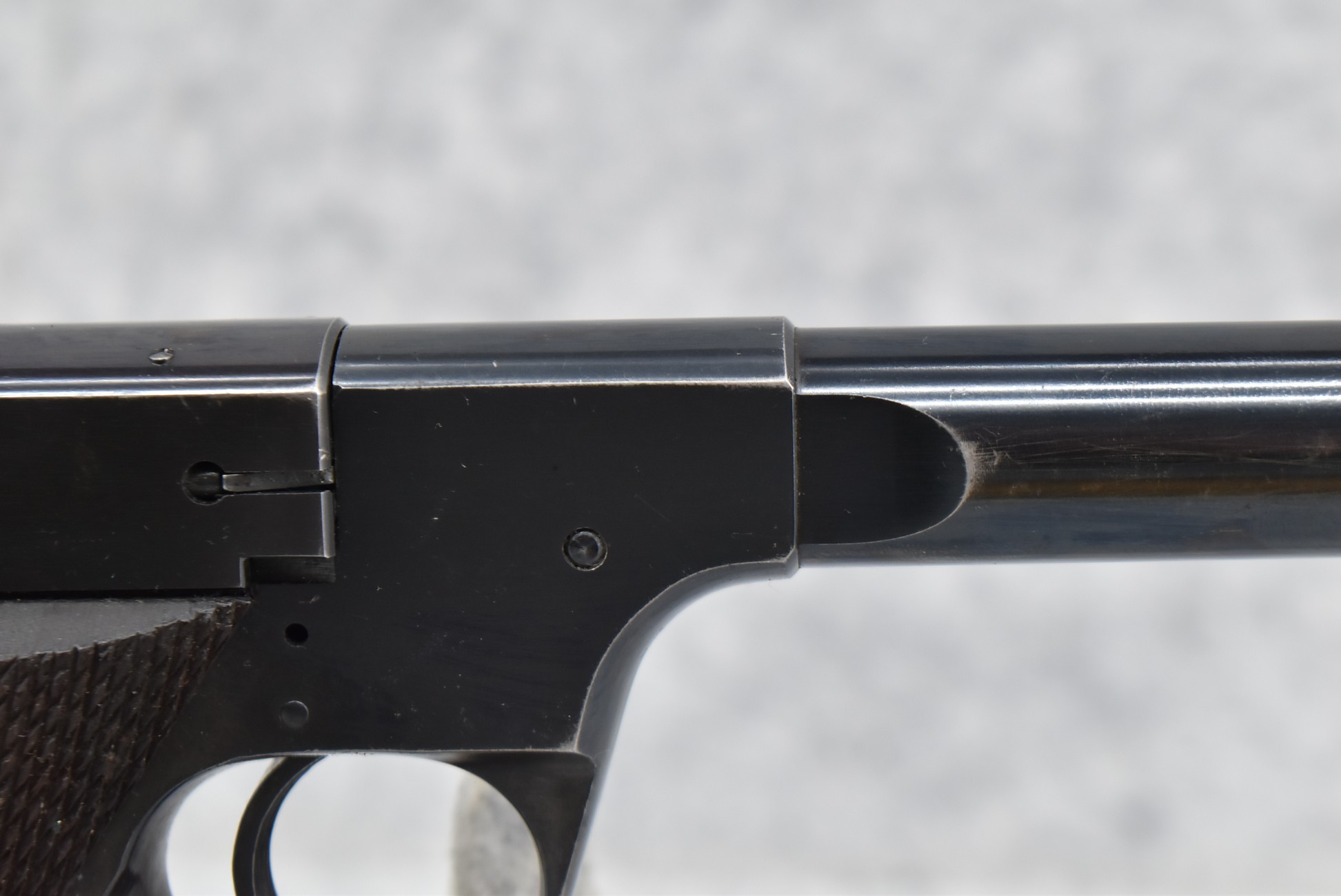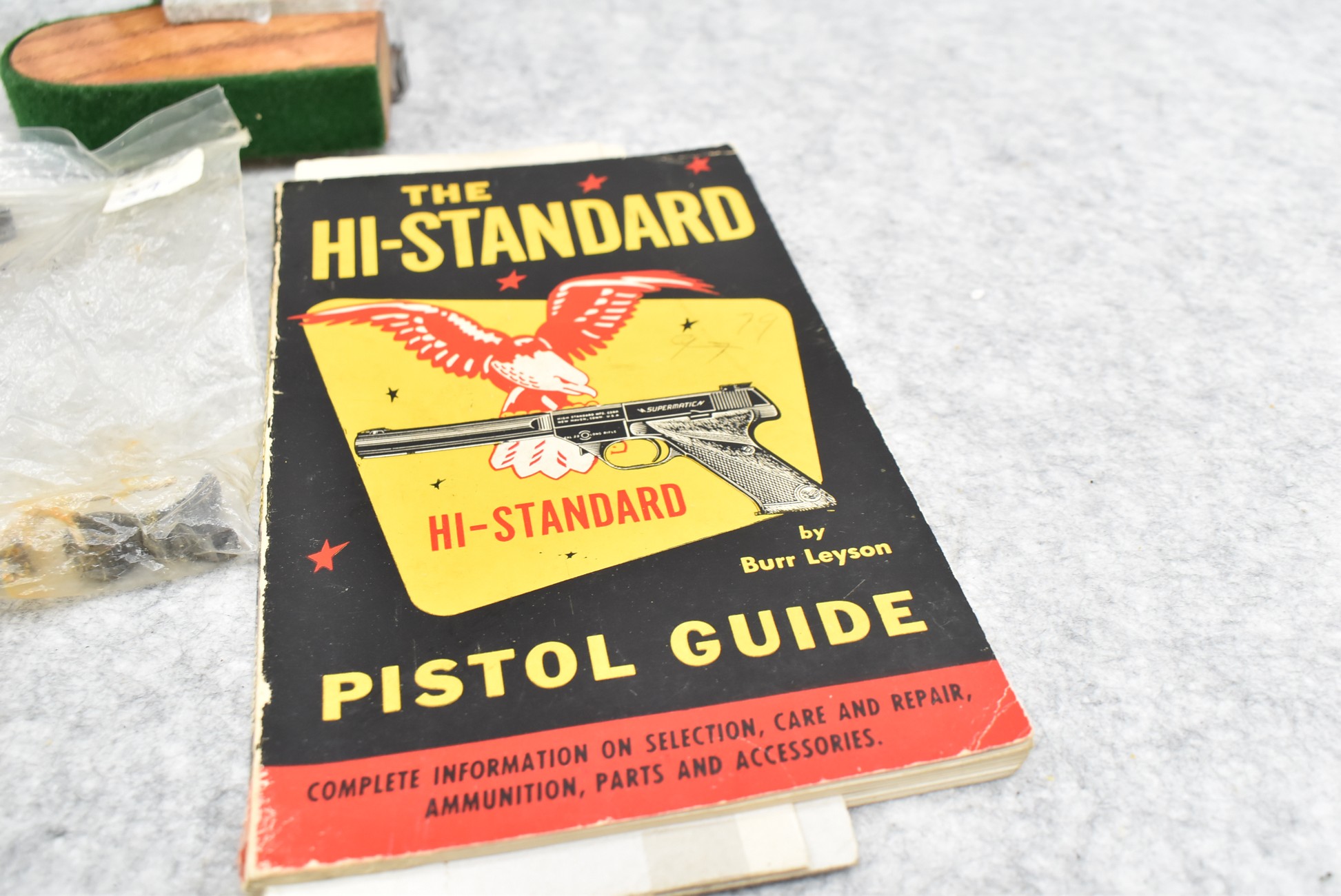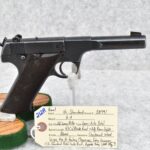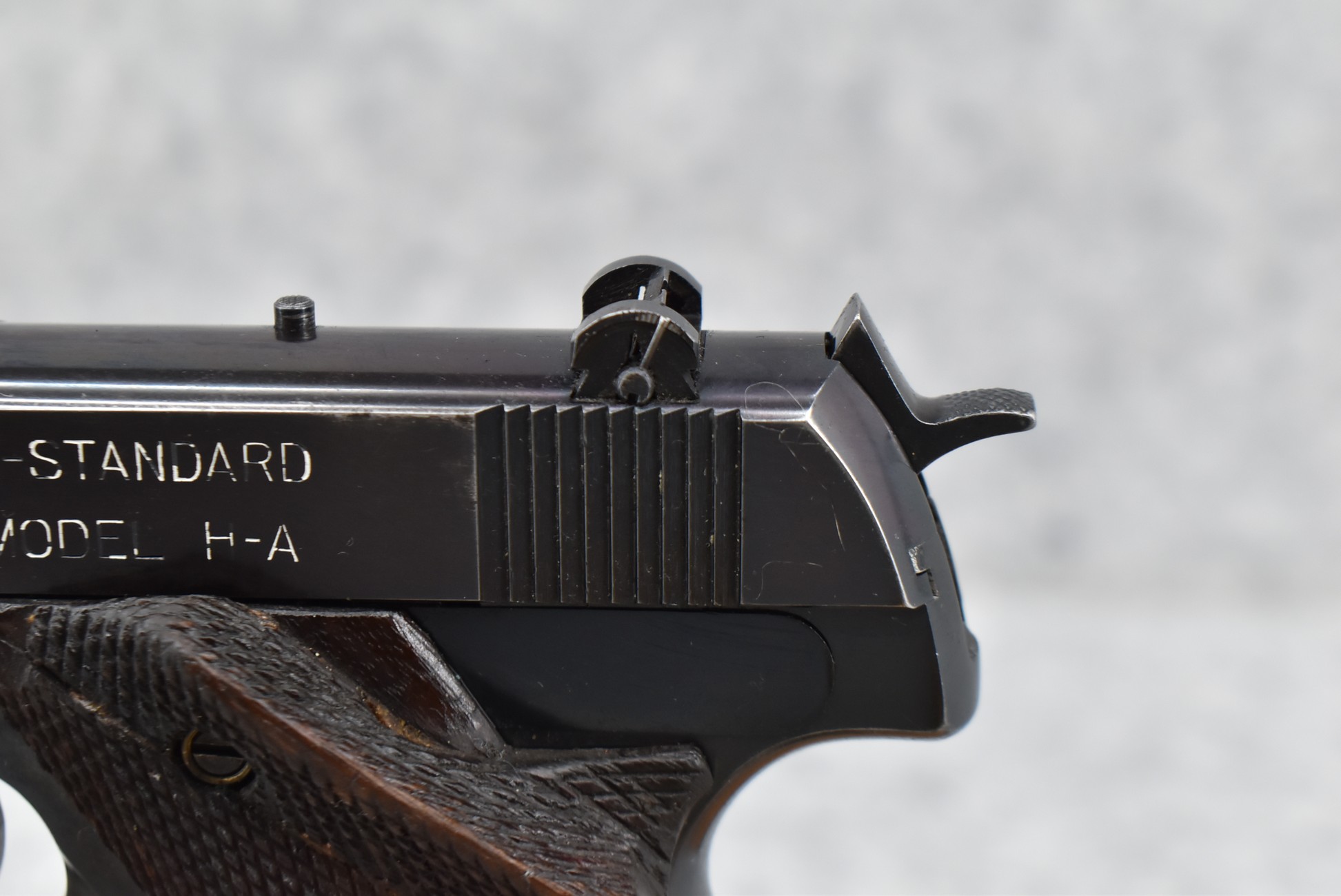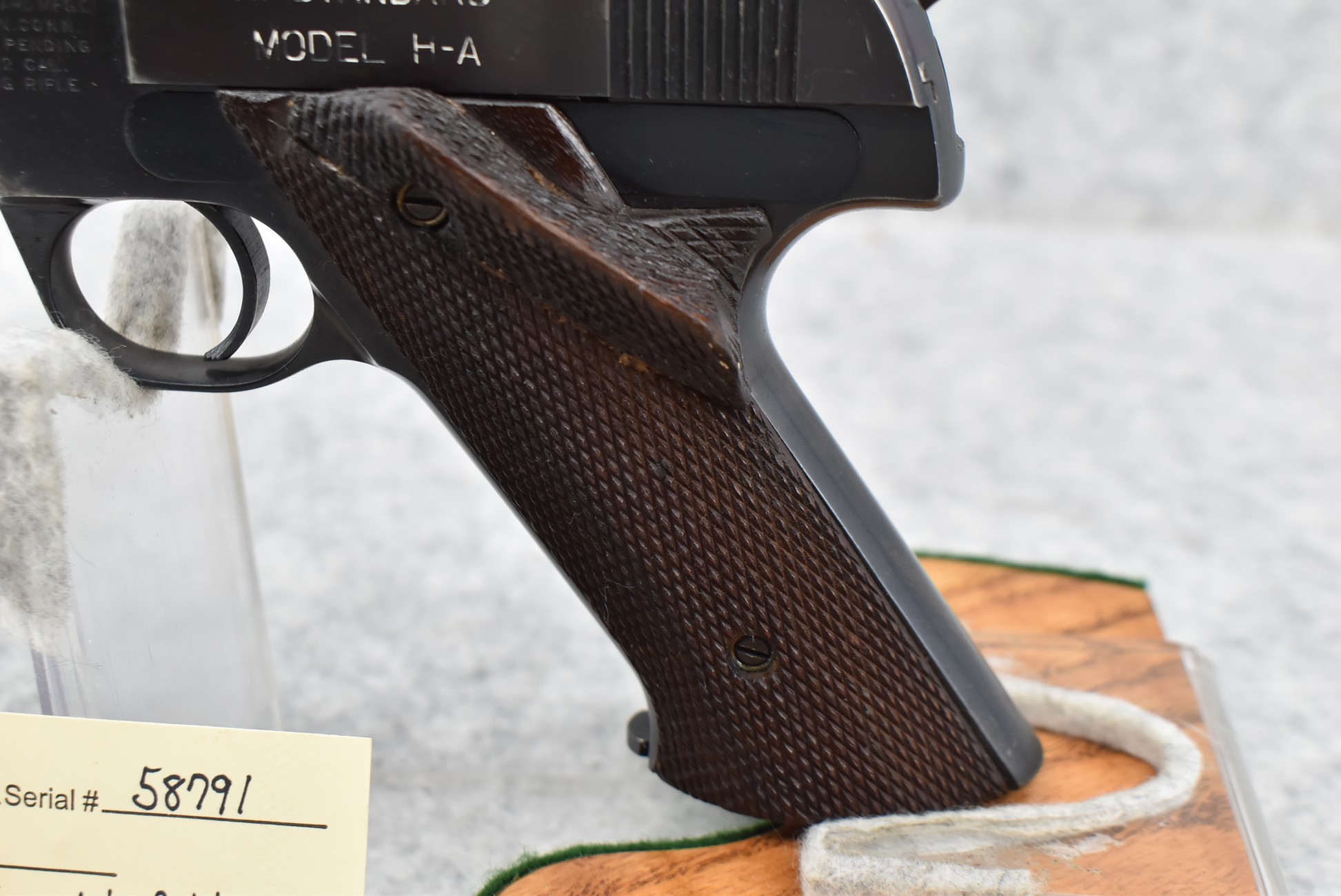 212R. Rare! Hi-Standard – Mod. H-A – 22 Long Rifle Cal. Semi-Auto Pistol – w/4 ½” Barrel w/Blade Front & Adj. Rear Sights – Blued Finish – w/Checkered Wood Grips – w/2 Factory Magazines – w/Extra Hammer – w/Hi-Standard Pistol Guide Book – Approx. Only 1,000 Mfg.!!