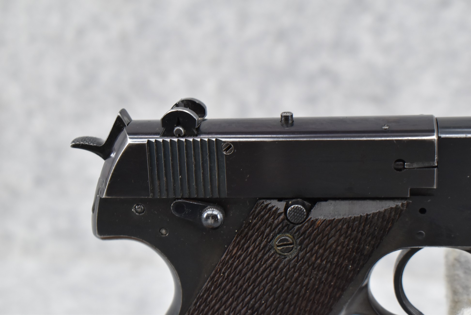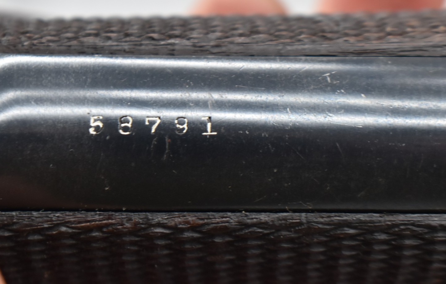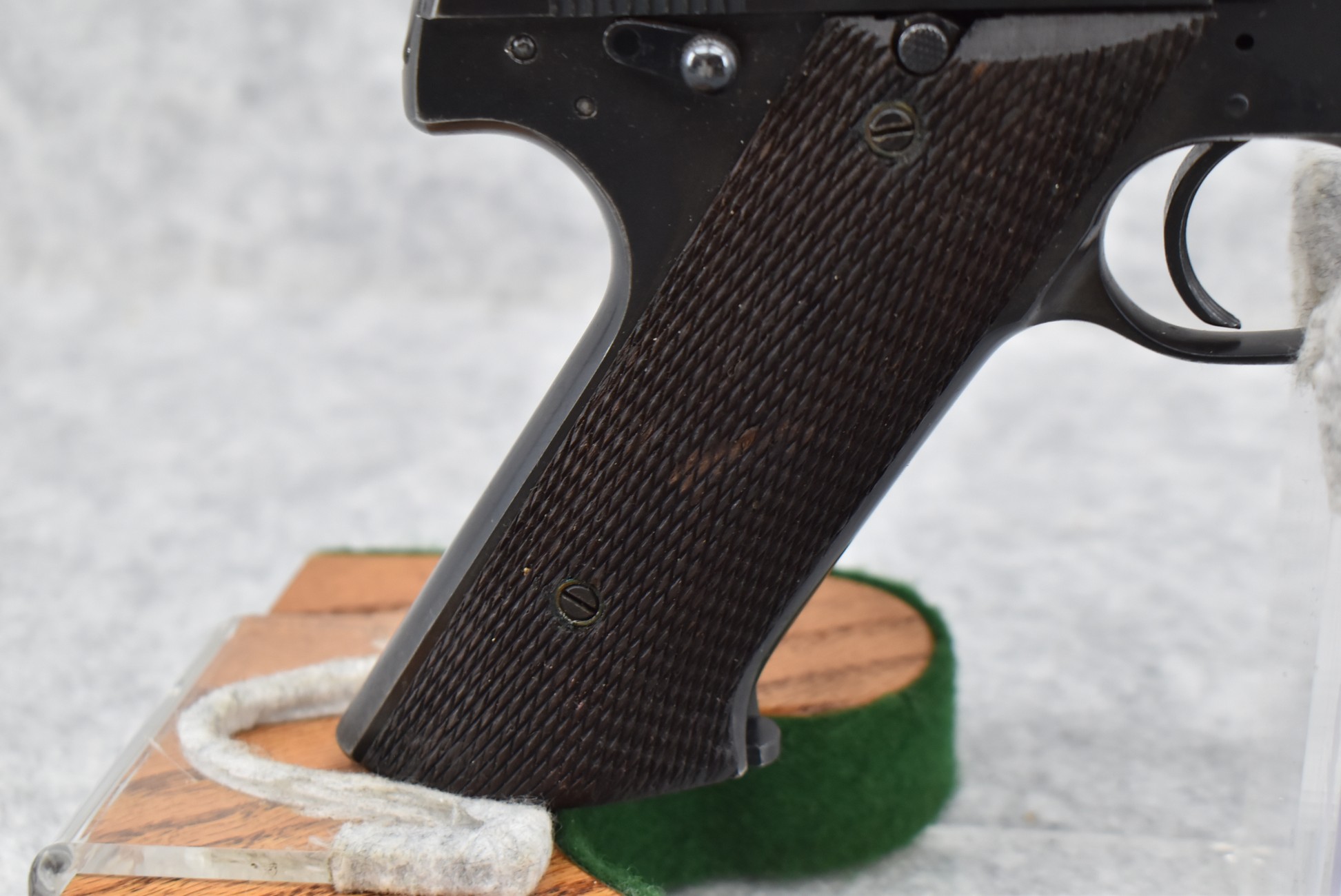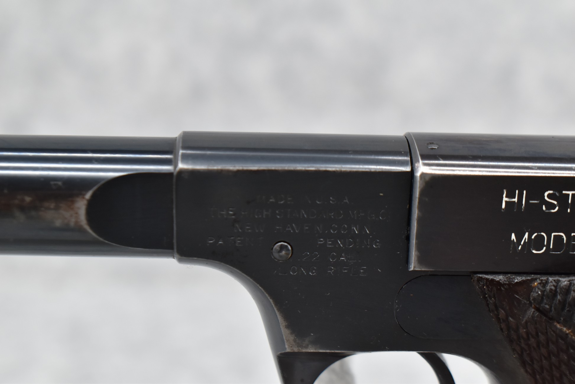 212R. Rare! Hi-Standard – Mod. H-A – 22 Long Rifle Cal. Semi-Auto Pistol – w/4 ½” Barrel w/Blade Front & Adj. Rear Sights – Blued Finish – w/Checkered Wood Grips – w/2 Factory Magazines – w/Extra Hammer – w/Hi-Standard Pistol Guide Book – Approx. Only 1,000 Mfg.!!