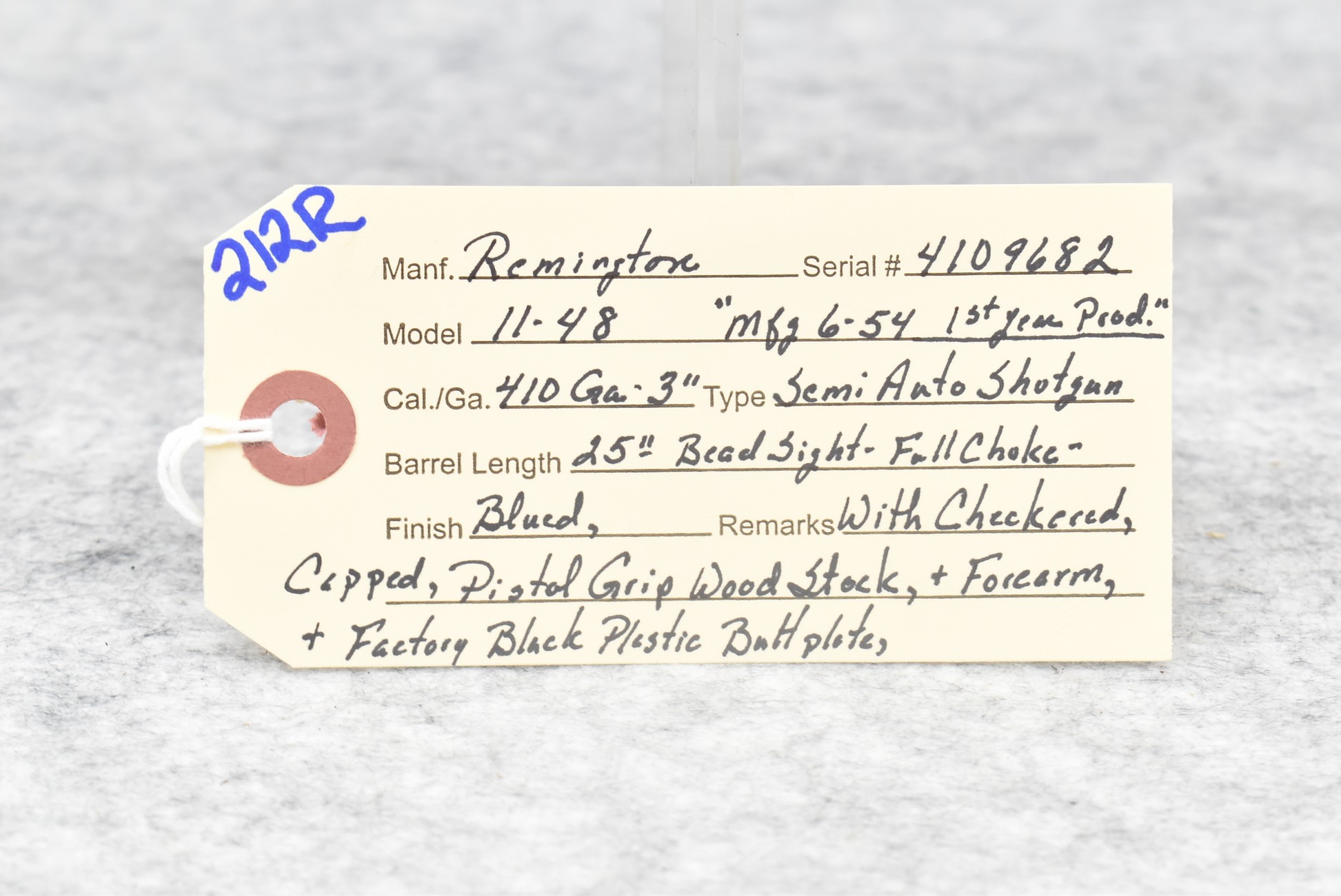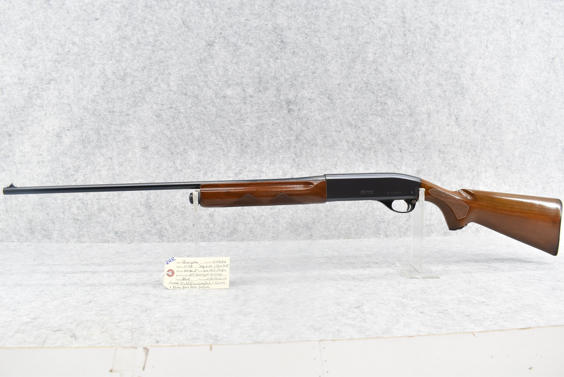 212R. Remington – Mod. 11-48 – 410ga. 3” Semi-Auto Shotgun – w/25” Full Choke Barrel w/Bead Sight – Blued Finish – w/Checkered Capped Pistol Grip Wood Stocks w/Factory Butt Plate – Mfg. 6/54