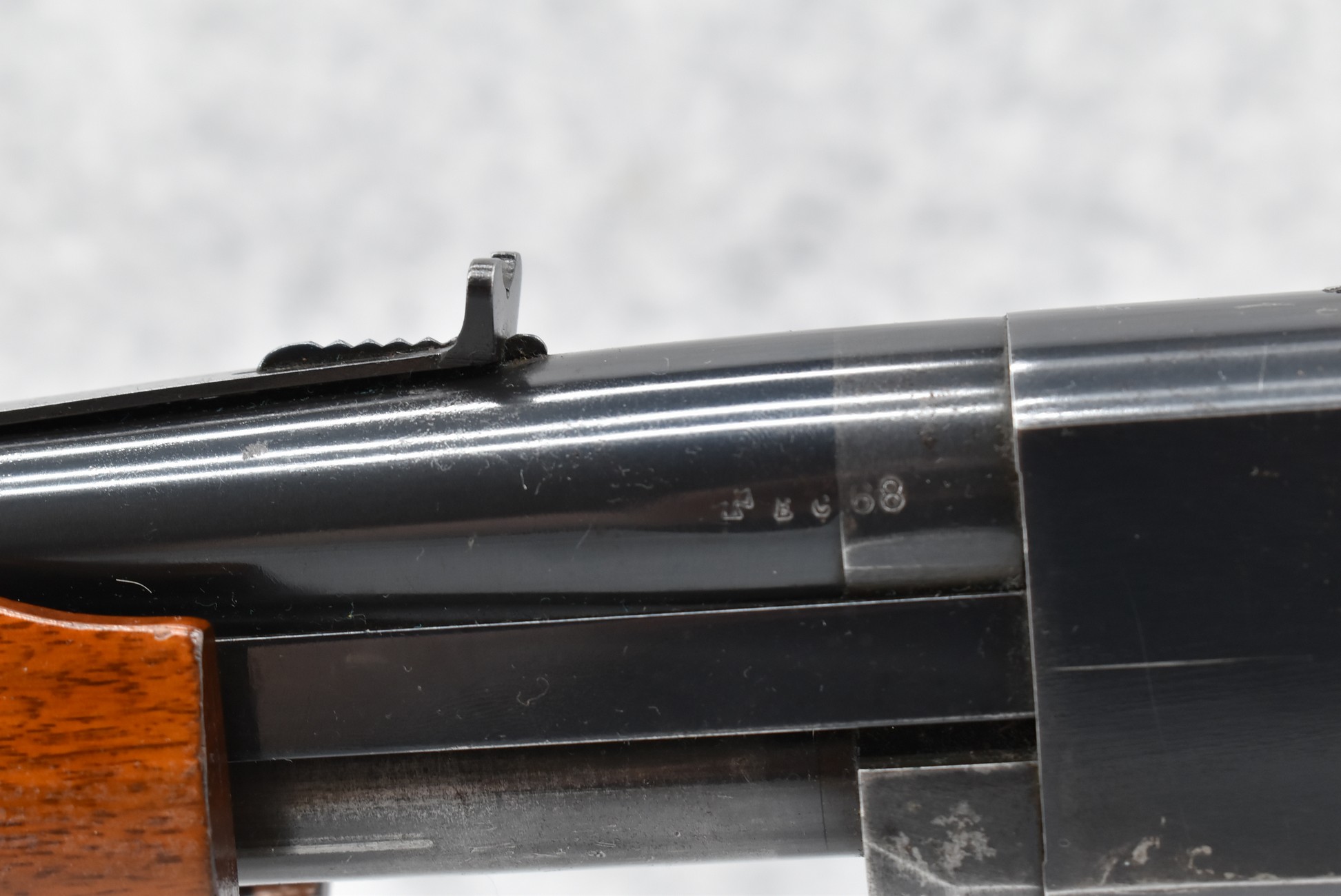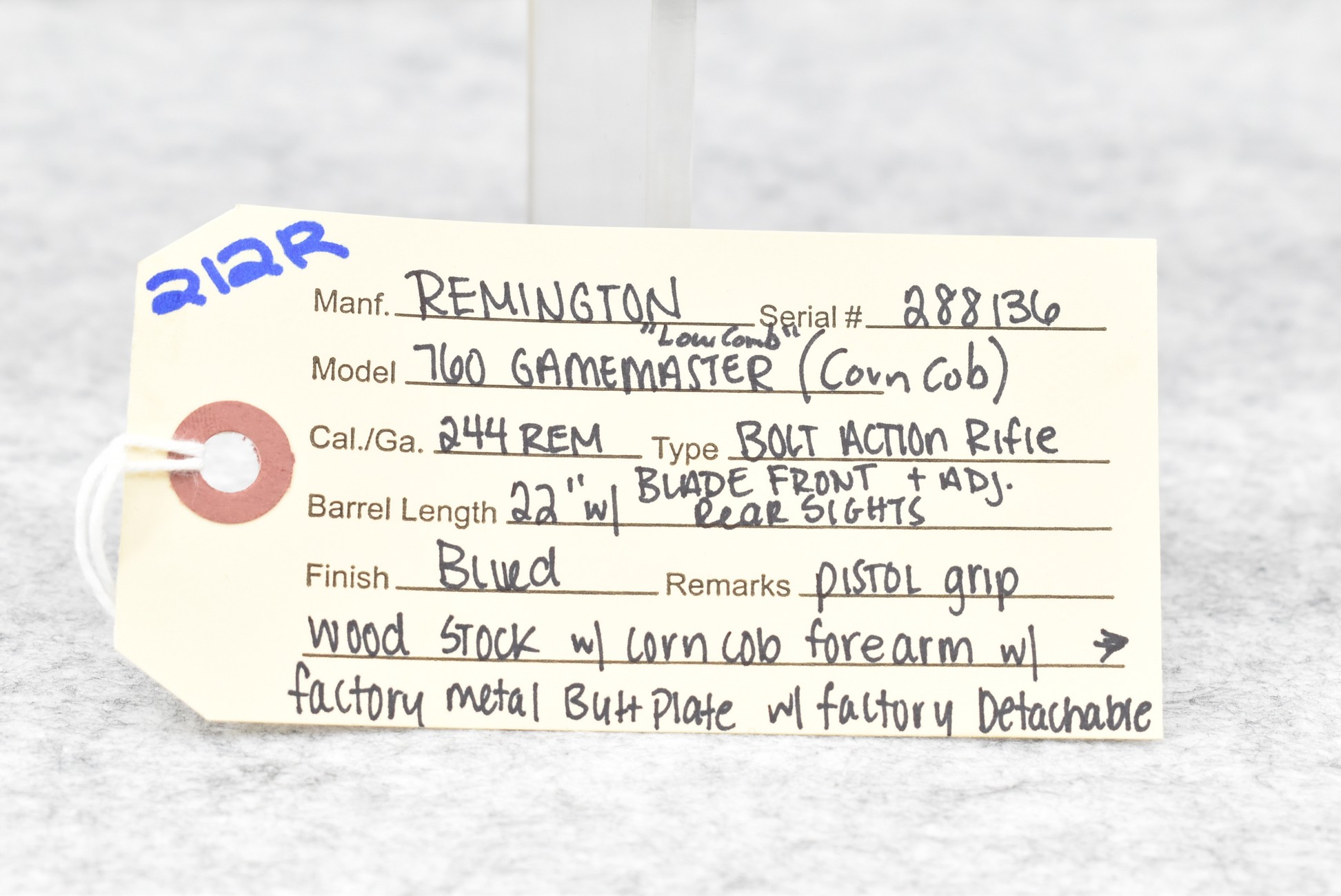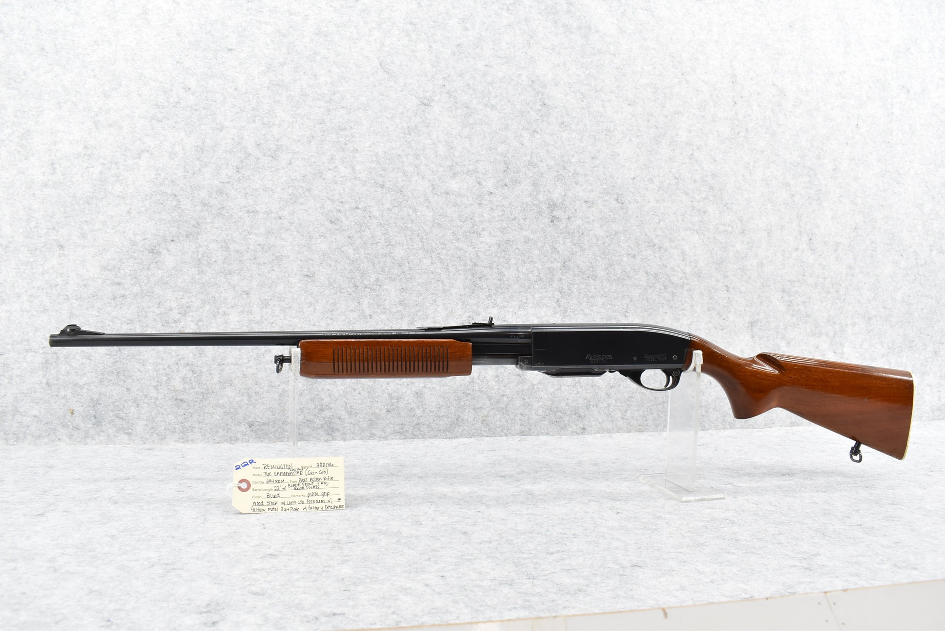 212R. Remington – Mod. 760 Gamemaster “Low Comb” (Corn Cob) – 244 Rem. Cal. Pump Action Rifle – w/22” Barrel w/Blade Front and Adjustable Rear Sights – Blued Finish – w/Pistol Grip Wood Stock and Corn Cob Forearm w/Factory Metal Butt Plate – w/Factory Detachable Magazine – Only 2,101 in 244 Rem. Were Manufactured in this Grade from 1956-1959 – Manufactured in October of 1956