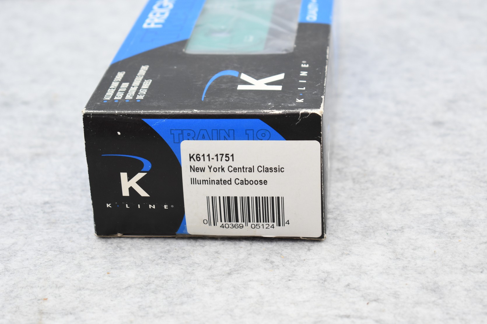 213.     Lot of 3 K-Line O gauge train cars including K611-1751 NYC classic illuminated caboose, K645-1932 Reading Express Reefer, K645-1932 Reading Express Reefer, all with boxes