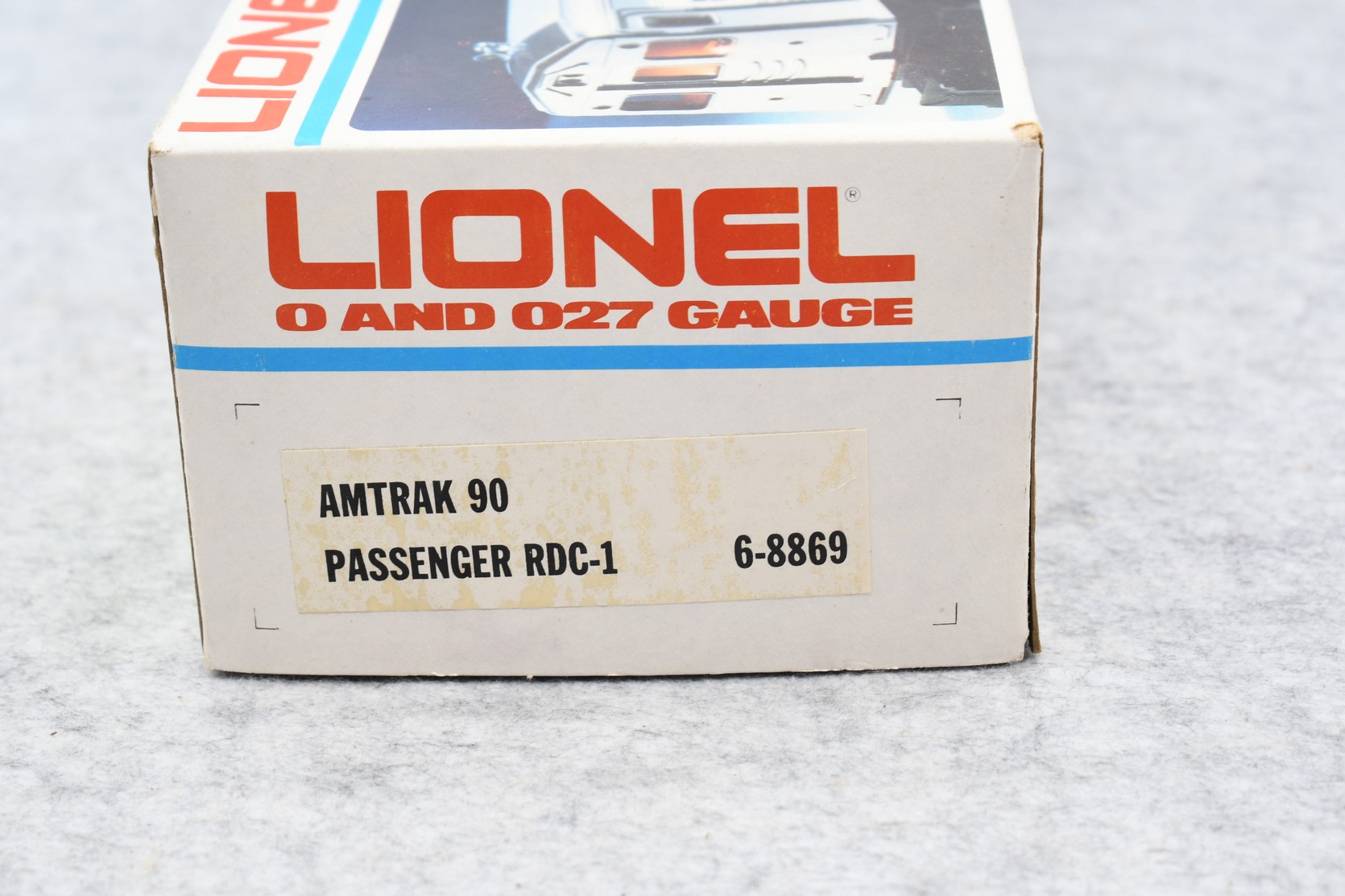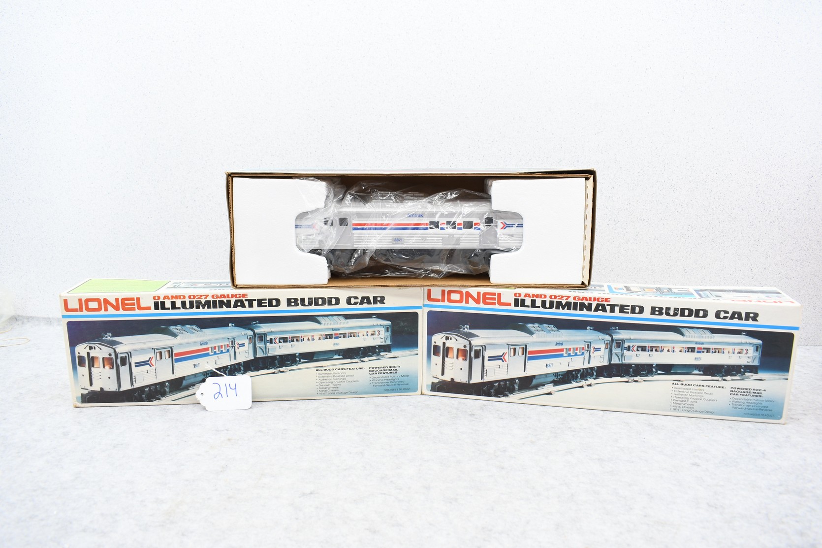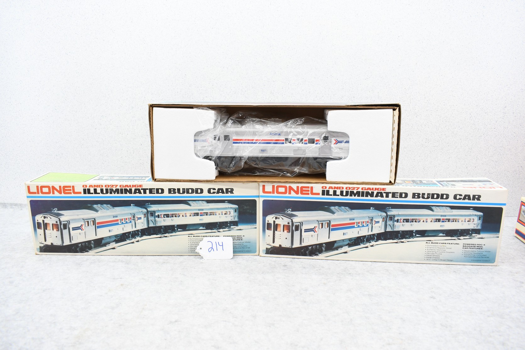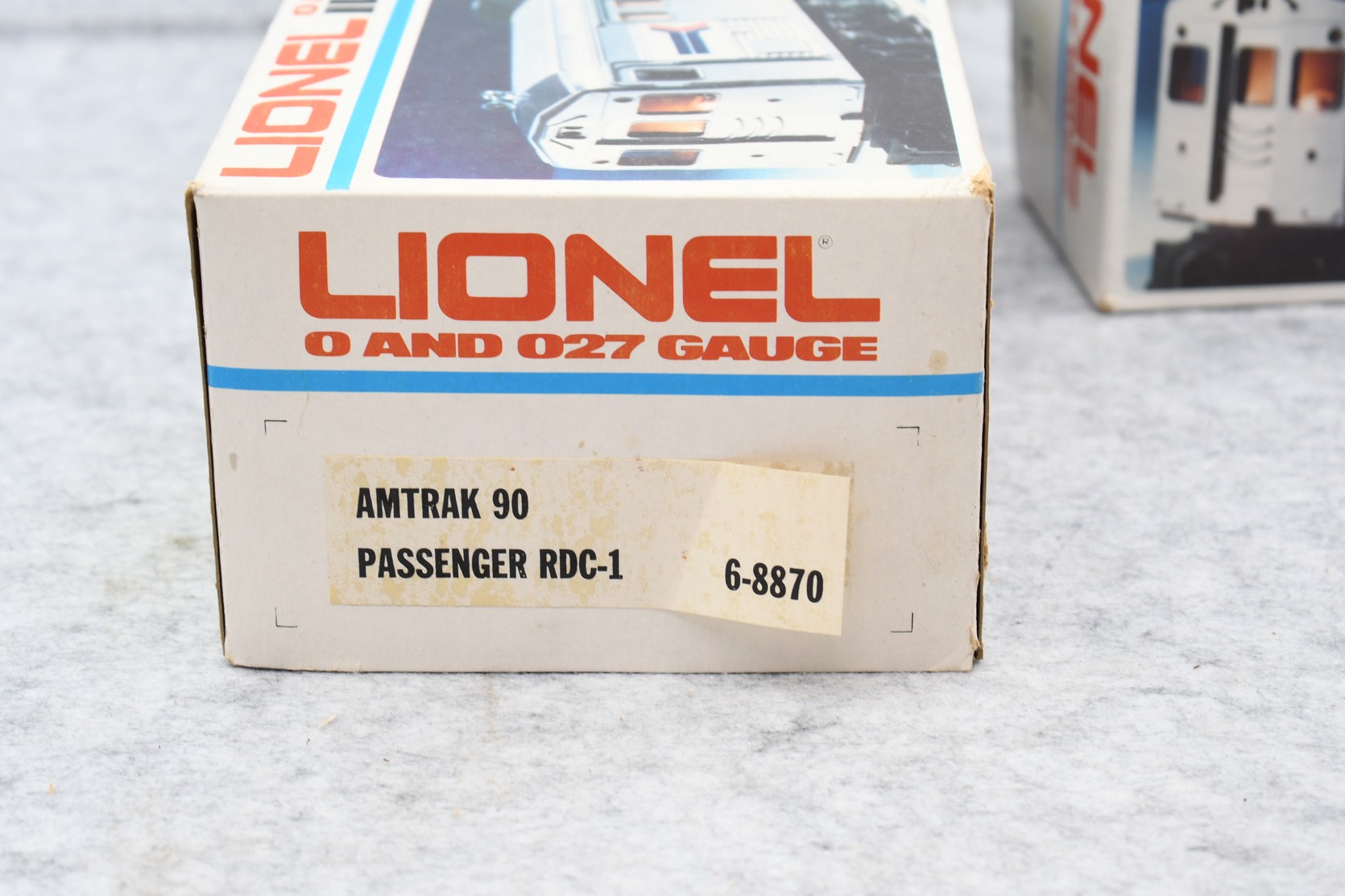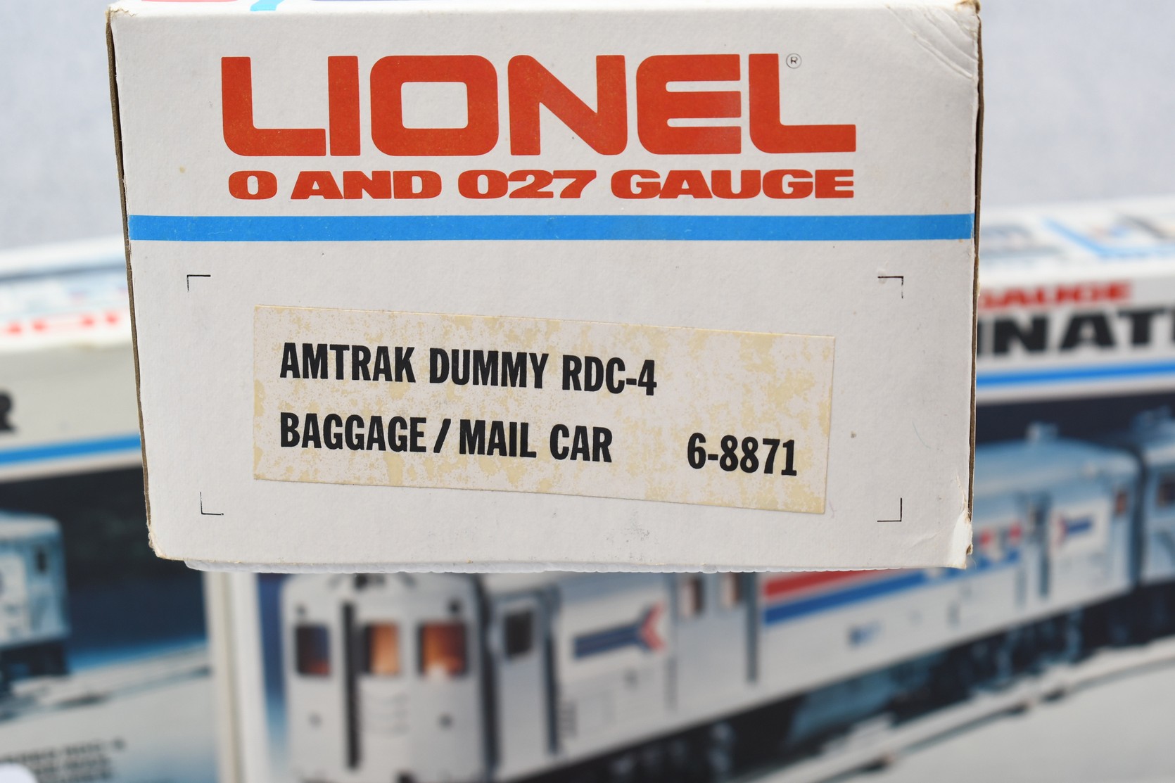 214. Lot of 3 Lionel O gauge Passenger cars including 6-8871 Amtrak Dummy RDC-4 Baggage/Mail car, 6-8870 Amtrak 90 Passenger RDC-1, 6-8869 Amtrak 90 Passenger RDC-1. All with boxes