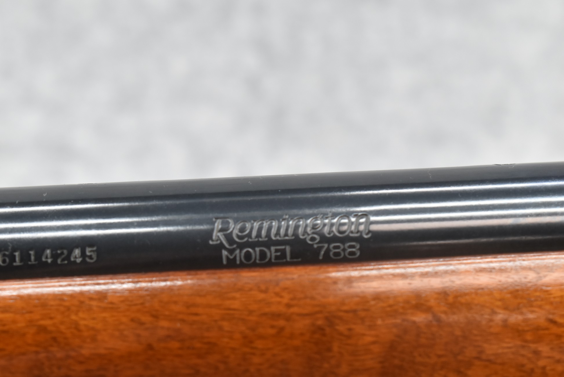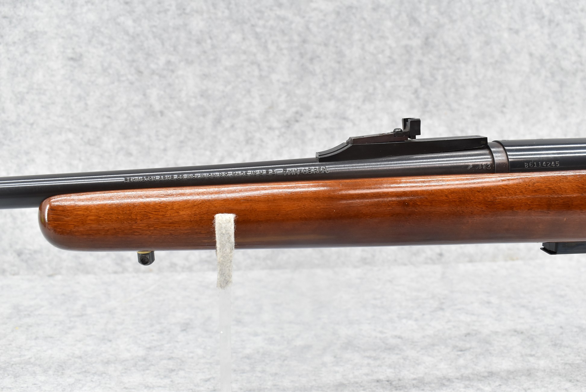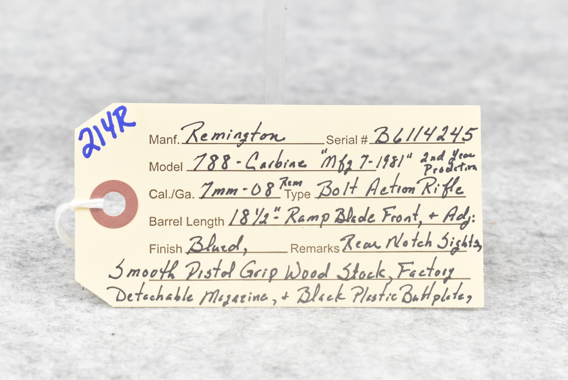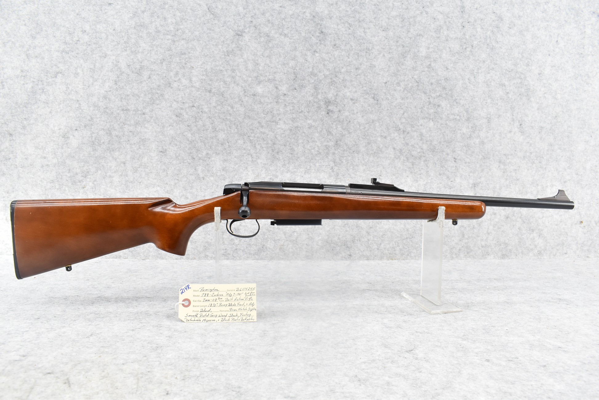 214R. Remington – Mod. 788 Carbine – 7mm-08 Rem. Cal. Bolt Action Rifle – w/18 ½” Barrel w/Ramp Blade Front & Adj. Rear Notch Sights – Blued Finish – w/Smooth Pistol Grip Wood Stock w/Factory Butt Plate – w/Factory Detachable Magazine – Mfg. 7/1981, 2nd Year of Production