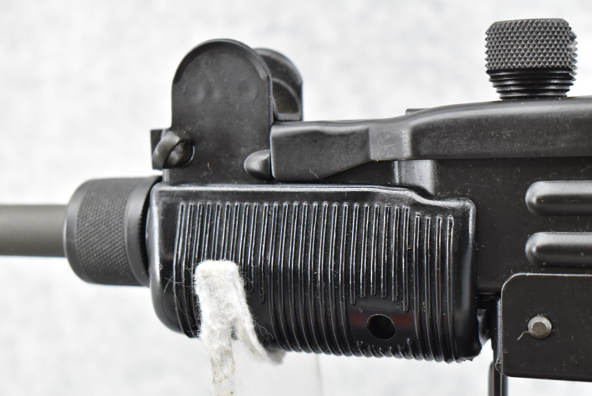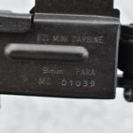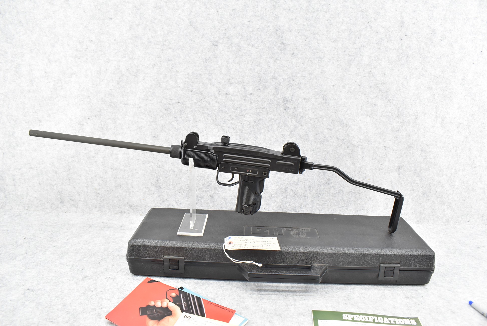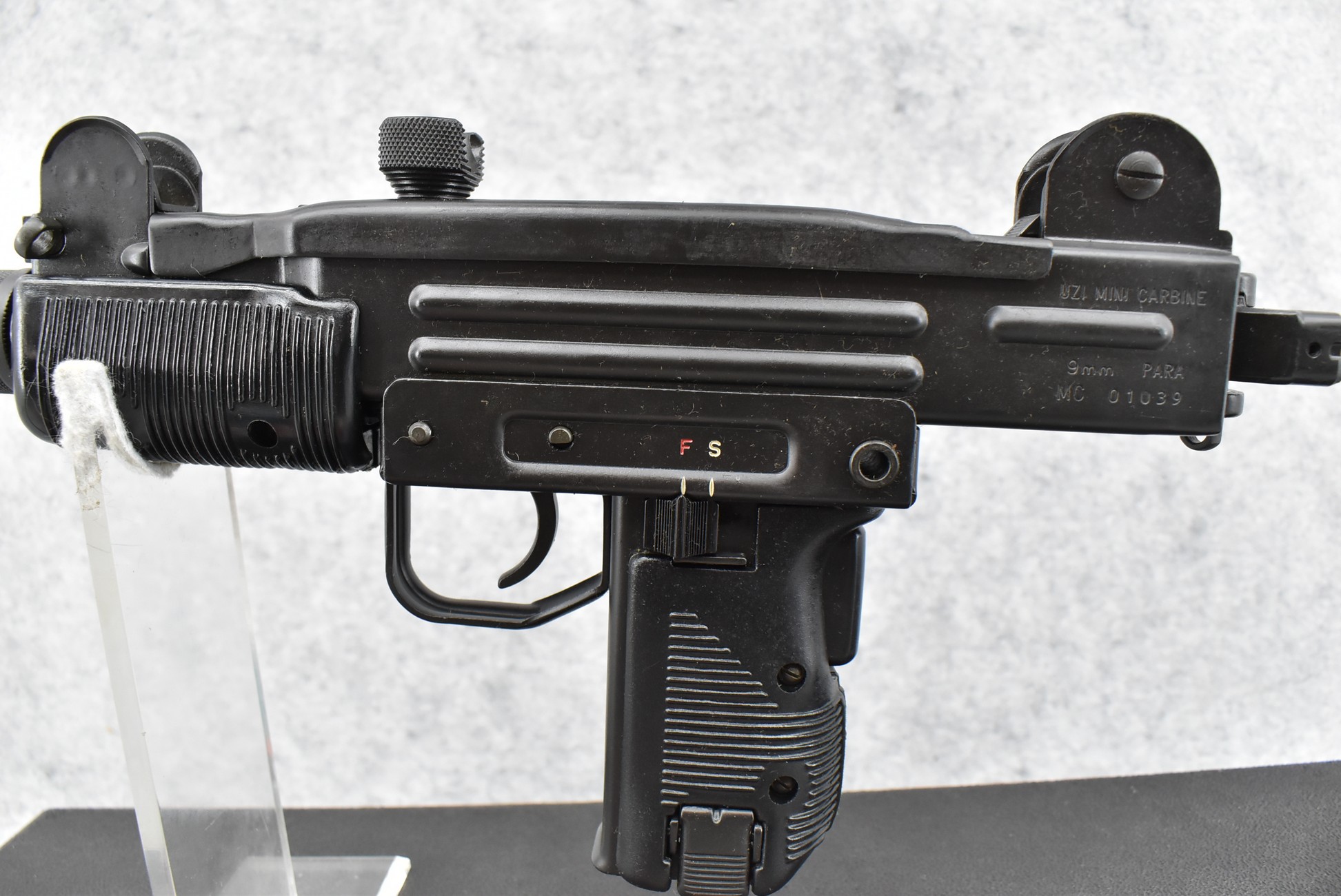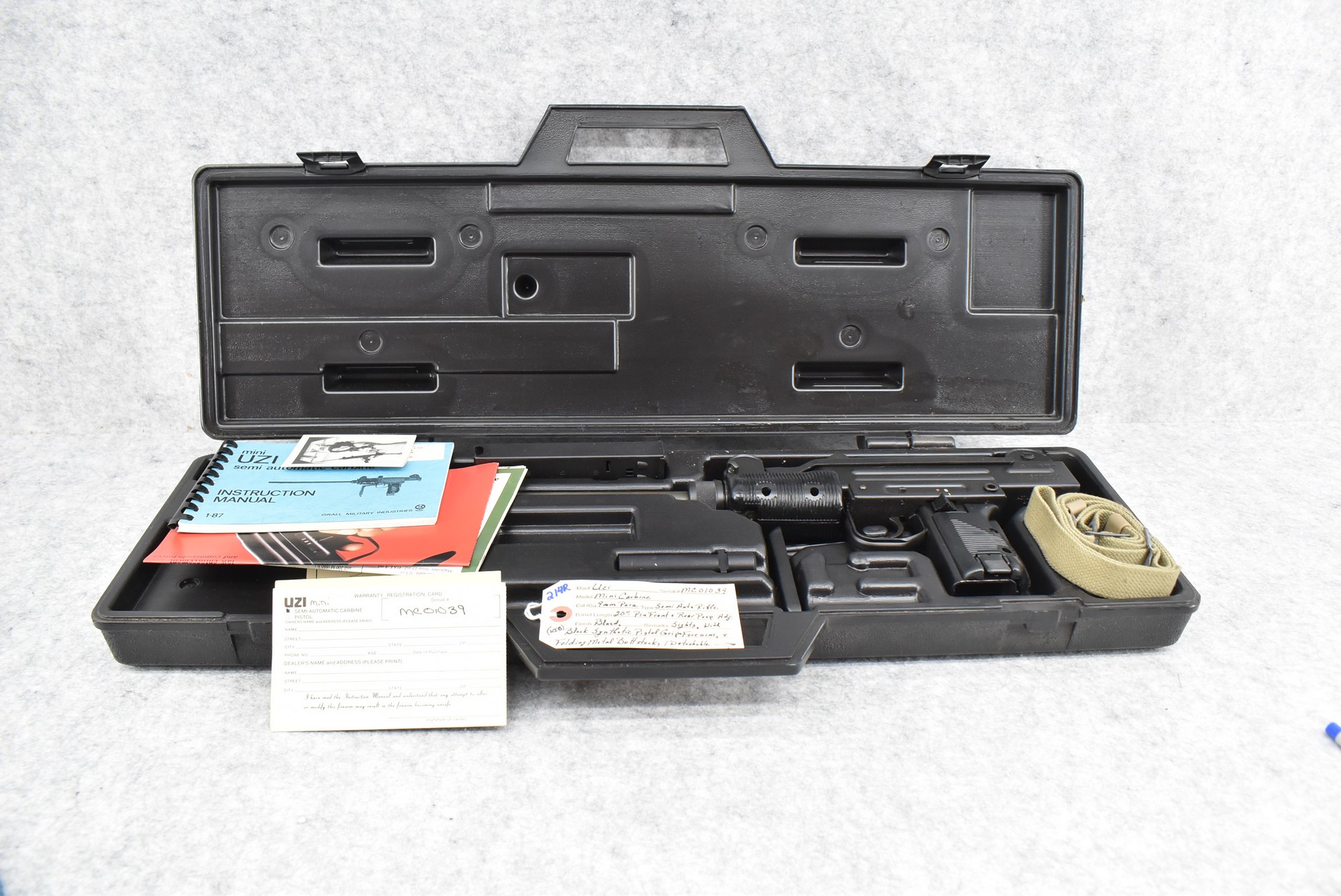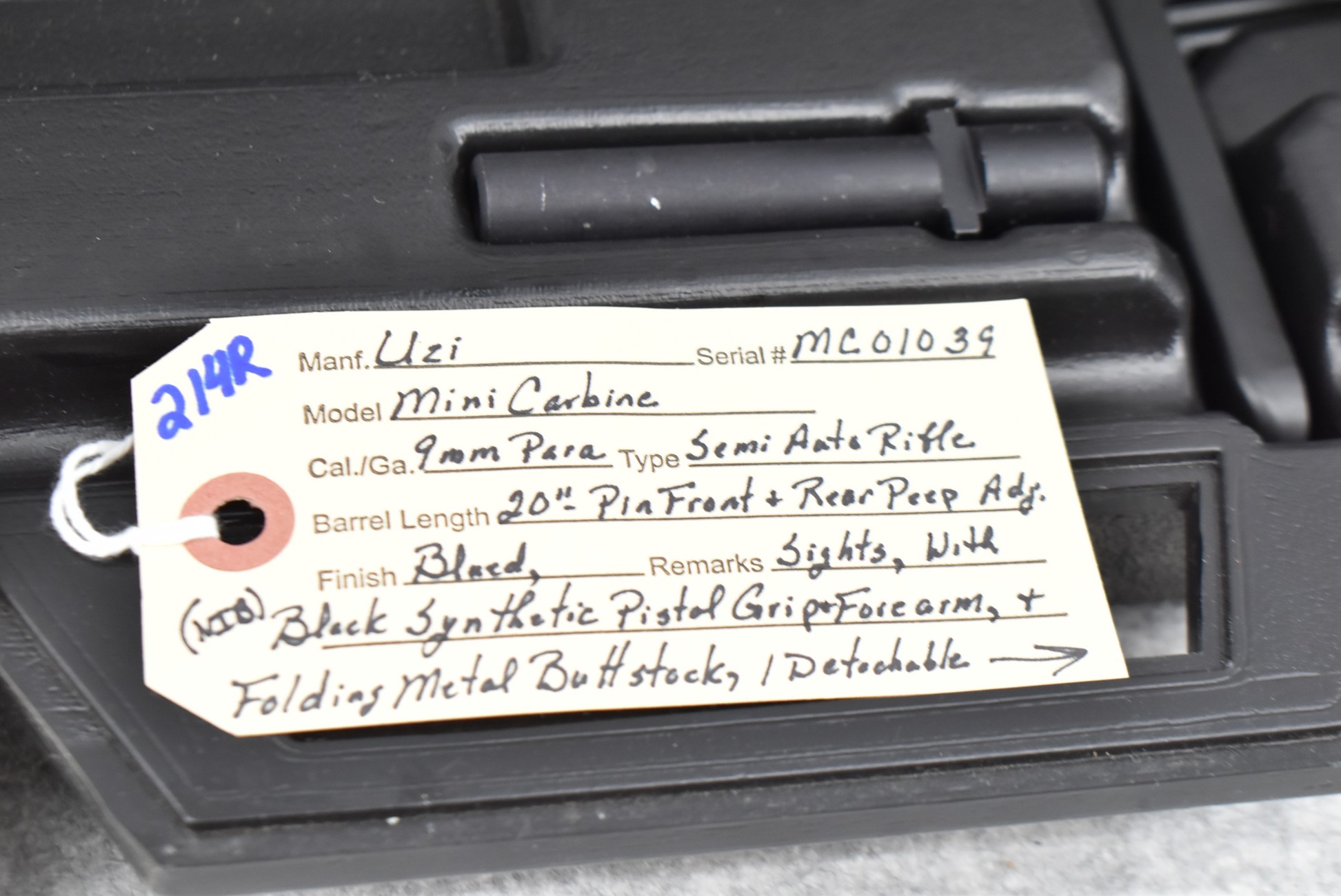 214R. UZI – Mod. Mini Carbine – 9mm Para Cal. Semi-Auto Rifle – w/20” Barrel w/Pin Front & Rear peep Adj. Sights – Blued Finish – w/Black Synthetic Pistol Grip & Forearm w/Folding Metal Butt Stock – w/Detachable Magazine – w/Sling – Unfired w/Factory Hard Case, Manuals & Dummy Barrel (CANNOT GO TO MARYLAND!)