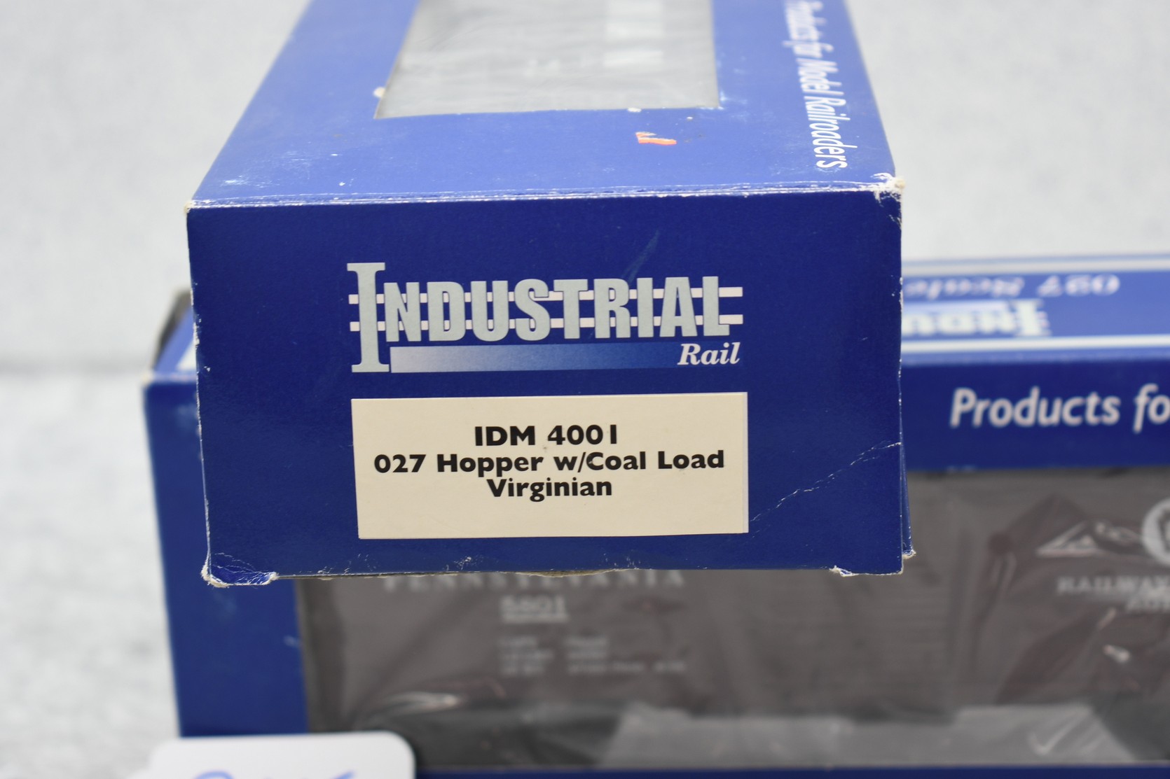 215. Pair of Industrial O gauge train cars including IDM1002 Pennsylvania Railroad boxcar, IDM 4001 Virginian Hopper car with coal load. Both NIB