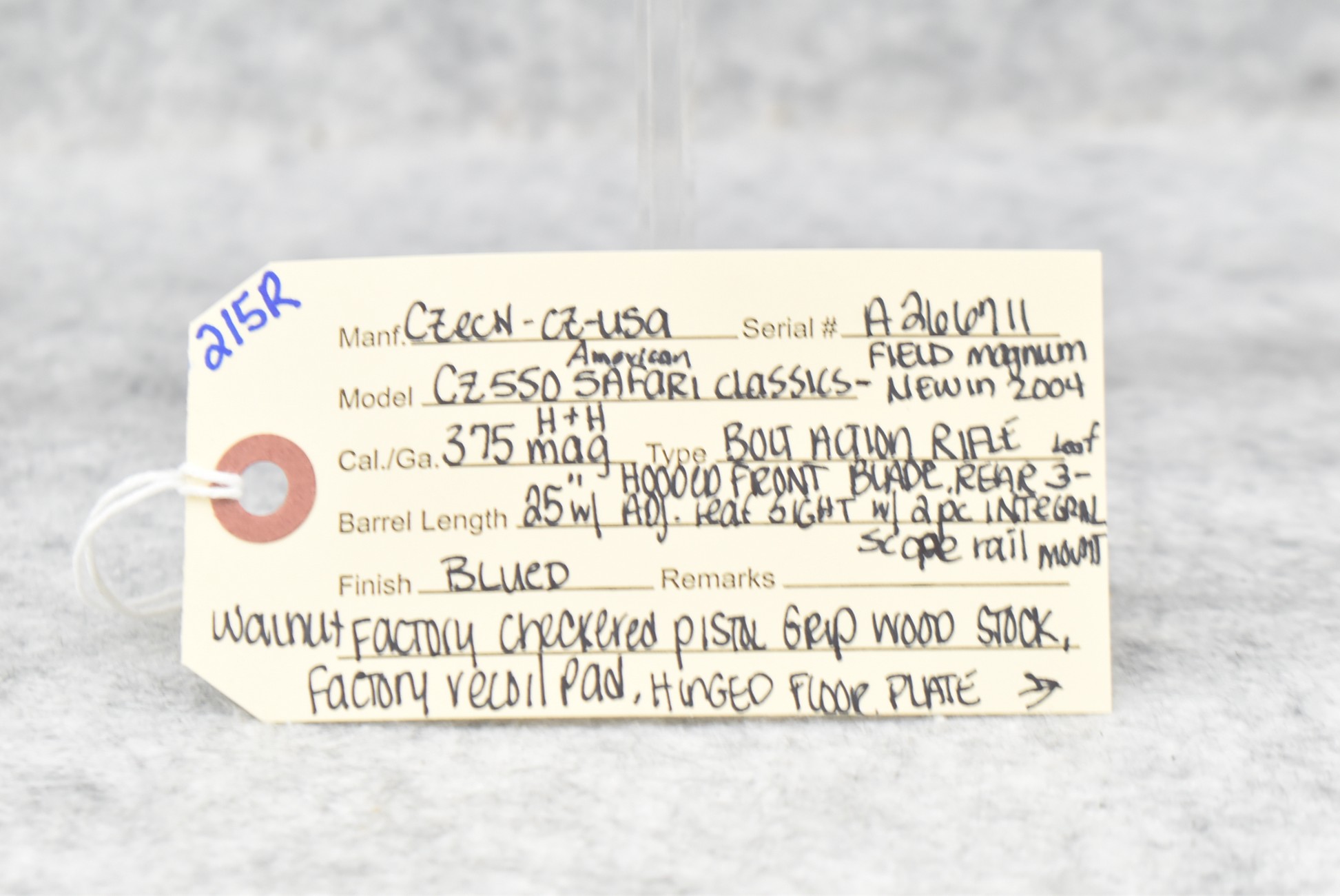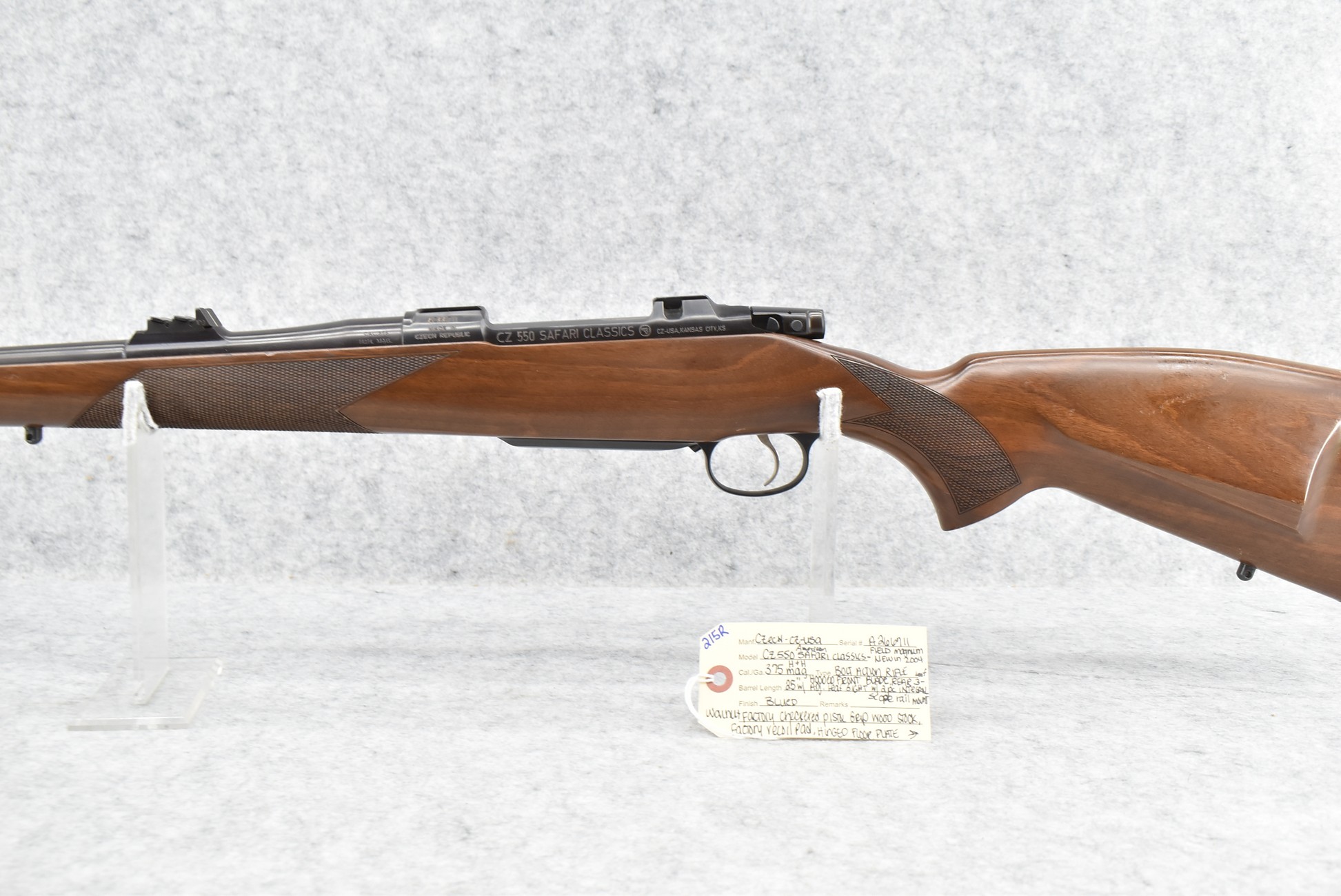215R.     Czech-CZ-USA – Mod. CZ550 American Safari Classics Field Magnum – 375 H&H Mag. Cal. Bolt Action Rifle – w/25” Barrel w/Hooded Blade Front and Adjustable 3-Leaf Express Rear Sights – Blued Finish – w/Walnut Factory Checkered Pistol Grip Wood Stock w/Factory Recoil Pad – w/Hinged Floor Plate – w/Single Set Trigger – w/2-Piece Integral Scope Rail Bases