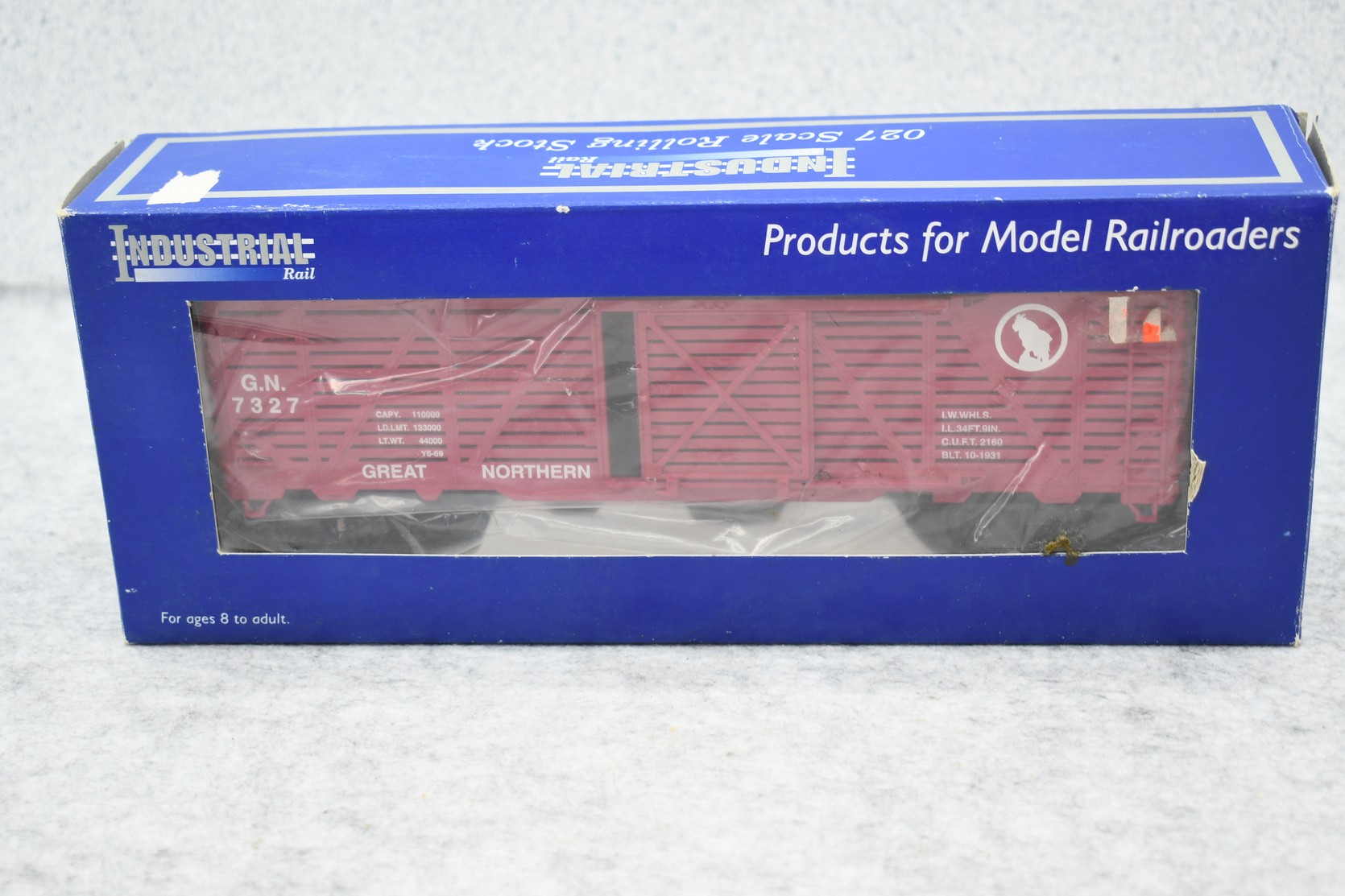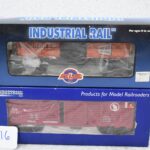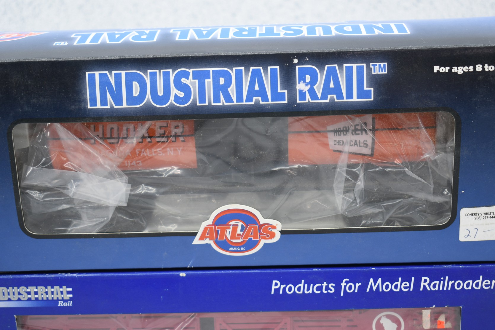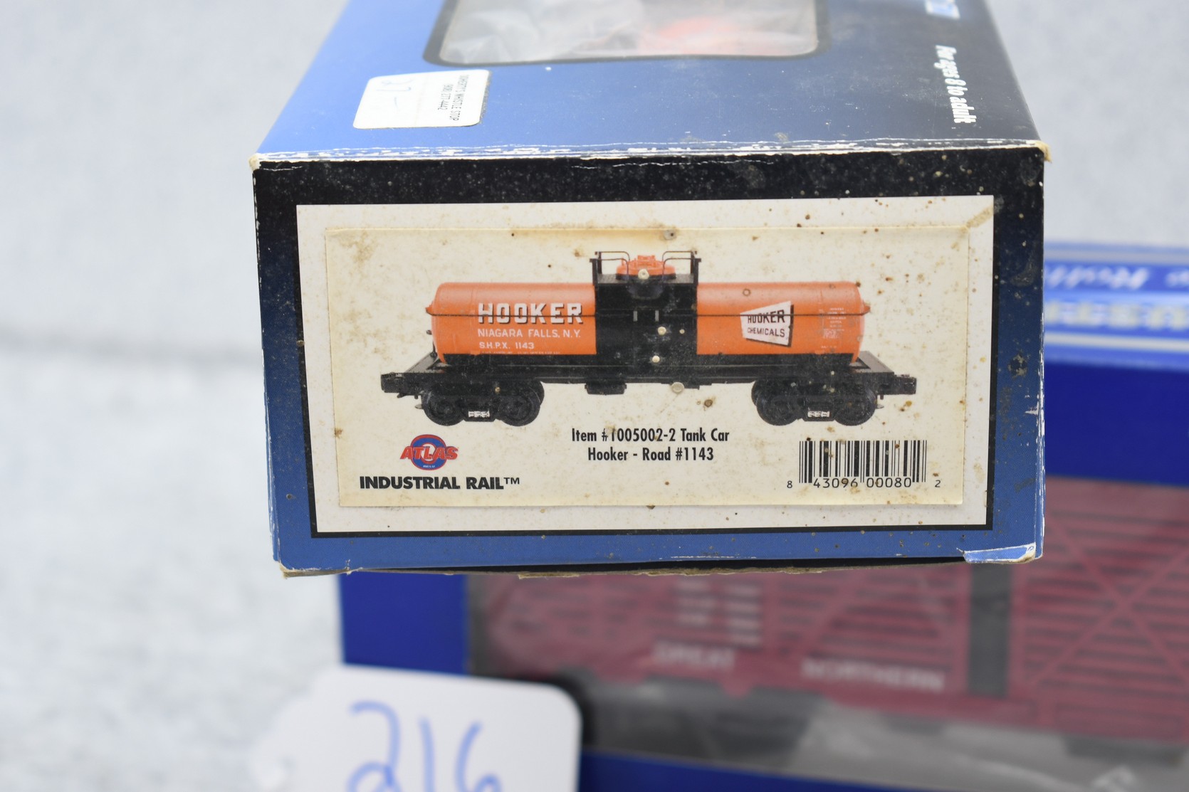 216. Pair of Industrial Rail O gauge train cars including IDM 3002 Great Northern rolling stock car, 1005002 two tank car (Hooker), both w/boxes