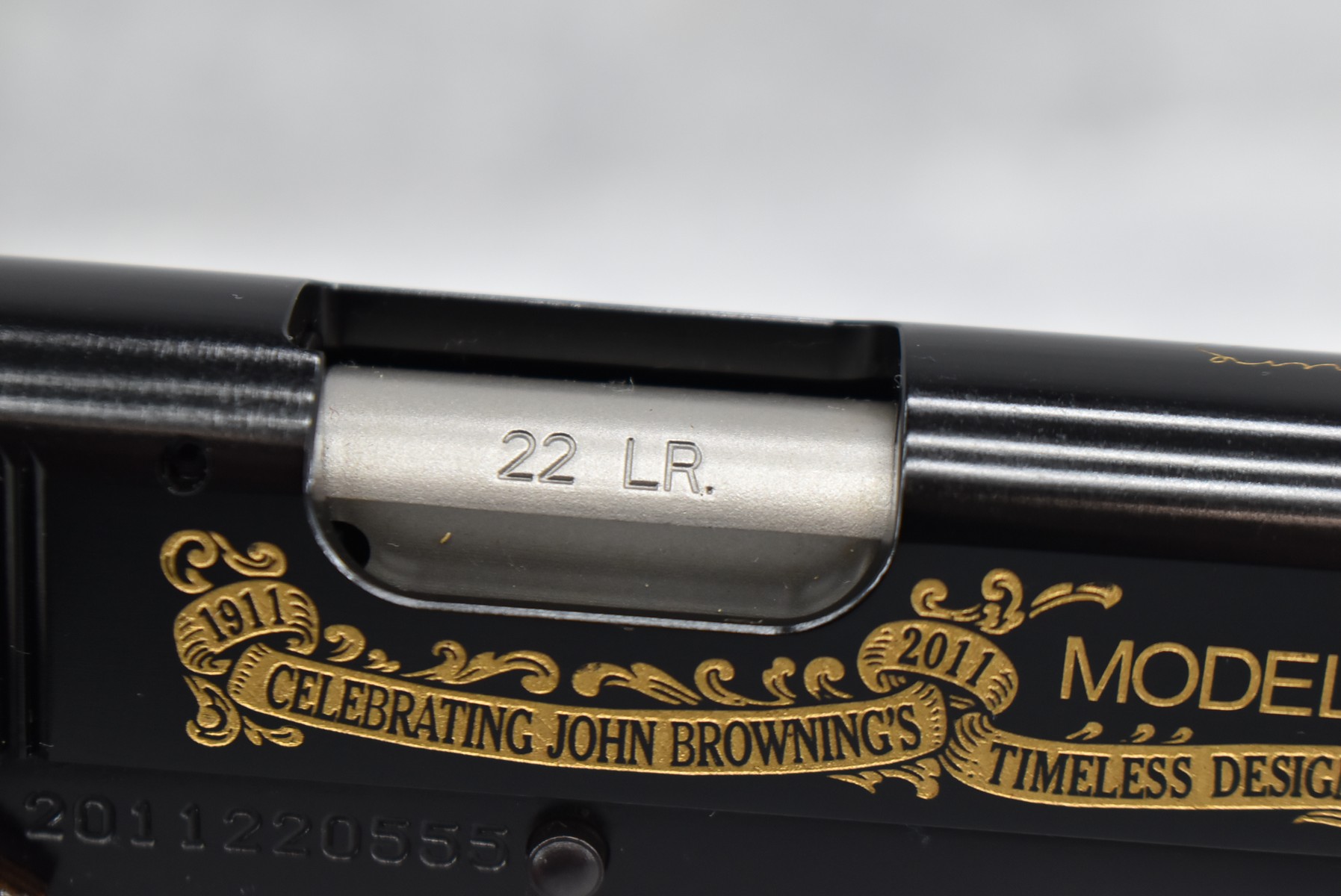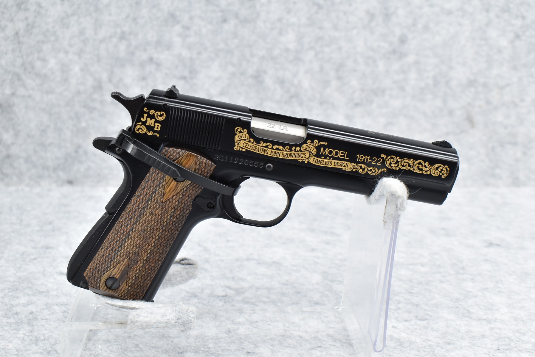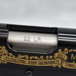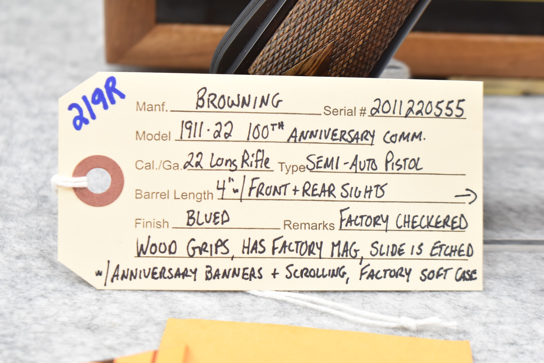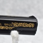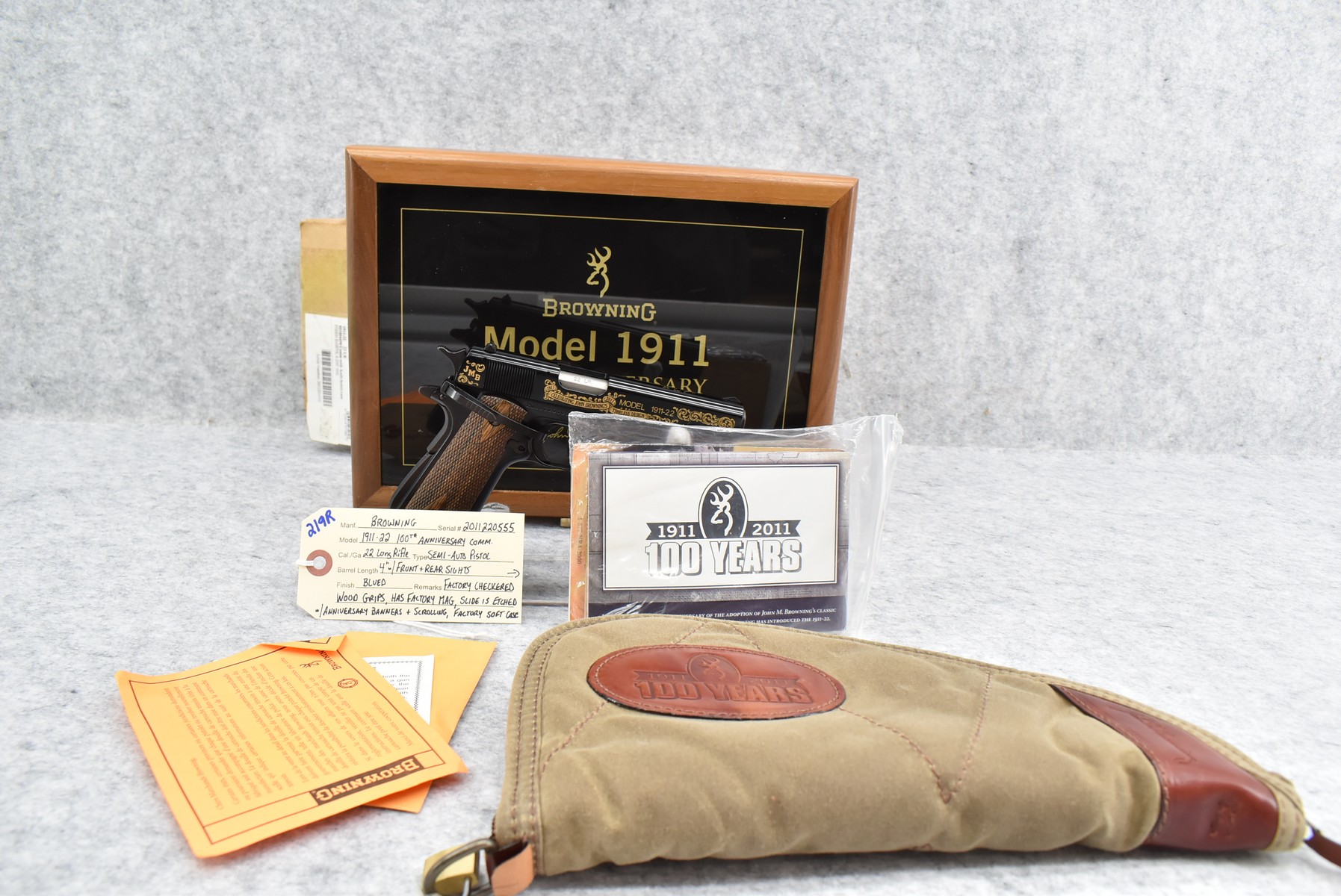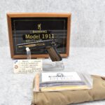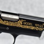 219R. Browning – Mod. 1911-22 – 100th Anniversary Commemorative – 22 Long Rifle Cal. Semi-Auto Pistol – w/4” Barrel w/Front & Rear Sights – Blued Finish – w/Factory Checkered Wood Grips – w/Factory Mag – Slide is Etched w/Anniversary Banners & Scrolling – w/Factory Soft Case, Manuals, Shipping Sleeve & Wooden Display Case, No Knife