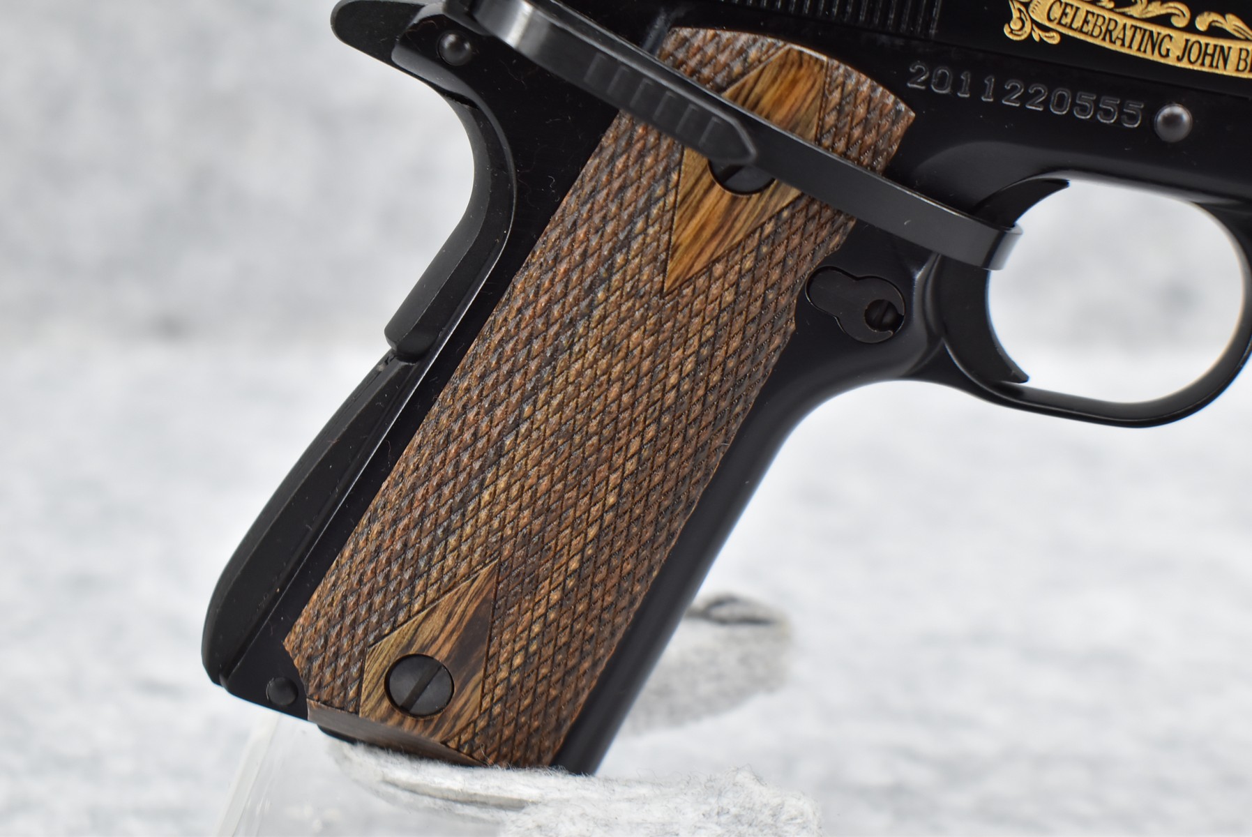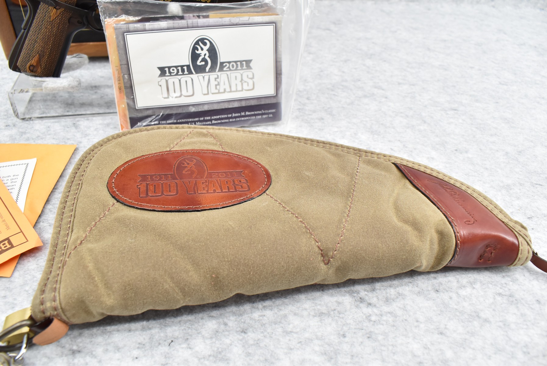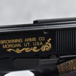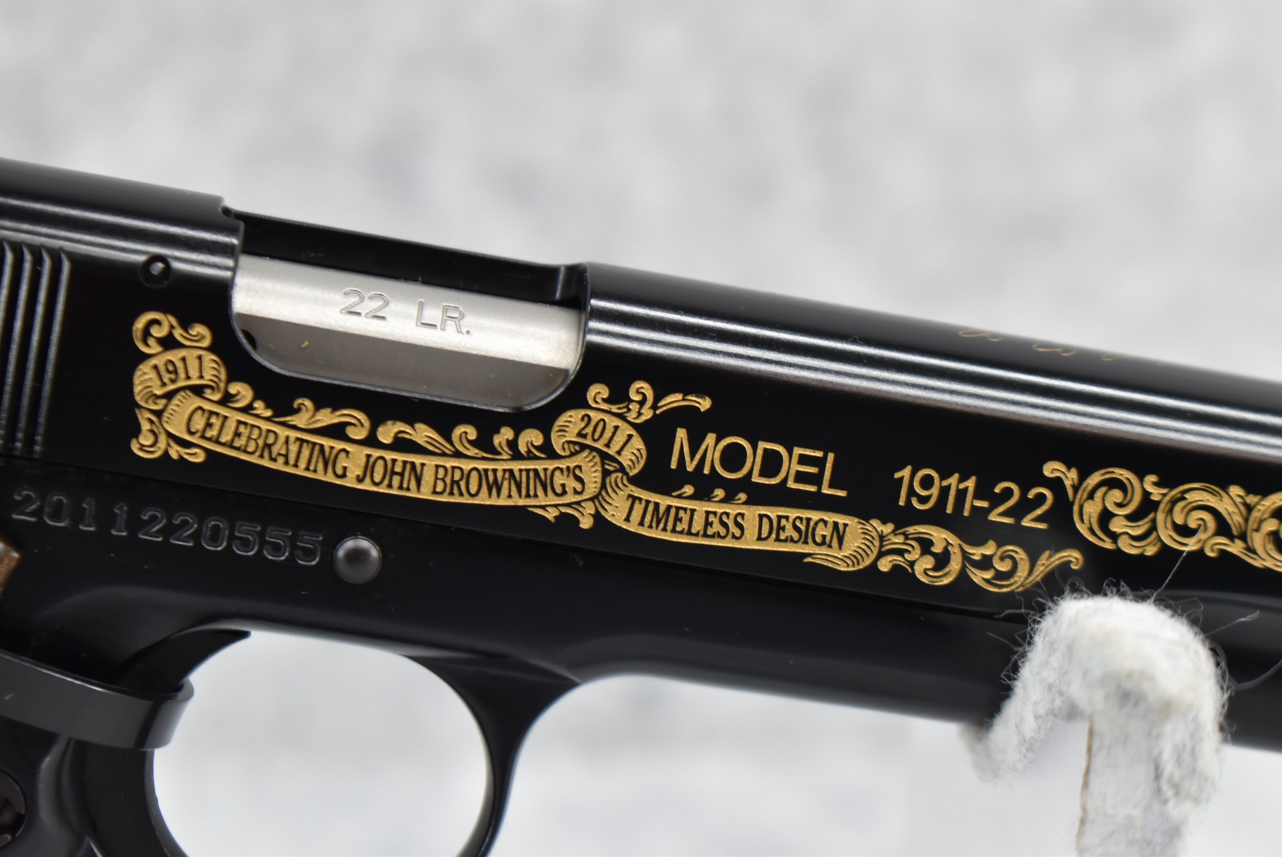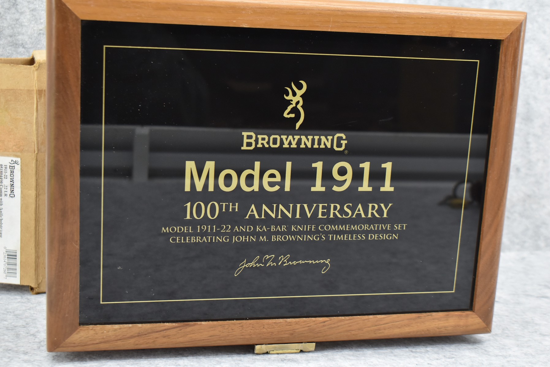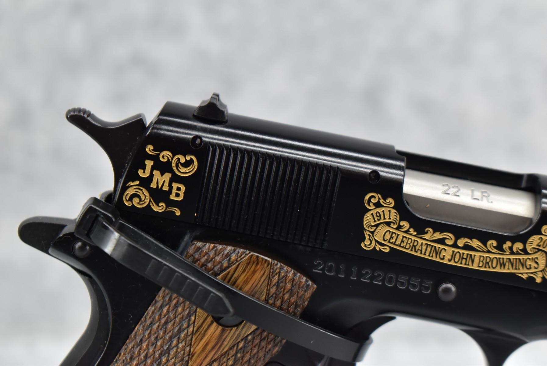 219R. Browning – Mod. 1911-22 – 100th Anniversary Commemorative – 22 Long Rifle Cal. Semi-Auto Pistol – w/4” Barrel w/Front & Rear Sights – Blued Finish – w/Factory Checkered Wood Grips – w/Factory Mag – Slide is Etched w/Anniversary Banners & Scrolling – w/Factory Soft Case, Manuals, Shipping Sleeve & Wooden Display Case, No Knife